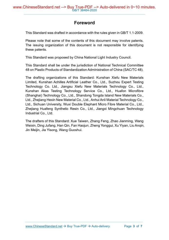 Similar standardsGB/T 38464-2020: Test method of artificial leather and synthetic leather - Determination of rubbing resistance---This is an excerpt. Full copy of true-PDF in English version (including equations, symbols, images, flow-chart, tables, and figures etc.), auto-downloaded/delivered in 9 seconds, can be purchased online: https://www.ChineseStandard.net/PDF.aspx/GBT38464-2020 NATIONAL STANDARD OF THE PEOPLE’S REPUBLIC OF CHINA ICS 59.080.40 Y 47 Test method of artificial leather and synthetic leather - Determination of rubbing resistance ISSUED ON: MARCH 06, 2020 IMPLEMENTED ON: OCTOBER 01, 2020 Issued by: State Administration for Market Regulation; Standardization Administration of the People’s Republic of China. Table of ContentsForeword ... 3 1 Scope ... 4 2 Normative references ... 4 3 Sample preparation ... 4 4 Test method ... 5 5 Test report ... 6ForewordThis Standard was drafted in accordance with the rules given in GB/T 1.1-2009. Please note that some of the contents of this document may involve patents. The issuing organization of this document is not responsible for identifying these patents. This Standard was proposed by China National Light Industry Council. This Standard shall be under the jurisdiction of National Technical Committee 48 on Plastic Products of Standardization Administration of China (SAC/TC 48). The drafting organizations of this Standard: Kunshan Xiefu New Materials Limited, Kunshan Achilles Artificial Leather Co., Ltd., Suzhou Expert Testing Technology Co. Ltd., Jiangsu Xiefu New Materials Technology Co., Ltd., Kunshan Akas Testing Technology Service Co., Ltd., Huafon Microfibre (Shanghai) Technology Co., Ltd., Shandong Tongda Island New Materials Co., Ltd., Zhejiang Hexin New Material Co., Ltd., Anhui Anli Material Technology Co., Ltd., Sichuan University, Wuxi Double Elephant Micro Fibre Material Co., Ltd., Zhejiang Huafeng Synthetic Resin Co., Ltd., Jiangxi Mingchuan Technology Industrial Co., Ltd. The drafters of this Standard: Xue Taiwen, Zhang Feng, Zhao Jianming, Wang Weixin, Ding Jufang, Han Qin, Fan Haojun, Zheng Yonggui, Xu Yiyan, Liu Anqin, Jin Meijin, Jia Yisong, Wang Guoshui. Test method of artificial leather and synthetic leather - Determination of rubbing resistance1 ScopeThis Standard stipulates the sample preparation, test method and test report for the determination of the rubbing resistance of artificial leather and synthetic leather. This Standard applies to the determination of the rubbing resistance of artificial leather, synthetic leather and finished products.2 Normative referencesThe following documents are indispensable for the application of this document. For dated references, only the dated version applies to this document. For undated references, the latest edition (including all amendments) applies to this document. GB/T 2918-2018, Plastics - Standard atmospheres for conditioning and testing3 Sample preparation3.1 Requirements The surface of the sample shall be flat, smooth, and free of flaws, such as cracks, bubbles, pinholes, that affect the performance of the material. The samples shall be evenly distributed and sampled across the width of the whole product. 3.2 State adjustment According to the requirements of GB/T 2918-2018, under the environment where the temperature is (23 ± 2) °C and the relative humidity is (50 ± 10) %, after the sample condition is adjusted not less than 24 h, perform the test under this condition. 3.3 Sample cutting Sample size and quantity: the length is (120 ± 2) mm; the width is (30 ± 0.3) mm. Respectively cut 2 pieces vertically and horizontally. ......Source: Above contents are excerpted from the full-copy PDF -- translated/reviewed by: www.ChineseStandard.net / Wayne Zheng et al. Tips & Frequently Asked Questions:Question 1: How long will the true-PDF of English version of GB/T 38464-2020 be delivered?Answer: The full copy PDF of English version of GB/T 38464-2020 can be downloaded in 9 seconds, and it will also be emailed to you in 9 seconds (double mechanisms to ensure the delivery reliably), with PDF-invoice.Question 2: Can I share the purchased PDF of GB/T 38464-2020_English with my colleagues?Answer: Yes. The purchased PDF of GB/T 38464-2020_English will be deemed to be sold to your employer/organization who actually paid for it, including your colleagues and your employer's intranet.Question 3: Does the price include tax/VAT?Answer: Yes. Our tax invoice, downloaded/delivered in 9 seconds, includes all tax/VAT and complies with 100+ countries' tax regulations (tax exempted in 100+ countries) -- See Avoidance of Double Taxation Agreements (DTAs): List of DTAs signed between Singapore and 100+ countriesQuestion 4: Do you accept my currency other than USD?Answer: Yes. www.ChineseStandard.us -- GB/T 38464-2020 -- Click this link and select your country/currency to pay, the exact amount in your currency will be printed on the invoice. Full PDF will also be downloaded/emailed in 9 seconds.How to buy and download a true PDF of English version of GB/T 38464-2020?A step-by-step guide to download PDF of GB/T 38464-2020_EnglishStep 1: Visit website https://www.ChineseStandard.net (Pay in USD), or https://www.ChineseStandard.us (Pay in any currencies such as Euro, KRW, JPY, AUD).Step 2: Search keyword "GB/T 38464-2020". Step 3: Click "Add to Cart". If multiple PDFs are required, repeat steps 2 and 3 to add up to 12 PDFs to cart. Step 4: Select payment option (Via payment agents Stripe or PayPal). Step 5: Customize Tax Invoice -- Fill up your email etc. Step 6: Click "Checkout". Step 7: Make payment by credit card, PayPal, Google Pay etc. After the payment is completed and in 9 seconds, you will receive 2 emails attached with the purchased PDFs and PDF-invoice, respectively. Step 8: Optional -- Go to download PDF. Step 9: Optional -- Click Open/Download PDF to download PDFs and invoice. See screenshots for above steps: Steps 1~3 Steps 4~6 Step 7 Step 8 Step 9 |