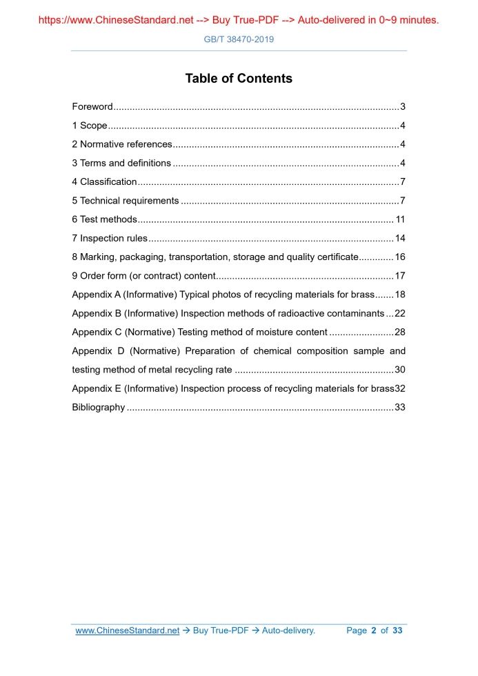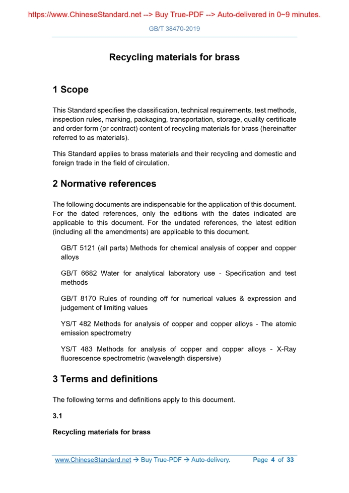 Similar standardsGB/T 38470-2019: Recycling materials for brass---This is an excerpt. Full copy of true-PDF in English version (including equations, symbols, images, flow-chart, tables, and figures etc.), auto-downloaded/delivered in 9 seconds, can be purchased online: https://www.ChineseStandard.net/PDF.aspx/GBT38470-2019GB NATIONAL STANDARD OF THE PEOPLE’S REPUBLIC OF CHINA ICS 77.150.30 H 62 Recycling materials for brass Issued on: DECEMBER 31, 2019 Implemented on: JULY 01, 2020 Issued by. State Administration for Market Regulation; Standardization Administration of the PRC. Table of ContentsForeword... 3 1 Scope... 4 2 Normative references... 4 3 Terms and definitions... 4 4 Classification... 7 5 Technical requirements... 7 6 Test methods... 11 7 Inspection rules... 14 8 Marking, packaging, transportation, storage and quality certificate... 16 9 Order form (or contract) content... 17 Appendix A (Informative) Typical photos of recycling materials for brass... 18 Appendix B (Informative) Inspection methods of radioactive contaminants... 22 Appendix C (Normative) Testing method of moisture content... 28 Appendix D (Normative) Preparation of chemical composition sample and testing method of metal recycling rate... 30 Appendix E (Informative) Inspection process of recycling materials for brass 32 Bibliography... 33 Recycling materials for brass1 ScopeThis Standard specifies the classification, technical requirements, test methods, inspection rules, marking, packaging, transportation, storage, quality certificate and order form (or contract) content of recycling materials for brass (hereinafter referred to as materials). This Standard applies to brass materials and their recycling and domestic and foreign trade in the field of circulation.2 Normative referencesThe following documents are indispensable for the application of this document. For the dated references, only the editions with the dates indicated are applicable to this document. For the undated references, the latest edition (including all the amendments) are applicable to this document. GB/T 5121 (all parts) Methods for chemical analysis of copper and copper alloys GB/T 6682 Water for analytical laboratory use - Specification and test methods GB/T 8170 Rules of rounding off for numerical values & expression and judgement of limiting values YS/T 482 Methods for analysis of copper and copper alloys - The atomic emission spectrometry YS/T 483 Methods for analysis of copper and copper alloys - X-Ray fluorescence spectrometric (wavelength dispersive)3 Terms and definitionsThe following terms and definitions apply to this document. 3.1 Recycling materials for brass material is 0.5 kg; the mass of moisture is 0.2 kg; the mass of non-copper metals such as aluminum and iron is 2 kg; the mass of copper and copper alloy is 97.3 kg; then the metal brass content is 97.3%. 3.7 Total metal content The amount of metal (including metal brass and non-copper metal) per unit mass of representative sample after removal of foreign material and moisture, expressed as a percentage. Note. For example, extract 100 kg of representative sample; of which, the mass of foreign material is 0.5 kg; the mass of moisture is 0.2 kg; the mass of non-copper metals such as aluminum and iron is 2 kg; the mass of copper and copper alloy is 97.3 kg; then the total metal content is 99.3%. 3.8 Coating material The material coated on the surface of the materials. Note. Coating material generally includes identification paint, anti-rust paint, insulating layer, etc. 3.9 Plating material The material plated on the surface of the materials. Note. Plating material generally includes nickel, tin, zinc, aluminum, chromium, etc. 3.10 Chemical composition sample The sample which is directly extracted from the materials or prepared after melting for detecting the content of copper and other elements. 3.11 Metal recycling rate The ratio OF the mass of the ingot, obtained after pretreatment, melting and solidification of a unit mass of representative sample, TO the mass of the original representative sample, expressed as a percentage. The inspection of metal recycling rate of the materials shall be carried out in accordance with Appendix D. 6.8 Other requirements Other requirements of the materials are inspected by sensory organs.7 Inspection rules7.1 Inspection process Refer to Appendix E for the inspection process of the materials. 7.2 Inspection and acceptance The purchaser shall inspect the received materials in accordance with the provisions of this Standard. If the inspection result is not in conformity with the provisions of this Standard and the order form (or contract), it shall be submitted to the supplier in written form; the supplier and the purchaser shall negotiate and resolve. If arbitration is required, it shall be negotiated between the supplier and the purchaser. 7.3 Lot grouping The materials shall, in lots, be submitted for acceptance. Each lot shall be composed of the materials with the same name or code. The lot weight shall not exceed 50 t. 7.4 Inspection items The apparent characteristics, radioactive contaminants, foreign material content, moisture content, total metal content, and metal brass content of each lot of the materials shall be inspected. When necessary, the chemical composition and metal recycling rate shall also be inspected. 7.5 Sampling The sampling of the materials shall meet the requirements of Table 5. materials does not meet the requirements of this Standard.8 Marking, packaging, transportation, storage andquality certificate 8.1 Marking Each lot of the materials shall be accompanied by a label indicating. a) Supplier name; b) Material name; c) Material code; d) Lot number; e) Total weight; f) Net weight; g) Number of this Standard; h) Others. 8.2 Packaging The materials can be packaged in bulk, packaged, or pressed, etc. The packaging method, size and mass shall be negotiated and determined by both the supplier and the purchaser. 8.3 Tra