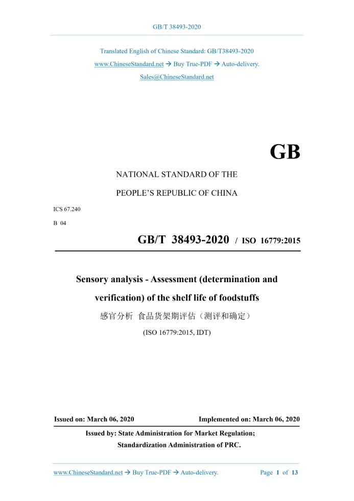 GB/T 38493-2020: Sensory analysis - Assessment (determination and verification) of the shelf life of foodstuffs Delivery: 9 seconds. True-PDF full-copy in English & invoice will be downloaded + auto-delivered via email. See step-by-step procedure Status: Valid