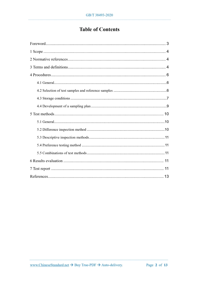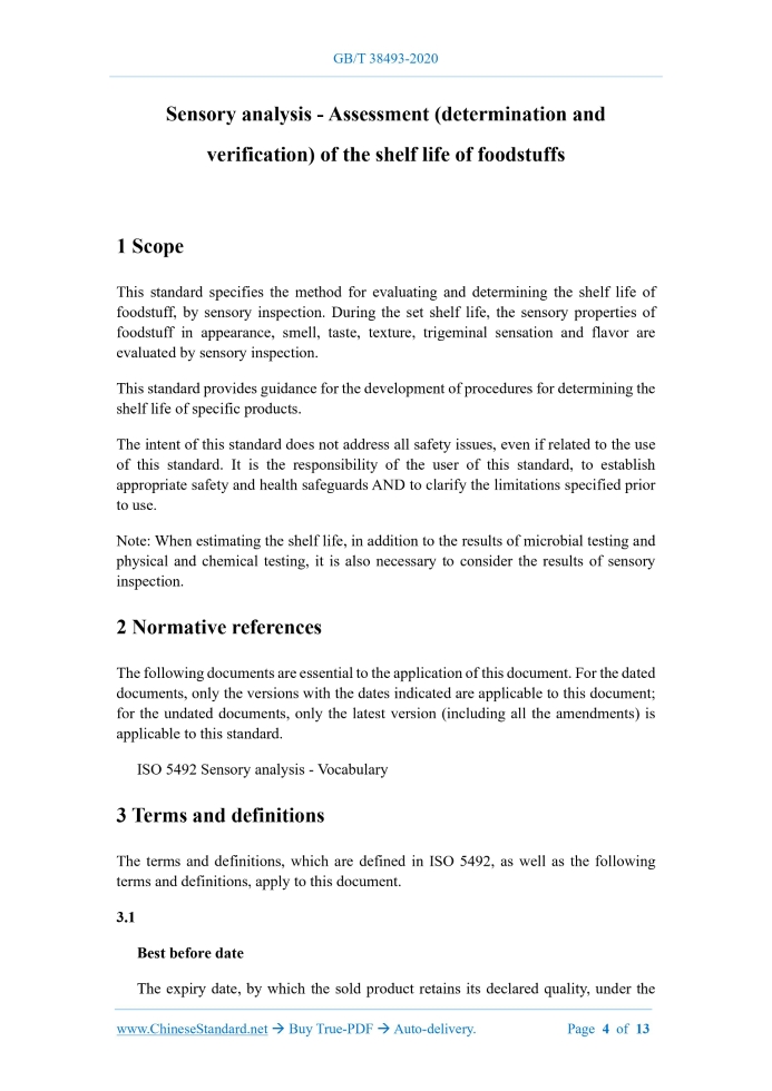 Similar standardsGB/T 38493-2020: Sensory analysis - Assessment (determination and verification) of the shelf life of foodstuffs---This is an excerpt. Full copy of true-PDF in English version (including equations, symbols, images, flow-chart, tables, and figures etc.), auto-downloaded/delivered in 9 seconds, can be purchased online: https://www.ChineseStandard.net/PDF.aspx/GBT38493-2020 NATIONAL STANDARD OF THE PEOPLE’S REPUBLIC OF CHINA ICS 67.240 B 04 GB/T 38493-2020 / ISO 16779:2015 Sensory analysis - Assessment (determination and verification) of the shelf life of foodstuffs (ISO 16779:2015, IDT) ISSUED ON: MARCH 06, 2020 IMPLEMENTED ON: MARCH 06, 2020 Issued by: State Administration for Market Regulation; Standardization Administration of PRC. Table of ContentsForeword ... 3 1 Scope ... 4 2 Normative references ... 4 3 Terms and definitions... 4 4 Procedures ... 6 4.1 General... 6 4.2 Selection of test samples and reference samples ... 6 4.3 Storage conditions ... 7 4.4 Development of a sampling plan ... 9 5 Test methods ... 10 5.1 General... 10 5.2 Difference inspection method ... 10 5.3 Descriptive inspection methods ... 11 5.4 Preference testing method ... 11 5.5 Combinations of test methods ... 11 6 Results evaluation ... 11 7 Test report ... 11 References ... 13 Sensory analysis - Assessment (determination and verification) of the shelf life of foodstuffs1 ScopeThis standard specifies the method for evaluating and determining the shelf life of foodstuff, by sensory inspection. During the set shelf life, the sensory properties of foodstuff in appearance, smell, taste, texture, trigeminal sensation and flavor are evaluated by sensory inspection. This standard provides guidance for the development of procedures for determining the shelf life of specific products. The intent of this standard does not address all safety issues, even if related to the use of this standard. It is the responsibility of the user of this standard, to establish appropriate safety and health safeguards AND to clarify the limitations specified prior to use. Note: When estimating the shelf life, in addition to the results of microbial testing and physical and chemical testing, it is also necessary to consider the results of sensory inspection.2 Normative referencesThe following documents are essential to the application of this document. For the dated documents, only the versions with the dates indicated are applicable to this document; for the undated documents, only the latest version (including all the amendments) is applicable to this standard. ISO 5492 Sensory analysis - Vocabulary3 Terms and definitionsThe terms and definitions, which are defined in ISO 5492, as well as the following terms and definitions, apply to this document. 3.1 Best before date The expiry date, by which the sold product retains its declared quality, under the representative of all aspects of the product being tested, including formulation, processing, packaging. Test samples should be packaged for easy distribution. In order to ensure the smooth progress of the test, the test sample can be produced in the laboratory or factory, OR it can be sampled from the commercially available products. If necessary, the test sample can be handled, under conditions similar to typical storage and circulation situations (such as: light, temperature and humidity changes, shaking or vibration, etc.). 4.2.2 Reference sample Test samples should be compared with their corresponding reference samples. Reference samples can be any of the following: a) Product standard samples used so far, data from descriptive analysis of previous sensory inspections, data obtained from sensory inspections at the test starting point (such as descriptive inspection results); b) Representative samples, which are newly produced during each test interval; c) During the test period, samples stored under conditions (such as refrigeration or modified atmosphere) that ensure minimal changes in product characteristics. The determination of reference samples can be refined, based on the results of consumer testing. 4.2.3 Number and quantity of test samples and reference samples The number and quantity of test samples and reference samples, which are required throughout the test period, depends on the test interval in the sampling plan, sensory inspection methods, experimental design, food properties, storage conditions. 4.3 Storage conditions 4.3.1 Specified storage conditions Storage conditions shall be detailed, in order to reproduce the storage conditions of the product distribution channel. It includes temperature, humidity, light, air pressure, weather simulation caused by seasonal changes (temperature changes), packaging- related properties (packaging material component migration, oxygen permeability, water vapor barrier, perforation, etc.), etc. It shall record the detailed storage conditions. 4.3.2 Non-specified storage conditions Non-specified conditions are storage conditions, that result from ambient conditions under appropriate storage requirements. The storage conditions shall meet the relevant requirements of the product AND be consistent with the storage conditions encountered in practice. The non-specified storage conditions and their changes shall be recorded separately. 4.3.3 Storage condition intended to accelerate product changes For products, which have longer shelf life and use by date, it may use the storage condition intended to accelerate product changes, to promote rapid changes in product characteristics. For products, which have longer shelf-life (e.g., frozen and dried foods), it should also shorten the test period, by accelerating product changes. The storage condition intended to accelerate product changes used shall conform to the characteristic decay law of the product being tested. The storage condition intended to accelerate product changes can be specified storage conditions or non-specified storage conditions, both of which shall be recorde
