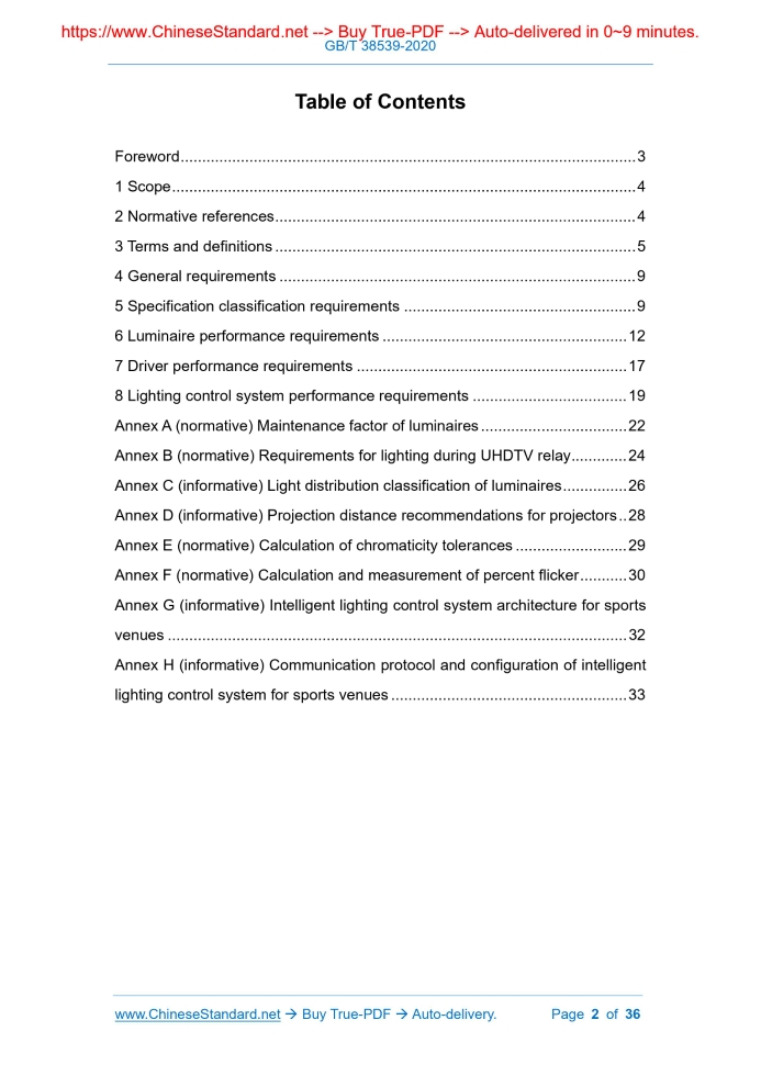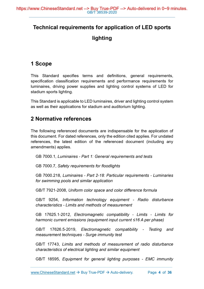 Similar standardsGB/T 38539-2020: Technical requirements for application of LED sports lighting---This is an excerpt. Full copy of true-PDF in English version (including equations, symbols, images, flow-chart, tables, and figures etc.), auto-downloaded/delivered in 9 seconds, can be purchased online: https://www.ChineseStandard.net/PDF.aspx/GBT38539-2020GB NATIONAL STANDARD OF THE PEOPLE’S REPUBLIC OF CHINA ICS 91.160.01 P 31 Technical requirements for application of LED sports lighting ISSUED ON: MARCH 06, 2020 IMPLEMENTED ON: OCTOBER 01, 2020 Issued by: State Administration for Market Regulation; Standardization Administration of the People's Republic of China. Table of ContentsForeword ... 3 1 Scope ... 4 2 Normative references ... 4 3 Terms and definitions ... 5 4 General requirements ... 9 5 Specification classification requirements ... 9 6 Luminaire performance requirements ... 12 7 Driver performance requirements ... 17 8 Lighting control system performance requirements ... 19 Annex A (normative) Maintenance factor of luminaires ... 22 Annex B (normative) Requirements for lighting during UHDTV relay ... 24 Annex C (informative) Light distribution classification of luminaires ... 26 Annex D (informative) Projection distance recommendations for projectors .. 28 Annex E (normative) Calculation of chromaticity tolerances ... 29 Annex F (normative) Calculation and measurement of percent flicker ... 30 Annex G (informative) Intelligent lighting control system architecture for sports venues ... 32 Annex H (informative) Communication protocol and configuration of intelligent lighting control system for sports venues ... 33 Technical requirements for application of LED sports lighting1 ScopeThis Standard specifies terms and definitions, general requirements, specification classification requirements and performance requirements for luminaires, driving power supplies and lighting control systems of LED for stadium sports lighting. This Standard is applicable to LED luminaires, driver and lighting control system as well as their applications for stadium and auditorium lighting.2 Normative referencesThe following referenced documents are indispensable for the application of this document. For dated references, only the edition cited applies. For undated references, the latest edition of the referenced document (including any amendments) applies. GB 7000.1, Luminaires - Part 1: General requirements and tests GB 7000.7, Safety requirements for floodlights GB 7000.218, Luminaires - Part 2-18: Particular requirements - Luminaries for swimming pools and similar application GB/T 7921-2008, Uniform color space and color difference formula GB/T 9254, Information technology equipment - Radio disturbance characteristics - Limits and methods of measurement GB 17625.1-2012, Electromagnetic compatibility - Limits - Limits for harmonic current emissions (equipment input current ≤16 A per phase) GB/T 17626.5-2019, Electromagnetic compatibility - Testing and measurement techniques - Surge immunity test GB/T 17743, Limits and methods of measurement of radio disturbance characteristics of electrical lighting and similar equipment GB/T 18595, Equipment for general lighting purposes - EMC immunity a visual phenomenon that causes uncomfortable feeling or reduces the ability to observe details or objects due to the inappropriate brightness distribution or brightness range in the field of view, or the existence of extreme contrast\ [JGJ/T 119-2008, definition 2.2.17] 3.6 colour rendering index measurement of light source color rendering, expressed by the degree of agreement between the color of the object under the measured light source and the color of the object under the reference light source [JGJ/T 119-2008, definition 2.3.28] 3.6.1 general colour rendering index; Ra the average value of the color rendering index of the light source to the 1st ~ 8th standard color samples specified by the International Commission on Illumination (CIE) 3.6.2 special colour rendering index; Ri the color rendering index of the light source for the 9th ~ 15th standard color samples selected by the International Commission of Illumination (CIE) NOTE: In this Standard, R9 refers to the color rendering index of the light source for the 9th standard color sample selected by the International Commission on Illumination (CIE). 3.7 colour temperature when the chromaticity of the light source is the same as the chromaticity of a black body at a certain temperature, the absolute temperature of the black body is the color temperature of the light source; color temperature is used to express how warm (red) or cold (blue) a kind of lighting feels or the apparent feeling [JGJ/T 119-2008, definition 2.3.21] 3.8 correlated colour temperature when the chromaticity point of the light source is not on the black body locus, and the chromaticity of the light source is close to the chromaticity of the blackbody at a certain temperature, the absolute temperature of the blackbody is the correlated color temperature of the light source [JGJ/T 119-2008, definition 2.3.22] 3.9 chromaticity tolerances characterize the deviation of each light source in a batch of light sources from lower than 70% of the initial luminous flux or cannot be used normally TO the installed quantity of this model of luminaires after installation and use 3.17 harmonic wave the component whose number of times is greater than the fundamental frequency in the Fourier series decomposition of a periodic non-sinusoidal electricity in the power supply system 3.18 total harmonic distortion of voltage the ratio of the effective value of all harmonic components of the voltage TO the effective value of the fundamental component 3.19 total harmonic distortion of current the ratio of the effective value of all harmonic components of the current TO the effective value of the fundamental component 3.20 overshoot amplitude the maximum instantaneous amplitude of the output voltage or current ex