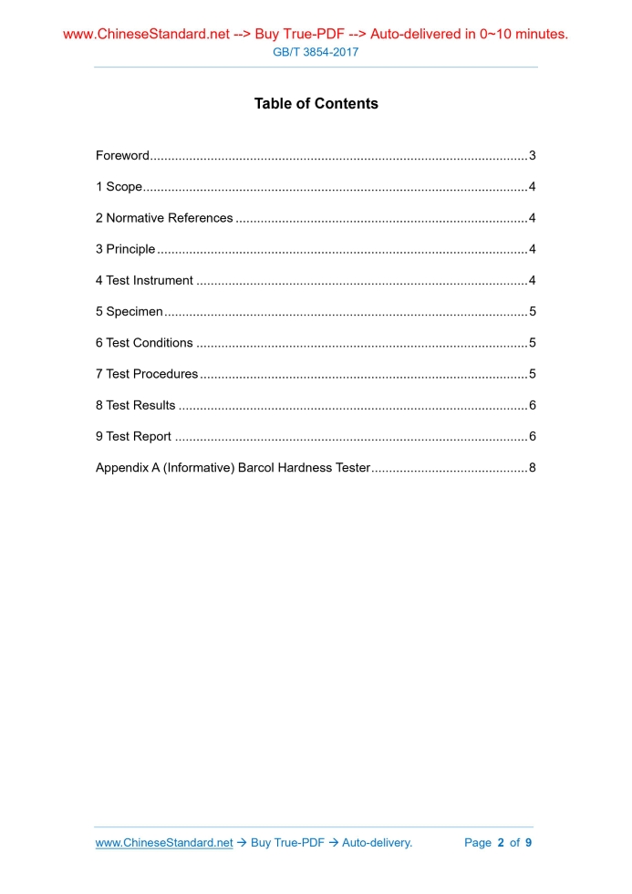 GB/T 3854-2017: Test method for hardness of reinforced plastics by means of a Barcol impresser---This is an excerpt. Full copy of true-PDF in English version (including equations, symbols, images, flow-chart, tables, and figures etc.), auto-downloaded/delivered in 9 seconds, can be purchased online: https://www.ChineseStandard.net/PDF.aspx/GBT3854-2017PEOPLE’S REPUBLIC OF CHINA ICS 83.120 Q 23 GB/T 3854-2017 Replacing GB/T 3854-2005 Test Method for Hardness of Reinforced Plastics by Means of a Barcol Impresser Issued on. September 07, 2017 Implemented on. August 01, 2018 Issued by. General Administration of Quality Supervision, Inspection and Quarantine; Standardization Administration of PRC. Table of ContentsForeword ... 3 1 Scope ... 4 2 Normative References ... 4 3 Principle ... 4 4 Test Instrument ... 4 5 Specimen ... 5 6 Test Conditions ... 5 7 Test Procedures ... 5 8 Test Results ... 6 9 Test Report ... 6 Appendix A (Informative) Barcol Hardness Tester ... 8ForewordThis Standard was drafted as per the rules specified in GB/T 1.1-2009. This Standard replaced GB/T 3854-2005 Test Method for Hardness of Reinforced Plastics by Means of Barcol Impresser; compared with GB/T 3854-2005, this Standard has the major technical changes as follows. --- Modify the structural diagram of the Barcol hardness tester into an Appendix (see Appendix A of this Edition; Clause 4 of 2005 Edition); --- Specify that if the pyramid of hardness tester is damaged, it shall be replaced; delete the replacing method of instrument head (see 7.1.2 of this Edition; 7.1.3 of 2005 Edition); --- Modify the number of tests into at least 10 times (see 7.2.5 of this Edition; Clause 8 of 2005 Edition); ---Calculate the test results as per the provisions of GB/T 1446; delete the calculation formulas of arithmetic mean, standard deviation and dispersion coefficient (see 8.2 of this Edition; 9.2, 9.3, 9.4 of 2005 Edition). This Standard was proposed by China Building Material Federation. This Standard shall be under the jurisdiction of National Technical Committee for the Standardization of Fiber Reinforced Plastics (SAC/TC 39). Drafting organizations of this Standard. East China University of Science and Technology; Huachang Polymer Co., Ltd. of East China University Science Technology; and Shanghai Society of Corrosion Science and Technology. Chief drafting staffs of this Standard. Liu Zuozhen, Hu Fuzeng, Lv Xiaoping, Lei Hao, Qian Jianhua, Liu Hua, and Huang Rui. The historical editions replaced by this Standard are as follows. --- GB/T 3854-1983, GB/T 3854-2005. Test Method for Hardness of Reinforced Plastics by Means of a Barcol Impresser1 ScopeThis Standard specifies principle, test instrument, specimen, test conditions, test procedures, test results and test report by using the Barcol hardness tester to test the hardness of reinforced rigid plastics and their products. This Standard is applicable to the determination of the Barcol hardness of the reinforced rigid plastics and their products; while the determination of the Barcol hardness of the non-reinforced rigid plastics and their products can also refer to this Standard; however, it is not applicable to the materials with Barcol hardness less than 20.2 Normative ReferencesThe following documents are essential to the application of this document. For the dated documents, only the versions with the dates indicated are applicable to this document; for the undated documents, only the latest version (including all the amendments) are applicable to this document. GB/T 1446 The Generals of Test Methods for Properties of Fiber-Reinforced Plastics3 PrincipleWhen using the Barcol hardness tester to measure the surface hardness of the materials, it indicates that press the specific pyramid into the specimen under the pressure of the standard load spring; the relative hardness of the specimen is characterized according to the depth of the press.4 Test InstrumentUse the Barcol hardness tester to measure, its structural diagram can refer to Appendix A. 7.2.1 Place the specimen on a hard and stable supporting surface (such as steel plate, glass plate, cement platform, etc.) to test; the product can be tested directly on the appropriate part of its surface. The curved specimen shall be supported stably, when applying the test pressure, please note to avoid bending and deformation of the specimen. 7.2.2 Place the pyramid sleeve vertically on the surface of the specimen; place the supporting lug on the same surface or other solid materials with the same height; ensure that the pyramid and supporting lug in the same plane. 7.2.3 Hold the hardness tester casing with hand, apply a downward pressure quickly and evenly till the dial reading reaches its maximum value; record such maximum value (some materials shall appear reading of maximum value drifting back; such reading is in non-linear relationship with time); such reading is the Barcol hardness value. When the pyramid is in contact with the tested surface, try to avoid sliding and scratching. 7.2.4 The position of the indentation shall be greater than 3mm from the edge of the specimen; the spacing of the indentation shall also be greater than 3mm. 7.2.5 Test the hardness on at least 10 different positions of the specimen.8 Test Results8.1 Single test value. x1, x2, x3, ... xn. 8.2 According to the provisions of GB/T 1446, calculate the arithmetic mean 𝑥̅, standard deviation S, dispersion coefficient CV; the results shall be retained two significant digits.9 Test ReportThe test report shall include the following contents at least. a) Specimen name, appearance quality; b) Specimen delivery organization; c) State adjustment and test environment condition of the specimen; d) Model of the Barcol hardness tester; e) Test results; f) This Standard number; ......Source: Above contents are excerpted from the full-copy PDF -- translated/reviewed by: www.ChineseStandard.net / Wayne Zheng et al. Tips & Frequently Asked Questions:Question 1