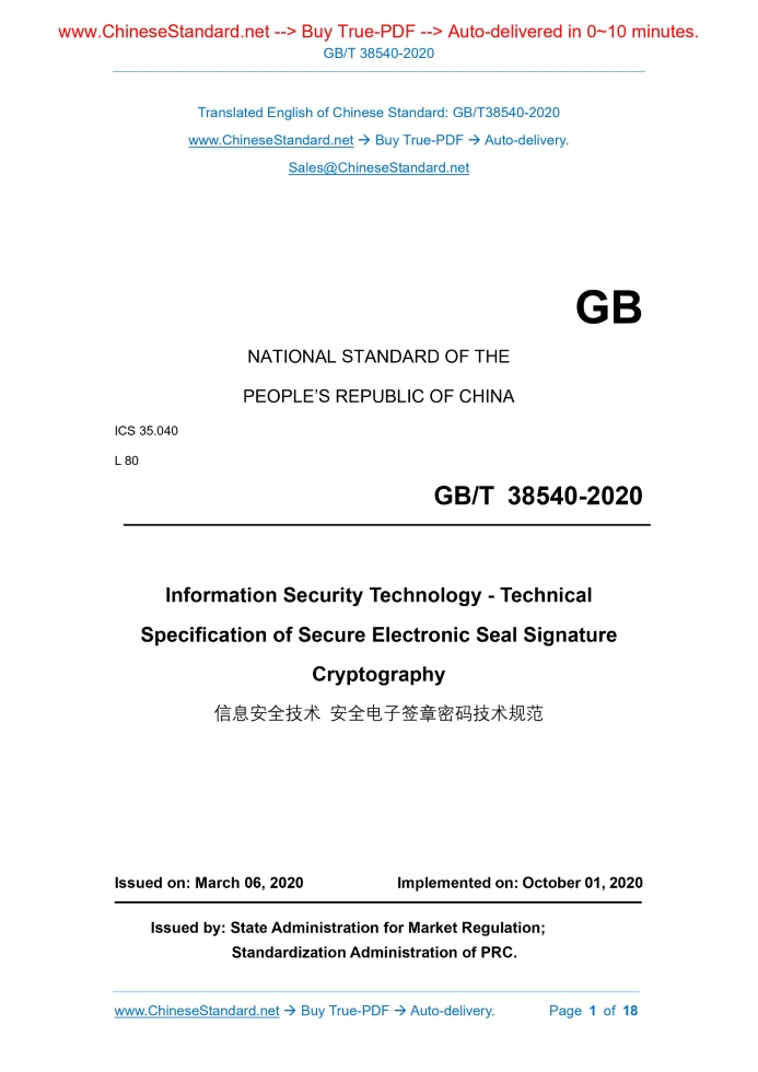 GB/T 38540-2020: Information Security Technology - Technical Specification of Secure Electronic Seal Signature Cryptography Delivery: 9 seconds. True-PDF full-copy in English & invoice will be downloaded + auto-delivered via email. See step-by-step procedure Status: Valid