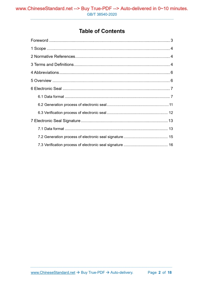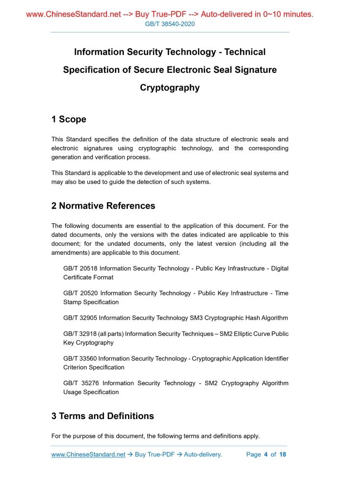 Similar standardsGB/T 38540-2020: Information Security Technology - Technical Specification of Secure Electronic Seal Signature Cryptography---This is an excerpt. Full copy of true-PDF in English version (including equations, symbols, images, flow-chart, tables, and figures etc.), auto-downloaded/delivered in 9 seconds, can be purchased online: https://www.ChineseStandard.net/PDF.aspx/GBT38540-2020 NATIONAL STANDARD OF THE PEOPLE’S REPUBLIC OF CHINA ICS 35.040 L 80 Information Security Technology - Technical Specification of Secure Electronic Seal Signature Cryptography ISSUED ON: MARCH 06, 2020 IMPLEMENTED ON: OCTOBER 01, 2020 Issued by: State Administration for Market Regulation; Standardization Administration of PRC. Table of ContentsForeword ... 3 1 Scope ... 4 2 Normative References ... 4 3 Terms and Definitions ... 4 4 Abbreviations ... 6 5 Overview ... 6 6 Electronic Seal ... 7 6.1 Data format ... 7 6.2 Generation process of electronic seal ... 11 6.3 Verification process of electronic seal ... 12 7 Electronic Seal Signature ... 13 7.1 Data format ... 13 7.2 Generation process of electronic seal signature ... 15 7.3 Verification process of electronic seal signature ... 16 Information Security Technology - Technical Specification of Secure Electronic Seal Signature Cryptography1 ScopeThis Standard specifies the definition of the data structure of electronic seals and electronic signatures using cryptographic technology, and the corresponding generation and verification process. This Standard is applicable to the development and use of electronic seal systems and may also be used to guide the detection of such systems.2 Normative ReferencesThe following documents are essential to the application of this document. For the dated documents, only the versions with the dates indicated are applicable to this document; for the undated documents, only the latest version (including all the amendments) are applicable to this document. GB/T 20518 Information Security Technology - Public Key Infrastructure - Digital Certificate Format GB/T 20520 Information Security Technology - Public Key Infrastructure - Time Stamp Specification GB/T 32905 Information Security Technology SM3 Cryptographic Hash Algorithm GB/T 32918 (all parts) Information Security Techniques – SM2 Elliptic Curve Public Key Cryptography GB/T 33560 Information Security Technology - Cryptographic Application Identifier Criterion Specification GB/T 35276 Information Security Technology - SM2 Cryptography Algorithm Usage Specification3 Terms and DefinitionsFor the purpose of this document, the following terms and definitions apply. electronic seal. 3.8 SM2 algorithm An elliptic curve cryptographic algorithm that is defined by GB/T 32918. 3.9 SM3 algorithm A hash algorithm that is defined by GB/T 32905.4 AbbreviationsFor the purpose of this document, the following abbreviations apply. ANS.1: Abstract Syntax Notation One BMP: Bitmap DER: Distinguished Encoding Rules GIF Graphics Interchange Format JPG: Joint Photographic Experts Group OID: Object Identifier PKI: Public Key Infrastructure SVG: Scalable Vector Graphics5 OverviewSecure electronic seal signature is a combination of digital image processing technology and electronic signature technology by using PKI public key cryptography technology to digitally sign electronic documents with stamped image data in electronic form, to ensure the authenticity of the document source and the document Integrity, prevent unauthorized tampering of documents, and ensure the non-repudiation of signatures. In order to ensure the integrity, unforgeability of the electronic seal, and only legal users can use it, a secure electronic seal data format needs to be defined. Through digital signature, the image data of the seal is securely bound to the seal attributes such as the signer to form a secure electronic seal. In the process of using the seal, the electronic seal shall be verified for security. In the process of electronically signing various documents using electronic seals, the signature operation on the seal information field of procedure a) above to form a signature value; c) The data of procedures a) and b) above, as well as the electronic seal marker certificate and the signature algorithm identification, form the electronic seal data format defined in 6.1.1. 6.3 Verification process of electronic seal The verification process of electronic seal is as follows: a) Verify the correctness of the electronic seal data format Analyze the electronic seal according to the electronic seal format and verify whether it conforms to the electronic seal data format defined in 6.1. If the data format of the electronic seal is incorrect, the verification fails, then it shall return an error code and exit the verification process. b) Verify whether the electronic seal signature value is correct Verify whether the signature value in the electronic seal is correct based on the seal information, electronic seal maker certificate, and signature algorithm identification. If the verification of the electronic seal signature fails, it shall return an error code and exit the verification process. c) Verify the validity of the electronic seal maker certificate To verify the validity of the seal maker certificate, the verification items include at least: verification of the seal maker certificate trust chain, verification of the validity period of the electronic seal maker certificate, whether the electronic seal maker certificate is revoked, and whether the key usage is correct. If the verification of the electronic seal maker certificate fails, it shall return an error code and the exit verification process. d) Verify the validity of the electronic seal According to the start time and end time of the seal validity period the in the seal attributes, verify whether the electronic seal has expired. If the electronic seal has expired, the verification fails, it shall return an error code and exit the verification 