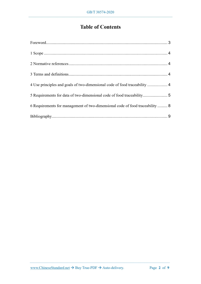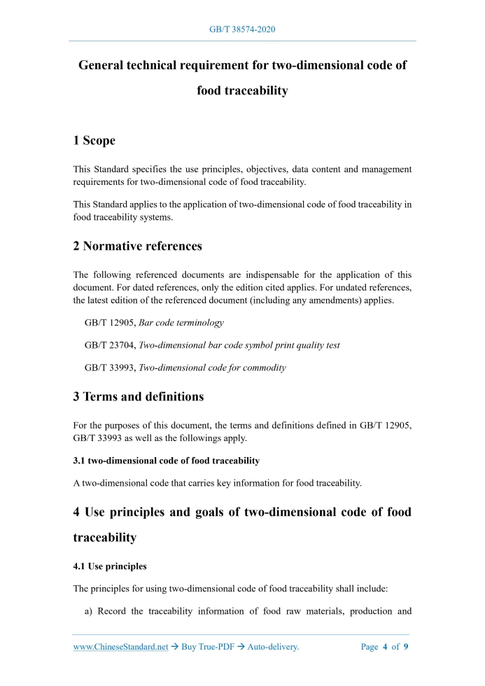 Similar standardsGB/T 38574-2020: General technical requirement for two-dimensional code of food traceability---This is an excerpt. Full copy of true-PDF in English version (including equations, symbols, images, flow-chart, tables, and figures etc.), auto-downloaded/delivered in 9 seconds, can be purchased online: https://www.ChineseStandard.net/PDF.aspx/GBT38574-2020NATIONAL STANDARD OF THE PEOPLE’S REPUBLIC OF CHINA ICS 67.040 X 07 General technical requirement for two-dimensional code of food traceability ISSUED ON: MARCH 31, 2020 IMPLEMENTED ON: APRIL 01, 2021 Issued by: State Administration for Market Regulation; Standardization Administration of the People's Republic of China. Table of ContentsForeword ... 3 1 Scope ... 4 2 Normative references ... 4 3 Terms and definitions... 4 4 Use principles and goals of two-dimensional code of food traceability ... 4 5 Requirements for data of two-dimensional code of food traceability ... 5 6 Requirements for management of two-dimensional code of food traceability ... 8 Bibliography... 9 General technical requirement for two-dimensional code of food traceability1 ScopeThis Standard specifies the use principles, objectives, data content and management requirements for two-dimensional code of food traceability. This Standard applies to the application of two-dimensional code of food traceability in food traceability systems.2 Normative referencesThe following referenced documents are indispensable for the application of this document. For dated references, only the edition cited applies. For undated references, the latest edition of the referenced document (including any amendments) applies. GB/T 12905, Bar code terminology GB/T 23704, Two-dimensional bar code symbol print quality test GB/T 33993, Two-dimensional code for commodity3 Terms and definitionsFor the purposes of this document, the terms and definitions defined in GB/T 12905, GB/T 33993 as well as the followings apply. 3.1 two-dimensional code of food traceability A two-dimensional code that carries key information for food traceability.4 Use principles and goals of two-dimensional code of foodtraceability 4.1 Use principles The principles for using two-dimensional code of food traceability shall include: a) Record the traceability information of food raw materials, production and processing technology, circulation, product characteristics; b) Realize effective information verification; c) Provide online inquiries for consumers. 4.2 Use goals The goals for using two-dimensional code of food traceability shall include but not be limited to: a) Record or identify food processing information and form product identification; b) Identify the responsibilities of each link in the production, distribution and sales process; c) Help consumers to realize online inquiries; d) Provide traceability technical support for related supervision and services.5 Requirements for data of two-dimensional code of foodtraceability 5.1 Requirements for data of two-dimensional code of food traceability 5.1.1 Requirements for traceability data for procurement of raw materials The mandatory contents of the raw and auxiliary material procurement traceability data in the two-dimensional code of food traceability include: a) Name of raw material; b) Production date/production batch number; c) Manufacturer or supplier. The optional contents of the raw and auxiliary material procurement traceability data in the two-dimensional code of food traceability include: a) Specification, quantity and purchase date of raw and auxiliary materials; b) Inspection basis and inspection report of raw and auxiliary materials; c) Storage conditions and shelf life of raw and auxiliary materials. 5.1.2 Requirements for traceability data in food production and processing information of the consignee; e) For food that needs to be refrigerated, frozen or stored under other special conditions, its transportation conditions (such as temperature, humidity) shall be monitored.6 Requirements for management of two-dimensional code offood traceability 6.1 Requirements for preparation of two-dimensional code of food traceability The two-dimensional code system stipulated by national standards such as GB/T 33993, GB/T 21049, and GB/T 18284 can be used for the two-dimensional code of food traceability. 6.2 Requirements for marking of two-dimensional code of food traceability The two-dimensional code of food traceability shall correspond one-to-one with the identification object and be attached to the position specified by the traced object. 6.3 Requirements for symbol size of two-dimensional code of food traceability The symbol size of the two-dimensional code of food traceability shall be selected according to the relevant coding standards, printing area, layout design, reading device and system allowability. If necessary, relevant adaptation experiments are required. The minimum module size shall not be less than 0.254mm. 6.4 Requirements for quality of wo-dimensional code of food traceability The determination of the quality of the two-dimensional code of food traceability shall be carried out in accordance with GB/T 23704 and the corresponding code system standards. Including but not limited to the following situations: a) The barcode shall be free from deinking, pollution and distortion. The edges are clear, without hair and halo or curvature; b) The barcode shall be clear and easy to identify, and not easily damaged by factors such as food handling, collision and friction; c) The selection of reading equipment shall be based on the resolution of the two- dimensional barcode image read. It shall meet the relevant requirements in terms of resolution, scanning attributes, barcode symbol length, and code recognition rate. ......Source: Above contents are excerpted from the full-copy PDF -- translated/reviewed by: www.ChineseStandard.net / Wayne Zheng et al. Tips & Frequently Asked Questions:Question 1: How long will the true-PDF of English version
