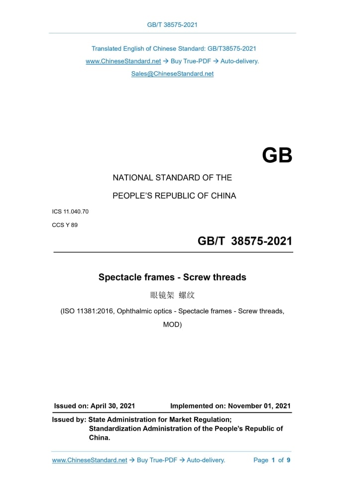 GB/T 38575-2021: Spectacle frames - Screw threads Delivery: 9 seconds. True-PDF full-copy in English & invoice will be downloaded + auto-delivered via email. See step-by-step procedure Status: Valid