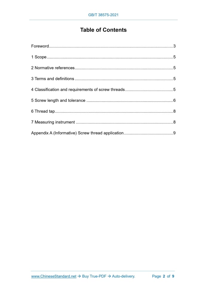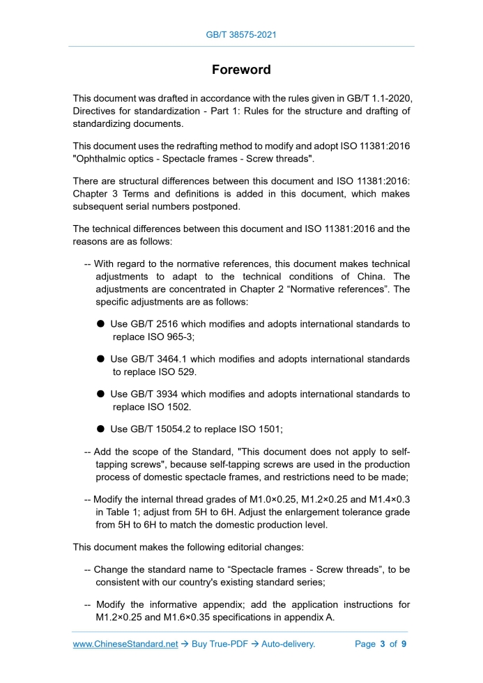 Similar standardsGB/T 38575-2021: Spectacle frames - Screw threads---This is an excerpt. Full copy of true-PDF in English version (including equations, symbols, images, flow-chart, tables, and figures etc.), auto-downloaded/delivered in 9 seconds, can be purchased online: https://www.ChineseStandard.net/PDF.aspx/GBT38575-2021GB NATIONAL STANDARD OF THE PEOPLE’S REPUBLIC OF CHINA ICS 11.040.70 CCS Y 89 Spectacle frames - Screw threads 眼镜架 螺纹 (ISO 11381:2016, Ophthalmic optics - Spectacle frames - Screw threads, MOD) ISSUED ON: APRIL 30, 2021 IMPLEMENTED ON: NOVEMBER 01, 2021 Issued by: State Administration for Market Regulation; Standardization Administration of the People’s Republic of China. Table of ContentsForeword ... 3 1 Scope ... 5 2 Normative references ... 5 3 Terms and definitions ... 5 4 Classification and requirements of screw threads ... 5 5 Screw length and tolerance ... 6 6 Thread tap ... 8 7 Measuring instrument ... 8 Appendix A (Informative) Screw thread application ... 9ForewordThis document was drafted in accordance with the rules given in GB/T 1.1-2020, Directives for standardization - Part 1: Rules for the structure and drafting of standardizing documents. This document uses the redrafting method to modify and adopt ISO 11381:2016 "Ophthalmic optics - Spectacle frames - Screw threads". There are structural differences between this document and ISO 11381:2016: Chapter 3 Terms and definitions is added in this document, which makes subsequent serial numbers postponed. The technical differences between this document and ISO 11381:2016 and the reasons are as follows: -- With regard to the normative references, this document makes technical adjustments to adapt to the technical conditions of China. The adjustments are concentrated in Chapter 2 “Normative references”. The specific adjustments are as follows: ● Use GB/T 2516 which modifies and adopts international standards to replace ISO 965-3; ● Use GB/T 3464.1 which modifies and adopts international standards to replace ISO 529. ● Use GB/T 3934 which modifies and adopts international standards to replace ISO 1502. ● Use GB/T 15054.2 to replace ISO 1501; -- Add the scope of the Standard, "This document does not apply to self- tapping screws", because self-tapping screws are used in the production process of domestic spectacle frames, and restrictions need to be made; -- Modify the internal thread grades of M1.0×0.25, M1.2×0.25 and M1.4×0.3 in Table 1; adjust from 5H to 6H. Adjust the enlargement tolerance grade from 5H to 6H to match the domestic production level. This document makes the following editorial changes: -- Change the standard name to “Spectacle frames - Screw threads”, to be consistent with our country's existing standard series; -- Modify the informative appendix; add the application instructions for M1.2×0.25 and M1.6×0.35 specifications in appendix A. Spectacle frames - Screw threads1 ScopeThis document specifies the classification and requirements of screw threads used for spectacle frames, the length and tolerances of screws, the thread taps and measuring instruments. This document applies to small threads, ordinary threads and thread taps. This document does not apply to self-tapping screws.2 Normative referencesThe contents of the following documents constitute the indispensable clauses of this document through normative references in the text. For dated references, only the version corresponding to that date is applicable to this document; for undated references, the latest version (including all amendments) is applicable to this document. GB/T 2516, General purpose metric screw threads - Limit deviations (GB/T 2516-2003, ISO 965-3:1998, MOD) GB/T 3464.1, Machine and hand taps - Part 1: Plain parallel shank machine and hand taps (GB/T 3464.1-2007, ISO 529:1993, MOD) GB/T 3934, Specification of gauges for general purpose screw threads (GB/T 3934-2003, ISO 1502:1996, MOD) GB/T 15054.2, Miniature screw threads - Part 2: Tolerances and limits of size3 Terms and definitionsNo terms and definitions need to be defined in this document.4 Classification and requirements of screw threadsScrew threads are divided into small threads and ordinary threads according to their diameter and pitch. The size of the small thread is S0.8×0.2; its tolerance shall meet the requirements of GB/T 15054.2. ......Source: Above contents are excerpted from the full-copy PDF -- translated/reviewed by: www.ChineseStandard.net / Wayne Zheng et al. Tips & Frequently Asked Questions:Question 1: How long will the true-PDF of English version of GB/T 38575-2021 be delivered?Answer: The full copy PDF of English version of GB/T 38575-2021 can be downloaded in 9 seconds, and it will also be emailed to you in 9 seconds (double mechanisms to ensure the delivery reliably), with PDF-invoice.Question 2: Can I share the purchased PDF of GB/T 38575-2021_English with my colleagues?Answer: Yes. The purchased PDF of GB/T 38575-2021_English will be deemed to be sold to your employer/organization who actually paid for it, including your colleagues and your employer's intranet.Question 3: Does the price include tax/VAT?Answer: Yes. Our tax invoice, downloaded/delivered in 9 seconds, includes all tax/VAT and complies with 100+ countries' tax regulations (tax exempted in 100+ countries) -- See Avoidance of Double Taxation Agreements (DTAs): List of DTAs signed between Singapore and 100+ countriesQuestion 4: Do you accept my currency other than USD?Answer: Yes. www.ChineseStandard.us -- GB/T 38575-2021 -- Click this link and select your country/currency to pay, the exact amount in your currency will be printed on the invoice. Full PDF will also be downloaded/emailed in 9 seconds.How to buy and download a true PDF of English version of GB/T 38575-2021?A step-by-step guide to download PDF of GB/T 38575-2021_EnglishStep 1: Visit website https://www.ChineseStandard.net (Pay in USD), or https://www.ChineseStandard.us (Pay in any 