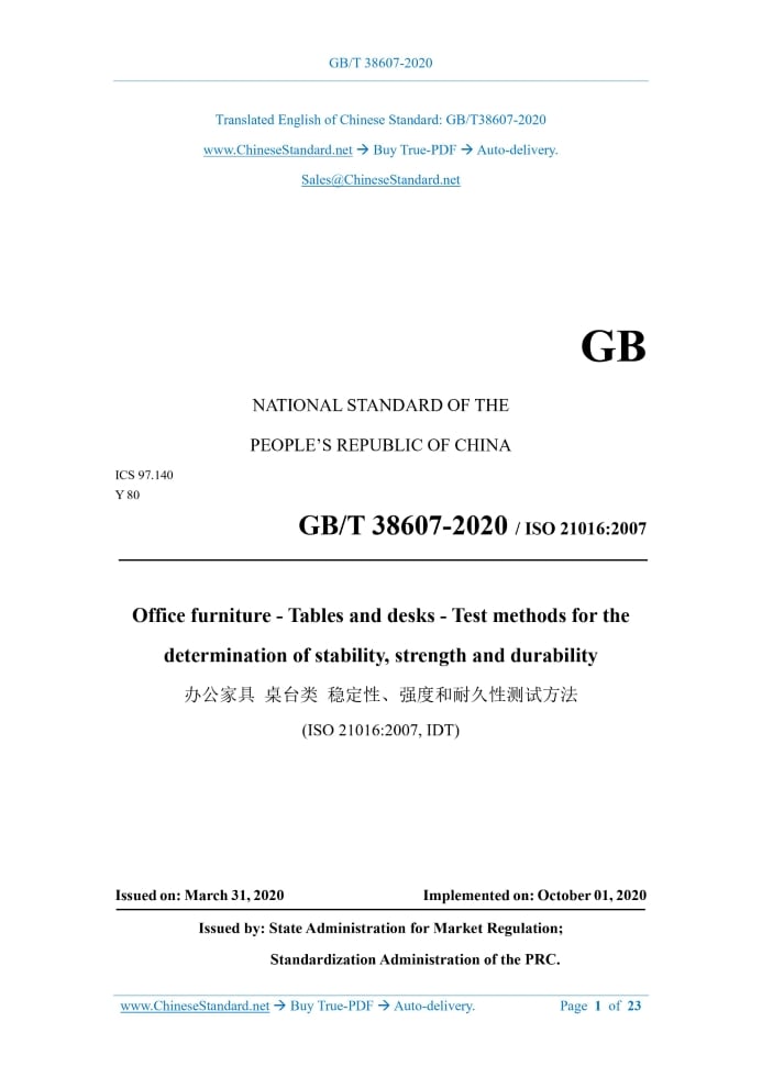 GB/T 38607-2020: Office furniture - Tables and desks - Test methods for the determination of stability, strength and durability Delivery: 9 seconds. True-PDF full-copy in English & invoice will be downloaded + auto-delivered via email. See step-by-step procedure Status: Valid