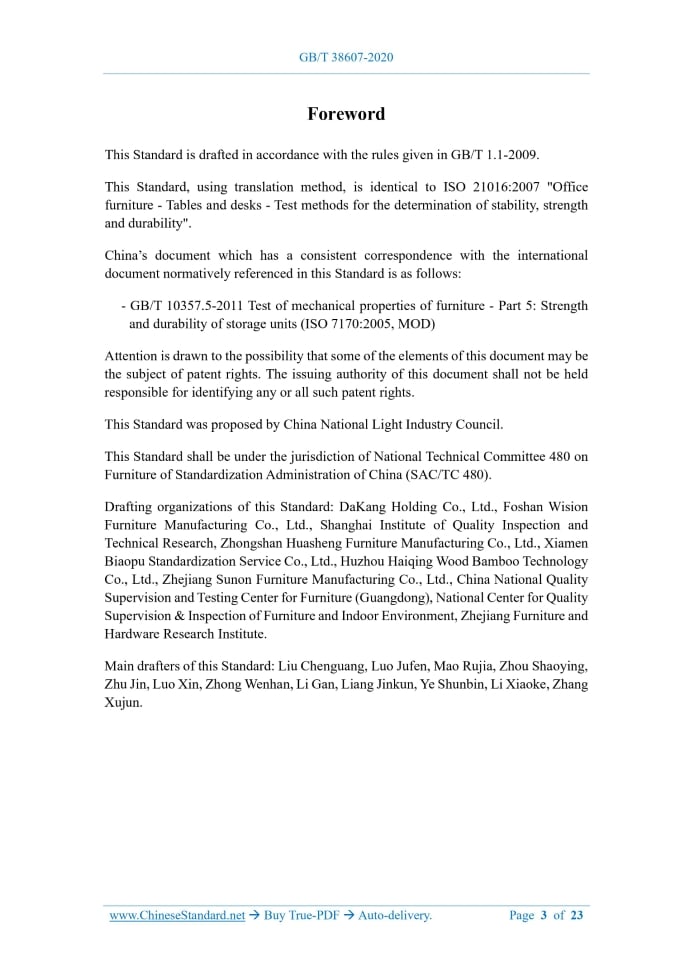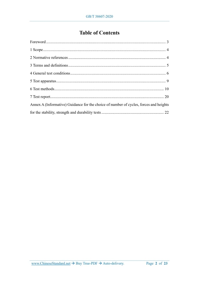 Similar standardsGB/T 38607-2020: Office furniture - Tables and desks - Test methods for the determination of stability, strength and durability---This is an excerpt. Full copy of true-PDF in English version (including equations, symbols, images, flow-chart, tables, and figures etc.), auto-downloaded/delivered in 9 seconds, can be purchased online: https://www.ChineseStandard.net/PDF.aspx/GBT38607-2020 NATIONAL STANDARD OF THE PEOPLE’S REPUBLIC OF CHINA ICS 97.140 Y 80 GB/T 38607-2020 / ISO 21016:2007 Office furniture - Tables and desks - Test methods for the determination of stability, strength and durability (ISO 21016:2007, IDT) ISSUED ON: MARCH 31, 2020 IMPLEMENTED ON: OCTOBER 01, 2020 Issued by: State Administration for Market Regulation; Standardization Administration of the PRC. Table of ContentsForeword ... 3 1 Scope ... 4 2 Normative references ... 4 3 Terms and definitions ... 5 4 General test conditions ... 6 5 Test apparatus ... 9 6 Test methods ... 10 7 Test report ... 20 Annex A (Informative) Guidance for the choice of number of cycles, forces and heights for the stability, strength and durability tests ... 22ForewordThis Standard is drafted in accordance with the rules given in GB/T 1.1-2009. This Standard, using translation method, is identical to ISO 21016:2007 "Office furniture - Tables and desks - Test methods for the determination of stability, strength and durability". China’s document which has a consistent correspondence with the international document normatively referenced in this Standard is as follows: - GB/T 10357.5-2011 Test of mechanical properties of furniture - Part 5: Strength and durability of storage units (ISO 7170:2005, MOD) Attention is drawn to the possibility that some of the elements of this document may be the subject of patent rights. The issuing authority of this document shall not be held responsible for identifying any or all such patent rights. This Standard was proposed by China National Light Industry Council. This Standard shall be under the jurisdiction of National Technical Committee 480 on Furniture of Standardization Administration of China (SAC/TC 480). Drafting organizations of this Standard: DaKang Holding Co., Ltd., Foshan Wision Furniture Manufacturing Co., Ltd., Shanghai Institute of Quality Inspection and Technical Research, Zhongshan Huasheng Furniture Manufacturing Co., Ltd., Xiamen Biaopu Standardization Service Co., Ltd., Huzhou Haiqing Wood Bamboo Technology Co., Ltd., Zhejiang Sunon Furniture Manufacturing Co., Ltd., China National Quality Supervision and Testing Center for Furniture (Guangdong), National Center for Quality Supervision & Inspection of Furniture and Indoor Environment, Zhejiang Furniture and Hardware Research Institute. Main drafters of this Standard: Liu Chenguang, Luo Jufen, Mao Rujia, Zhou Shaoying, Zhu Jin, Luo Xin, Zhong Wenhan, Li Gan, Liang Jinkun, Ye Shunbin, Li Xiaoke, Zhang Xujun. Office furniture - Tables and desks - Test methods for the determination of stability, strength and durability1 ScopeThis Standard specifies test methods for the determination of the stability, the strength and the durability of office tables designed for use in the seated or standing position, e.g. work tables, height-adjustable tables, meeting tables and desks. This Standard applies to products that are fully assembled and ready for use. This Standard does not contain test methods for storage elements, which can be found in ISO 7170. The test methods consist of the application, to various parts of the unit, of loads, forces and velocities simulating normal functional use of office table, as well as misuse, that can reasonably be expected to occur. With the exception of the deflection of table tops, the tests are designed to evaluate properties without regard to materials, design, construction and manufacturing processes. The test results are valid only for the sample tested. These results can be used to represent the performance of production models provided that the tested sample is representative of the production model. Tests carried out according to this Standard are intended to demonstrate the ability of the item to give satisfactory service in its intended use environment. However, such tests do not ensure that structural failure will not eventually occur as a result of habitual misuse or after an excessively long period of service. The test methods in this Standard have been developed for units or components that have not been in use. However, when properly justified, they can be used for product fault investigation. This Standard specifies test methods only. It does not specify requirements. These should be specified in a requirements document. If this is not available, forces and number of cycles can be found in Annex A. Assessment of ageing and degradation is not included in this Standard.2 Normative referencesThe following documents are indispensable for the application of this document. For ......Source: Above contents are excerpted from the full-copy PDF -- translated/reviewed by: www.ChineseStandard.net / Wayne Zheng et al. Tips & Frequently Asked Questions:Question 1: How long will the true-PDF of English version of GB/T 38607-2020 be delivered?Answer: The full copy PDF of English version of GB/T 38607-2020 can be downloaded in 9 seconds, and it will also be emailed to you in 9 seconds (double mechanisms to ensure the delivery reliably), with PDF-invoice.Question 2: Can I share the purchased PDF of GB/T 38607-2020_English with my colleagues?Answer: Yes. The purchased PDF of GB/T 38607-2020_English will be deemed to be sold to your employer/organization who actually paid for it, including your colleagues and your employer's intranet.Question 3: Does the price include tax/VAT?Answer: Yes. Our tax invoice, downloaded/delivered in 9 seconds, includes all tax/VAT and complies with 100+ countries' tax regulations (tax exempted in 100+ countries) -- See Avoidance of Double Taxation Agreements (DTAs): List 