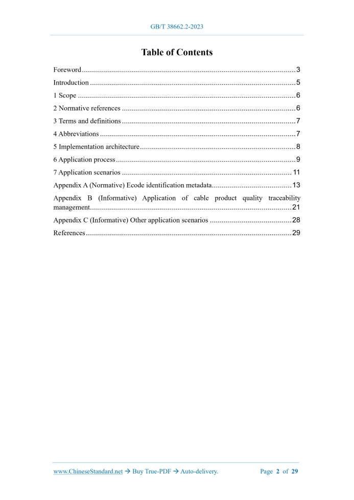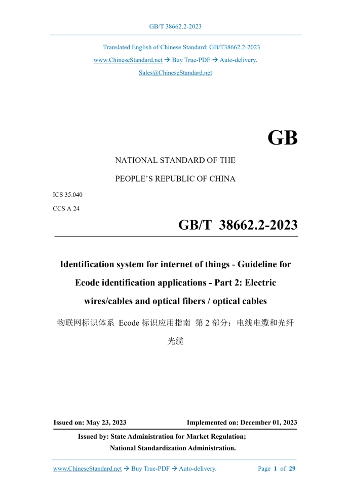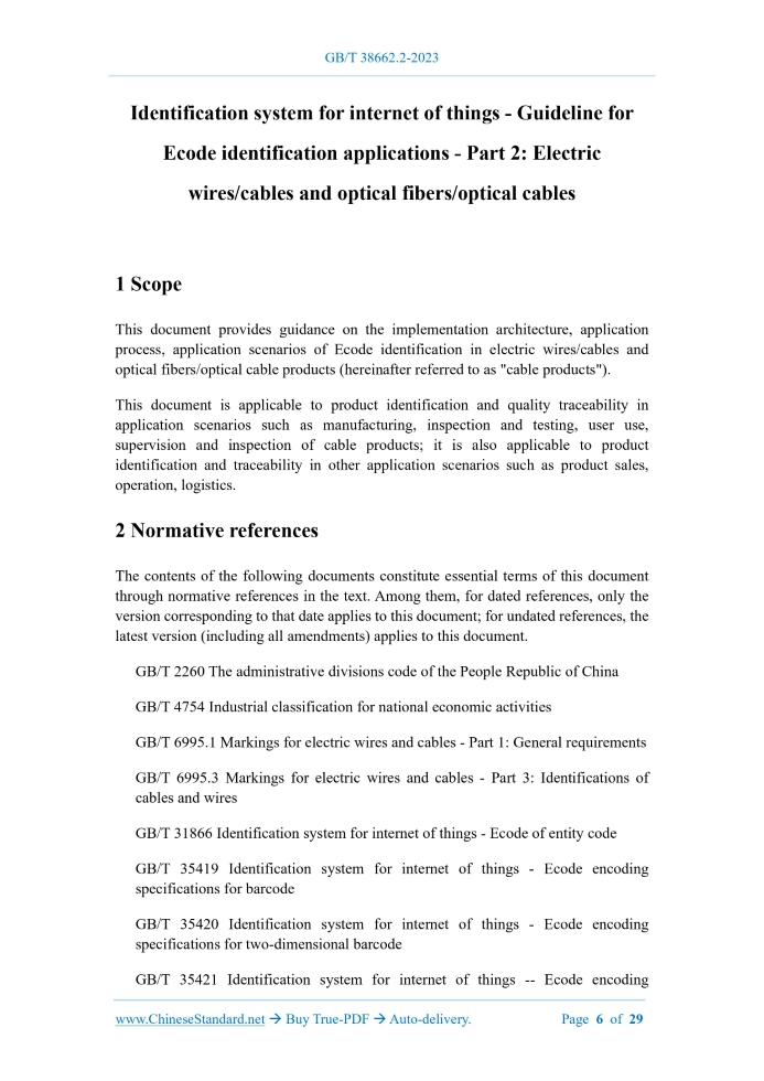 Similar standardsGB/T 38662.2-2023: Identification system for internet of things - Guideline for Ecode identification applications - Part 2: Electric wires/cables and optical fibres/optical cables---This is an excerpt. Full copy of true-PDF in English version (including equations, symbols, images, flow-chart, tables, and figures etc.), auto-downloaded/delivered in 9 seconds, can be purchased online: https://www.ChineseStandard.net/PDF.aspx/GBT38662.2-2023 GB NATIONAL STANDARD OF THE PEOPLE’S REPUBLIC OF CHINA ICS 35.040 CCS A 24 Identification system for internet of things - Guideline for Ecode identification applications - Part 2.Electric wires/cables and optical fibers / optical cables 光缆 Issued on: MAY 23, 2023 Implemented on: DECEMBER 01, 2023 Issued by. State Administration for Market Regulation; National Standardization Administration. Table of ContentsForeword... 3 Introduction... 5 1 Scope... 6 2 Normative references... 6 3 Terms and definitions... 7 4 Abbreviations... 7 5 Implementation architecture... 8 6 Application process... 9 7 Application scenarios... 11 Appendix A (Normative) Ecode identification metadata... 13 Appendix B (Informative) Application of cable product quality traceability management... 21 Appendix C (Informative) Other application scenarios... 28 References... 29 Identification system for internet of things - Guideline for Ecode identification applications - Part 2.Electric wires/cables and optical fibers/optical cables1 ScopeThis document provides guidance on the implementation architecture, application process, application scenarios of Ecode identification in electric wires/cables and optical fibers/optical cable products (hereinafter referred to as "cable products"). This document is applicable to product identification and quality traceability in application scenarios such as manufacturing, inspection and testing, user use, supervision and inspection of cable products; it is also applicable to product identification and traceability in other application scenarios such as product sales, operation, logistics.2 Normative referencesThe contents of the following documents constitute essential terms of this document through normative references in the text. Among them, for dated references, only the version corresponding to that date applies to this document; for undated references, the latest version (including all amendments) applies to this document. GB/T 2260 The administrative divisions code of the People Republic of China GB/T 4754 Industrial classification for national economic activities GB/T 6995.1 Markings for electric wires and cables - Part 1.General requirements GB/T 6995.3 Markings for electric wires and cables - Part 3.Identifications of cables and wires GB/T 31866 Identification system for internet of things - Ecode of entity code GB/T 35419 Identification system for internet of things - Ecode encoding specifications for barcode GB/T 35420 Identification system for internet of things - Ecode encoding specifications for two-dimensional barcode GB/T 35421 Identification system for internet of things -- Ecode encoding platform (such as the national wire and cable quality traceability and service platform), which is responsible for the industry application management of Ecode coding and identification, as well as the collection, analysis, release of data and information related to cable product quality. - The enterprise level includes information systems such as ERP and MES of production enterprises, information systems such as LIMS of inspection and testing institutions, enterprise information systems used by cable users, sales companies, transportation companies, etc. Its functions mainly include. the use of Ecode identification, the collection and return of information and data, the docking of trusted data.6 Application process6.1 Coding registration The registration and management of Ecode coding conform to the requirements of GB/T 35422. 6.2 Coding and application Cable products uniformly use Ecode128 coding; the coding structure complies with the requirements of GB/T 31866. Manufacturing enterprises and other demand parties apply for and obtain Ecode coding from the National Internet of Things Identification Management and Public Service Platform (Ecode Platform) through the industry-level platform. 6.3 Data carrier The data carrier of Ecode coding can be QR code, one-dimensional barcode, digital characters, RFID tags, etc. When selecting, the following factors shall be considered. a) The use of QR code as a data carrier should comply with the requirements of GB/T 35420; the use of one-dimensional barcode as a data carrier should comply with the requirements of GB/T 35419; the use of RFID tags as a data carrier should comply with the requirements of GB/T 35421; the use of digital characters as a data carrier should be printed with a clear and complete Ecode identification that can be read. b) When using the Ecode identification on the cable product body, the type of data carrier shall be determined according to the shape, size, material of the cable product; for products with larger size (such as. the outer diameter of the cable or the wide surface size of the flat cable is 30 mm or more), it should print QR codes and digital characters; for products with smaller size, it should print one- dimensional barcodes or digital characters. Manufacturers can determine the type of data carrier according to production and process conditions, to ensure that the Ecode identification on the cable product body can be read under normal environmental conditions throughout the life cycle. c) When printing the Ecode identification on other identification carriers of cable products (including but not limited to product labels, certificates of conformity, inspection and testing reports, quality documents, etc.), it should give priority to using QR codes and digital characters. 6.4 Identification printing 6.4.1 Factors to be considered As a cable product ide