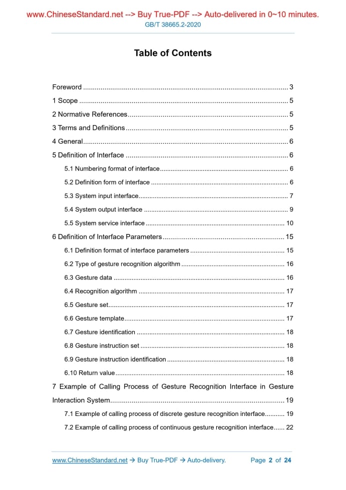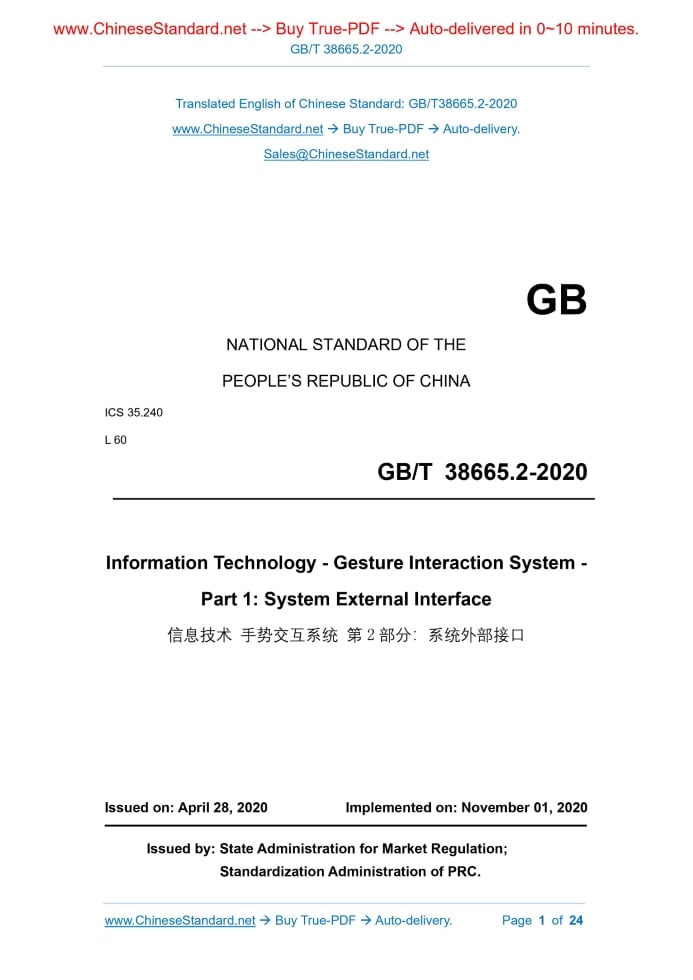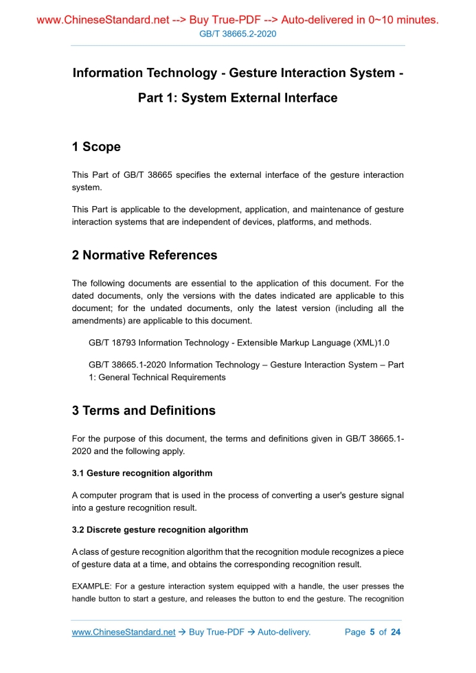Similar standardsGB/T 38665.2-2020: Information Technology - Gesture Interaction System - Part 1: System External Interface---This is an excerpt. Full copy of true-PDF in English version (including equations, symbols, images, flow-chart, tables, and figures etc.), auto-downloaded/delivered in 9 seconds, can be purchased online: https://www.ChineseStandard.net/PDF.aspx/GBT38665.2-2020 NATIONAL STANDARD OF THE PEOPLE’S REPUBLIC OF CHINA ICS 35.240 L 60 Information Technology - Gesture Interaction System - Part 1: System External Interface ISSUED ON: APRIL 28, 2020 IMPLEMENTED ON: NOVEMBER 01, 2020 Issued by: State Administration for Market Regulation; Standardization Administration of PRC. Table of ContentsForeword ... 3 1 Scope ... 5 2 Normative References ... 5 3 Terms and Definitions ... 5 4 General ... 6 5 Definition of Interface ... 6 5.1 Numbering format of interface ... 6 5.2 Definition form of interface ... 6 5.3 System input interface ... 7 5.4 System output interface ... 9 5.5 System service interface ... 10 6 Definition of Interface Parameters ... 15 6.1 Definition format of interface parameters ... 15 6.2 Type of gesture recognition algorithm ... 16 6.3 Gesture data ... 16 6.4 Recognition algorithm ... 17 6.5 Gesture set ... 17 6.6 Gesture template ... 17 6.7 Gesture identification ... 18 6.8 Gesture instruction set ... 18 6.9 Gesture instruction identification ... 18 6.10 Return value ... 18 7 Example of Calling Process of Gesture Recognition Interface in Gesture Interaction System ... 19 7.1 Example of calling process of discrete gesture recognition interface ... 19 7.2 Example of calling process of continuous gesture recognition interface ... 22 Information Technology - Gesture Interaction System - Part 1: System External Interface1 ScopeThis Part of GB/T 38665 specifies the external interface of the gesture interaction system. This Part is applicable to the development, application, and maintenance of gesture interaction systems that are independent of devices, platforms, and methods.2 Normative ReferencesThe following documents are essential to the application of this document. For the dated documents, only the versions with the dates indicated are applicable to this document; for the undated documents, only the latest version (including all the amendments) are applicable to this document. GB/T 18793 Information Technology - Extensible Markup Language (XML)1.0 GB/T 38665.1-2020 Information Technology – Gesture Interaction System – Part 1: General Technical Requirements3 Terms and DefinitionsFor the purpose of this document, the terms and definitions given in GB/T 38665.1- 2020 and the following apply. 3.1 Gesture recognition algorithm A computer program that is used in the process of converting a user's gesture signal into a gesture recognition result. 3.2 Discrete gesture recognition algorithm A class of gesture recognition algorithm that the recognition module recognizes a piece of gesture data at a time, and obtains the corresponding recognition result. EXAMPLE: For a gesture interaction system equipped with a handle, the user presses the handle button to start a gesture, and releases the button to end the gesture. The recognition Number: 2-2 Description: onGestureStarted(void): void Function: This interface is used to indicate a gesture activation. When the used recognition algorithm is a discrete gesture recognition algorithm (see 3.2), the callback shall be triggered once when the starting instruction provided by the input device is obtained; and then it is no longer triggered; and it may be triggered again after the gesture completion or the gesture cancelation. When the used recognition algorithm is a continuous gesture recognition algorithm (see 3.3), this interface shall trigger a callback once when the input device begins to provide gesture data; and then it is no longer triggered; and it may be triggered again after any gesture is successfully recognized. Main implementation process: This interface exists in the form of a callback function. Under the condition of discrete recognition, it may be implemented based on the hardware events provided by the operating system. Under the condition of continuous recognition, it may be implemented based on the hardware events and gesture recognition results provided by the operating system. Input parameters: no definition. Output parameters: no definition. 5.3.3 Gesture completion Number: 2-3 Description: onGestureFinished(void): void Function: This interface is used to indicate a gesture completion. When the used recognition algorithm is a discrete gesture recognition algorithm (see 3.2), after the start of the gesture, the callback is triggered when the end command provided by the input device is obtained. When the used recognition algorithm is a continuous gesture recognition algorithm (see 3.3), after the start of the gesture, a callback is triggered when any gesture is successfully recognized. Main implementation process: This interface exists in the form of a callback function. Under discrete recognition conditions, it may be implemented based on hardware events provided by the operating system. Under continuous recognition conditions, it may be implemented based on gesture recognition results. Input parameters: no definition. Output parameters: no definition. 5.3.4 Gesture cancelation Function: The gesture interaction system shall provide at least one feedback method among visual, auditory, tactile, etc., and notify the user of the execution result after the gesture input. The main realization process: determine the gesture recognition results; and use the hardware supported by the system to provide corresponding feedback for each recognition result. EXAMPLE: When gesture recognition fails (not successfully recognized any gesture in the gesture set), the drive speaker emits a "deng" failure prompt tone. Input parameters: gestureId, recognized gesture identification, see 6.7. Output parameters: return value, et