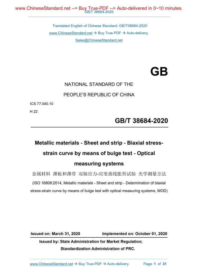 GB/T 38684-2020: Metallic materials - Sheet and strip - Biaxial stress-strain curve by means of bulge test - Optical measuring systems Delivery: 9 seconds. True-PDF full-copy in English & invoice will be downloaded + auto-delivered via email. See step-by-step procedure Status: Valid