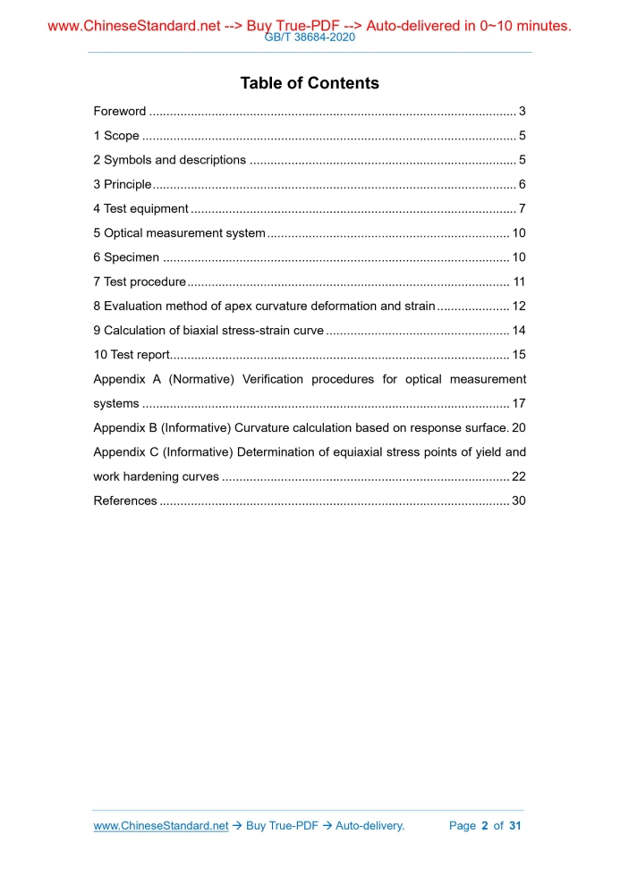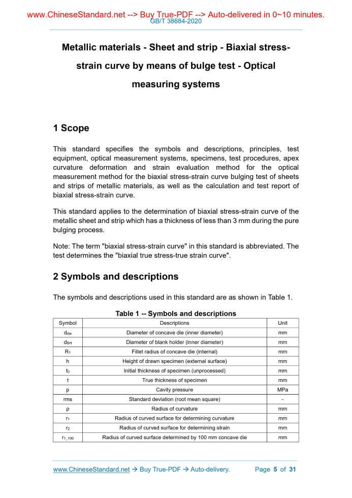 Similar standardsGB/T 38684-2020: Metallic materials - Sheet and strip - Biaxial stress-strain curve by means of bulge test - Optical measuring systems---This is an excerpt. Full copy of true-PDF in English version (including equations, symbols, images, flow-chart, tables, and figures etc.), auto-downloaded/delivered in 9 seconds, can be purchased online: https://www.ChineseStandard.net/PDF.aspx/GBT38684-2020 NATIONAL STANDARD OF THE PEOPLE’S REPUBLIC OF CHINA ICS 77.040.10 H 22 Metallic materials - Sheet and strip - Biaxial stress- strain curve by means of bulge test - Optical measuring systems (ISO 16808:2014, Metallic materials - Sheet and strip - Determination of biaxial stress-strain curve by means of bulge test with optical measuring systems, MOD) ISSUED ON: MARCH 31, 2020 IMPLEMENTED ON: OCTOBER 01, 2020 Issued by: State Administration for Market Regulation; Standardization Administration of PRC. Table of ContentsForeword ... 3 1 Scope ... 5 2 Symbols and descriptions ... 5 3 Principle ... 6 4 Test equipment ... 7 5 Optical measurement system ... 10 6 Specimen ... 10 7 Test procedure ... 11 8 Evaluation method of apex curvature deformation and strain ... 12 9 Calculation of biaxial stress-strain curve ... 14 10 Test report ... 15 Appendix A (Normative) Verification procedures for optical measurement systems ... 17 Appendix B (Informative) Curvature calculation based on response surface . 20 Appendix C (Informative) Determination of equiaxial stress points of yield and work hardening curves ... 22 References ... 30 Metallic materials - Sheet and strip - Biaxial stress- strain curve by means of bulge test - Optical measuring systems1 ScopeThis standard specifies the symbols and descriptions, principles, test equipment, optical measurement systems, specimens, test procedures, apex curvature deformation and strain evaluation method for the optical measurement method for the biaxial stress-strain curve bulging test of sheets and strips of metallic materials, as well as the calculation and test report of biaxial stress-strain curve. This standard applies to the determination of biaxial stress-strain curve of the metallic sheet and strip which has a thickness of less than 3 mm during the pure bulging process. Note: The term "biaxial stress-strain curve" in this standard is abbreviated. The test determines the "biaxial true stress-true strain curve".2 Symbols and descriptionsThe symbols and descriptions used in this standard are as shown in Table 1. Table 1 -- Symbols and descriptions Symbol Descriptions Unit ddie Diameter of concave die (inner diameter) mm dBH Diameter of blank holder (inner diameter) mm R1 Fillet radius of concave die (internal) mm h Height of drawn specimen (external surface) mm t0 Initial thickness of specimen (unprocessed) mm t True thickness of specimen mm p Cavity pressure MPa rms Standard deviation (root mean square) - ρ Radius of curvature mm r1 Radius of curved surface for determining curvature mm r2 Radius of curved surface for determining strain mm r1_100 Radius of curved surface determined by 100 mm concave die mm coordinate of a grid point on the surface of the bulged specimen, thereby calculating the shape change and true strain curve of the bulging center area of the specimen. 4.3 During the test, the system shall be able to determine the XYZ coordinates (non-contact) of the grid points on the surface of the bulged specimen through the optical system; use these coordinates to calculate the true strain ε1 and ε2 of each grid point in the selected area, the thickness direction strain ε3, as well as the curvature radius ρ of the dome of the bulging specimen. 4.4 The system should be equipped with a fluid pressure measurement system or an indirect measurement system. Starting from 20% of the maximum range of the system, the accuracy of the measurement system should meet level 1 requirements. 4.5 The concave die, blank holder and liquid cavity shall have sufficient rigidity, to ensure the minimum deformation of these parts during the test. The blank holding force shall be high enough to ensure the tightness of the blank holder. The specimen shall not move between the blank holder and the concave die. Usually during the test, the bulging pressure will weaken the blank holding force. When determining the blank holding force required for the test, it shall consider the effect of this effect on the blank holding force. 4.6 The fluid medium for pressurization shall be in full contact with the surface of the specimen (no bubbles), to prevent the occurrence of high energy pressure release or oil splash due to the energy storage effect of the compressed air bubbles at the moment of energy release or rupture. During the test, until the specimen ruptures, the fluid shall not leak through the blank holder, concave die, or plate and anywhere else. 4.7 It is recommended to use calendering ribs (or devices with similar shapes on a round surface) to prevent material flow. The use of calendering ribs shall not cause the material to crack. The position of the calendering rib can be located between the concave die and the blank holder. The size of the calendering ribs should avoid blocking the material from flowing during the test, thereby causing excessive bending and wrinkling of the material. 4.8 It is recommended to place a glass plate in front of the lens and lighting equipment, to ensure that when the specimen is broken, the splash of test oil will not affect the optical measurement system. The glass plate can be fixed on the blank holder (thick glass) or placed in front of the lens and lighting system (thin glass), as shown in Figure 3. This plug-in protection device shall not affect the measurement quality of the optical measurement system. After each test, the glass plate shall be wiped clean to avoid damage or scratches; Meanwhile it shall be accurately placed back to the original position so that no recalibration of the measurement system is required. In order 