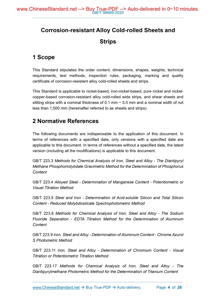 Similar standardsGB/T 38689-2020: Corrosion-resistant Alloy Cold-rolled Sheets and Strips---This is an excerpt. Full copy of true-PDF in English version (including equations, symbols, images, flow-chart, tables, and figures etc.), auto-downloaded/delivered in 9 seconds, can be purchased online: https://www.ChineseStandard.net/PDF.aspx/GBT38689-2020NATIONAL STANDARD OF THE PEOPLE’S REPUBLIC OF CHINA ICS 77.140.50 H 59 Corrosion-resistant Alloy Cold-rolled Sheets and Strips ISSUED ON: MARCH 31, 2020 IMPLEMENTED ON: OCTOBER 1, 2020 Issued by: State Administration for Market Regulation; Standardization Administration of the People’s Republic of China. Table of ContentsForeword ... 3 1 Scope ... 4 2 Normative References ... 4 3 Order Content ... 7 4 Dimensions, Shapes and Weights ... 7 5 Technical Requirements ... 13 6 Test Methods ... 11 7 Inspection Rules ... 11 8 Packaging, Marking and Quality Certificate ... 12 Appendix A (informative) Recommended Thermal Treatment Temperatures for Corrosion-resistant Alloy Designations ... 13 Corrosion-resistant Alloy Cold-rolled Sheets and Strips1 ScopeThis Standard stipulates the order content, dimensions, shapes, weights, technical requirements, test methods, inspection rules, packaging, marking and quality certificate of corrosion-resistant alloy cold-rolled sheets and strips. This Standard is applicable to nickel-based, iron-nickel-based, pure nickel and nickel- copper-based corrosion-resistant alloy cold-rolled wide strips, and shear sheets and slitting strips with a nominal thickness of 0.1 mm ~ 5.0 mm and a nominal width of not less than 1,500 mm (hereinafter referred to as sheets and strips).2 Normative ReferencesThe following documents are indispensable to the application of this document. In terms of references with a specified date, only versions with a specified date are applicable to this document. In terms of references without a specified date, the latest version (including all the modifications) is applicable to this document. GB/T 223.3 Methods for Chemical Analysis of Iron, Steel and Alloy - The Diantipyryl Methane Phosphomolybdate Gravimetric Method for the Determination of Phosphorus Content GB/T 223.4 Alloyed Steel - Determination of Manganese Content - Potentiometric or Visual Titration Method GB/T 223.5 Steel and Iron - Determination of Acid-soluble Silicon and Total Silicon Content - Reduced Molybdosilicate Spectrophotometric Method GB/T 223.8 Methods for Chemical Analysis of Iron, Steel and Alloy - The Sodium Fluoride Separation - EDTA Titration Method for the Determination of Aluminum Content GB/T 223.9 Iron, Steel and Alloy - Determination of Aluminum Content - Chrome Azurol S Photometric Method GB/T 223.11 Iron, Steel and Alloy - Determination of Chromium Content - Visual Titration or Potentiometric Titration Method GB/T 223.17 Methods for Chemical Analysis of Iron, Steel and Alloy - The Diantipyrylmethane Photometric Method for the Determination of Titanium Content GB/T 223.20 Methods for Chemical Analysis of Iron, Steel and Alloy - The Potentiometric Titration Method for the Determination of Cobalt Content GB/T 223.25 Methods for Chemical Analysis of Iron, Steel and Alloy - The Dimethylglyoxime Gravimetric Method for the Determination of Nickel Content GB/T 223.28 Methods for Chemical Analysis of Iron, Steel and Alloy - The - benzoinoxime Gravimetric Method for the Determination of Molybdenum Content GB/T 223.29 Iron, Steel and Alloy - Determination of Lead Content - Carrier Precipitation-xylenol Orange Spectrophotometric Method GB/T 223.30 Methods for Chemical Analysis of Iron, Steel and Alloy - The Arsenazo III Spectrophotometric Method for the Determination of Zirconium Content after Separation by P-bromomandelic Acid GB/T 223.36 Methods for Chemical Analysis of Iron, Steel and Alloy - The Neutral Titration Method for the Determination of Nitrogen Content after Distillation Separation GB/T 223.38 Methods for Chemical Analysis of Iron, Steel and Alloy - The Anion- exchange Separation-gravimetric Method for the Determination of Niobium Content GB/T 223.40 Iron, Steel and Alloy - Determination of Niobium Content by the Sulphochlorophenol S Spectrophotometric Method GB/T 223.42 Methods for Chemical Analysis of Iron, Steel and Alloy - The Anion- exchange Separation-bromopyrogallol Red Photometric Method for the Determination of Tantalum Content GB/T 223.43 Iron, Steel and Alloy - Determination of Tungsten Content - Gravimetric Method and Spectrophotometric Method GB/T 223.50 Methods for Chemical Analysis of Iron, Steel and Alloy - The Phenylfluorone-CTMAB Direct Photometric Method for the Determination of Tin Content GB/T 223.65 Steel, Iron and Alloy - Determination of Cobalt Content - Flame Atomic Absorption Spectrometric Method GB/T 223.72 Iron, Steel and Alloy - Determination of Sulfur Content - Gravimetric Method GB/T 223.73 Iron, Steel and Alloy - Determination of Iron Contents - Titanium Trichloride-potassium Dichromate Titration Method GB/T 223.76 Methods for Chemical Analysis of Iron, Steel and Alloy - The Flame Atomic Absorption Spectrometric Method for the Determination of Vanadium Content GB/T 36164 High Alloy Steel - Determination of Multi-element Contents - X-ray Fluorescence Spectrometry (routine method) YB/T 4395 Steel Determination of Molybdenum, Niobium and Tungsten Contents - Inductively Coupled Plasma Atomic Emission Spectrometric Method YS/T 325.2 Methods for Chemical Analysis of Nickel-copper Alloy - Part 2: Determination of Copper Content - Electrolysis Weight Method3 Order ContentContracts or orders placing orders in accordance with this Standard shall at least include the following content: a) Serial No. of this Standard; b) Product name (or trade name); c) Uniform digital code or alloy designation; d) Accuracy of dimensions and shapes (see Chapter 4); e) Weight or quantity; f) Smelting method (see 5.2); g) Delivery state (see 5.3); h) Special requirements (see 5.7).4 Dimensions, Shapes and Weights