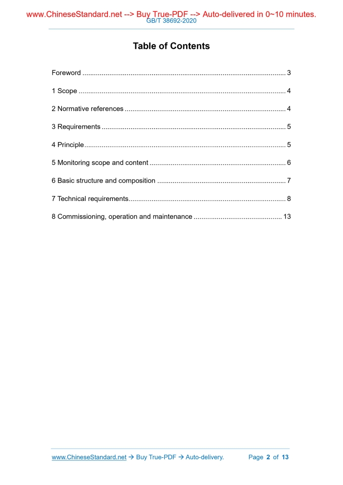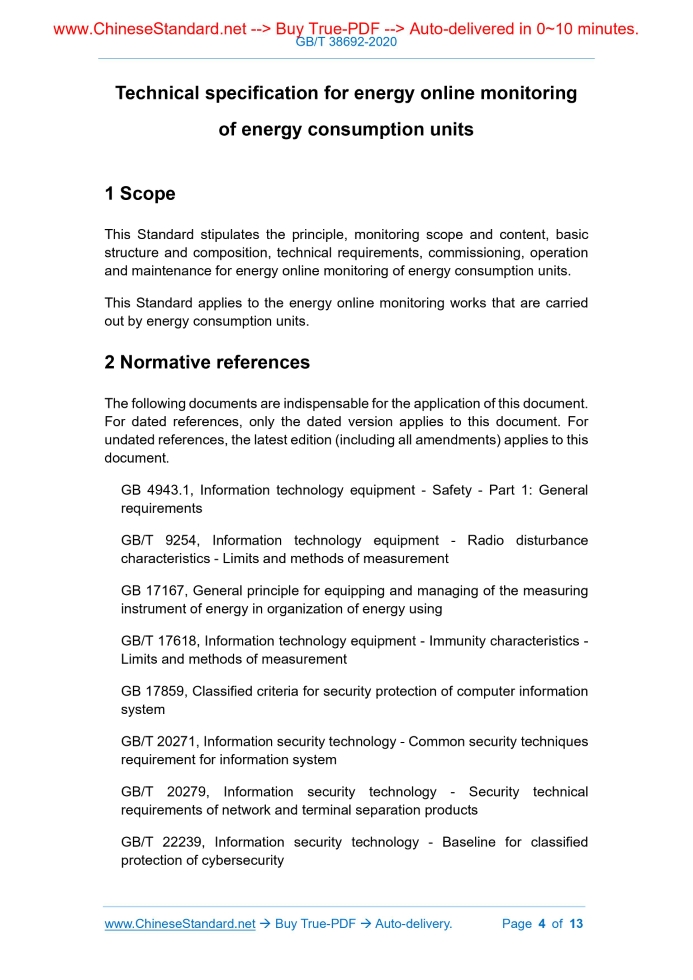 Similar standardsGB/T 38692-2020: Technical specification for energy online monitoring of energy consumption units---This is an excerpt. Full copy of true-PDF in English version (including equations, symbols, images, flow-chart, tables, and figures etc.), auto-downloaded/delivered in 9 seconds, can be purchased online: https://www.ChineseStandard.net/PDF.aspx/GBT38692-2020NATIONAL STANDARD OF THE PEOPLE’S REPUBLIC OF CHINA ICS 27.010 F 01 Technical specification for energy online monitoring of energy consumption units ISSUED ON: MARCH 31, 2020 IMPLEMENTED ON: OCTOBER 01, 2020 Issued by: State Administration for Market Regulation; Standardization Administration of the People’s Republic of China. Table of ContentsForeword ... 3 1 Scope ... 4 2 Normative references ... 4 3 Requirements ... 5 4 Principle ... 5 5 Monitoring scope and content ... 6 6 Basic structure and composition ... 7 7 Technical requirements ... 8 8 Commissioning, operation and maintenance ... 13 Technical specification for energy online monitoring of energy consumption units1 ScopeThis Standard stipulates the principle, monitoring scope and content, basic structure and composition, technical requirements, commissioning, operation and maintenance for energy online monitoring of energy consumption units. This Standard applies to the energy online monitoring works that are carried out by energy consumption units.2 Normative referencesThe following documents are indispensable for the application of this document. For dated references, only the dated version applies to this document. For undated references, the latest edition (including all amendments) applies to this document. GB 4943.1, Information technology equipment - Safety - Part 1: General requirements GB/T 9254, Information technology equipment - Radio disturbance characteristics - Limits and methods of measurement GB 17167, General principle for equipping and managing of the measuring instrument of energy in organization of energy using GB/T 17618, Information technology equipment - Immunity characteristics - Limits and methods of measurement GB 17859, Classified criteria for security protection of computer information system GB/T 20271, Information security technology - Common security techniques requirement for information system GB/T 20279, Information security technology - Security technical requirements of network and terminal separation products GB/T 22239, Information security technology - Baseline for classified protection of cybersecurity The planning, layout and design of the energy online monitoring of energy consumption units shall lay emphasis on systematism, and carry out scientific planning and overall planning in accordance with the relevant requirements of national energy conservation management and the needs of its own energy management and information development. 4.3 Reliability The energy online monitoring of energy consumption units shall be comprehensively considered from the aspects of system structure, technical measures, equipment selection, installation verification, to ensure that the system operates stably and is easy to maintain and manage. 4.4 Normalization The energy online monitoring of energy consumption units shall comply with the requirements of relevant laws, regulations, standards, to strengthen resource integration, and achieve coordinated docking and data sharing. 4.5 Advancement The energy online monitoring of energy consumption units shall make full use of existing advanced and mature technologies, and consider compatibility with other information systems, reserve upgrade and expansion interfaces, to ensure long-term effective operation.5 Monitoring scope and content5.1 Monitoring scope The energy online monitoring of energy consumption units shall reflect the characteristics of its energy consumption, perform online monitoring of the entire energy consumption process of purchase, storage, processing conversion, transportation and distribution, and terminal use, and cover the key nodes of energy in and out, distribution, and utilization, and key energy consumption equipment. 5.2 Monitoring content The core contents of energy online monitoring of energy consumption units are energy procurement, transmission and consumption related data, which can be divided into the following two categories: a) consumption and state parameter of various energy and energy-delivering materials; b) relevant parameters of energy consumption equipment/ units/ systems.7 Technical requirements7.1 General requirements 7.1.1 The implementation of energy online monitoring shall not change the integrity of the original energy-consuming equipment, nor shall it affect the normal operation of the original energy-consuming equipment. 7.1.2 The energy consumption unit shall select an appropriate configuration scheme, and carry out energy online monitoring, according to its own basic conditions, actual needs, maintenance and input costs, and the like, 7.1.3 The hardware equipment shall follow the principles of easy installation, easy maintenance, and high reliability. An integrated structure can be adopted to meet the installation environmental conditions. It shall have better capacity of resisting disturbance and reasonable monitoring sensitivity; the monitoring result shall have better reliability, repeatability and reasonable accuracy. 7.1.4 The software system shall have a good man-machine interface; it shall be simple to operate, and easy to use; it shall support various functions of data access and management, and has scalability and secondary development functions; it shall adapt to the continuous development of energy online monitoring, operation and management. 7.1.5 The communication network shall make full use of the existing network resources, and select the communication medium and networking method according to the size of the energy consumption unit and the environmental conditions. 7.1.6 The data transmission shall be provided with a checki