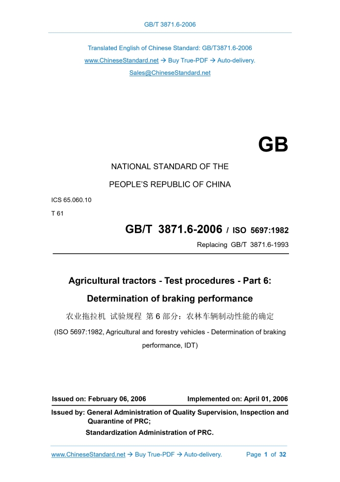 GB/T 3871.6-2006: Agricultural tractors -- Test procedures -- Part 6: Determination of braking performance Delivery: 9 seconds. True-PDF full-copy in English & invoice will be downloaded + auto-delivered via email. See step-by-step procedure Status: Valid GB/T 3871.6: Historical versions
