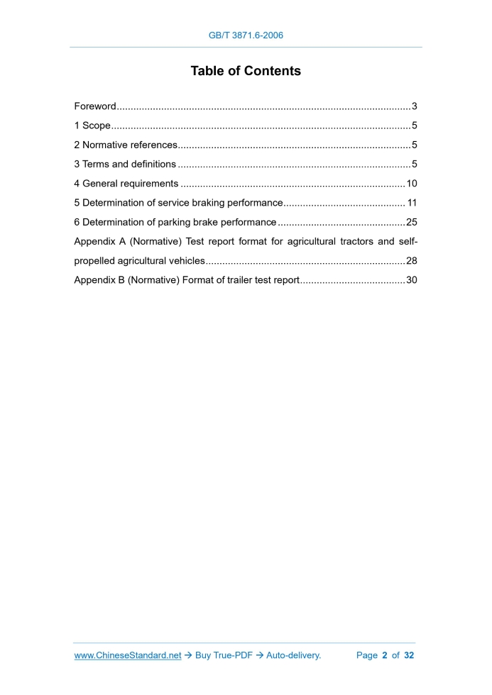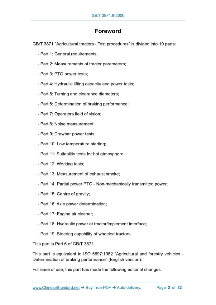 Similar standardsGB/T 3871.6-2006: Agricultural tractors -- Test procedures -- Part 6: Determination of braking performance---This is an excerpt. Full copy of true-PDF in English version (including equations, symbols, images, flow-chart, tables, and figures etc.), auto-downloaded/delivered in 9 seconds, can be purchased online: https://www.ChineseStandard.net/PDF.aspx/GBT3871.6-2006 GB NATIONAL STANDARD OF THE PEOPLE’S REPUBLIC OF CHINA ICS 65.060.10 T 61 GB/T 3871.6-2006 / ISO 5697:1982 Replacing GB/T 3871.6-1993 Agricultural tractors - Test procedures - Part 6: Determination of braking performance (ISO 5697:1982, Agricultural and forestry vehicles - Determination of braking performance, IDT) ISSUED ON: FEBRUARY 06, 2006 IMPLEMENTED ON: APRIL 01, 2006 Issued by: General Administration of Quality Supervision, Inspection and Quarantine of PRC; Standardization Administration of PRC. Table of ContentsForeword ... 3 1 Scope ... 5 2 Normative references ... 5 3 Terms and definitions ... 5 4 General requirements ... 10 5 Determination of service braking performance ... 11 6 Determination of parking brake performance ... 25 Appendix A (Normative) Test report format for agricultural tractors and self- propelled agricultural vehicles ... 28 Appendix B (Normative) Format of trailer test report ... 30ForewordGB/T 3871 "Agricultural tractors - Test procedures" is divided into 19 parts: - Part 1: General requirements; - Part 2: Measurements of tractor parameters; - Part 3: PTO power tests; - Part 4: Hydraulic lifting capacity and power tests; - Part 5: Turning and clearance diameters; - Part 6: Determination of braking performance; - Part 7: Operators field of vision; - Part 8: Noise measurement; - Part 9: Drawbar power tests; - Part 10: Low temperature starting; - Part 11: Suitability tests for hot atmosphere; - Part 12: Working tests; - Part 13: Measurement of exhaust smoke; - Part 14: Partial power PTO - Non-mechanically transmitted power; - Part 15: Centre of gravity; - Part 16: Axle power determination; - Part 17: Engine air cleaner; - Part 18: Hydraulic power at tractor/implement interface; - Part 19: Steering capability of wheeled tractors. This part is Part 6 of GB/T 3871. This part is equivalent to ISO 5697:1982 "Agricultural and forestry vehicles - Determination of braking performance" (English version). For ease of use, this part has made the following editorial changes: - CHANGE the term "this International Standard" into "this Part"; - USE a decimal point "." to replace the comma ",", which was used as a decimal point; - DELETE the foreword of the international standard; - MODIFY the drawings in the standard, according to China’s drawing habits. This part replaces GB/T 3871.6-1993 "Test methods for agricultural wheeled and tracking tractors - Part 6: Braking tests". In addition to editorial changes during the revision, the main changes in this part, as compared with GB/T 3871.6-1993, are as follows: - CHANGE the name of the standard from "Test methods for agricultural wheeled and tracking tractors" to "Agricultural tractor - Test procedures"; - ADD the terms and definitions of nouns; - REFER to the latest version of the standard, in the normative references; - ADD the test method for vehicles, which have speeds exceeding 35 km/h; - ADD the Appendix A and Appendix B; - ADD the test content of Recovery test - Category 3, Attenuation test - Category 2, Recovery test - Category 3 for optional items; - ADD the braking performance test methods for trailers and tractor units. Appendix A and Appendix B of this Part are normative appendixes. This part was proposed by China Machinery Industry Federation. This part shall be under the jurisdiction of the National Tractor Standardization Technical Committee. Drafting organizations of this Part: Agricultural Machinery Testing and Appraisal Station of the Ministry of Agriculture, National Tractor Quality Supervision and Inspection Center, Luoyang Tractor Research Institute. The main drafters of this Part: Jiao Gang, Li Jingzhong, Xu Zhijian, Lang Zhizhong, Shang Xiangsheng, Shi Guoquan. This standard replaces the standard previously issued as follows: - GB/T 3871.6-1983, GB/T 3871.6-1993. Agricultural tractors - Test procedures - Part 6: Determination of braking performance1 ScopeThis Part of GB/T 3871 specifies the test methods, for the braking performance of agricultural tractors, self-propelled agricultural vehicles, trailers, traction agricultural machinery. This Part applies to agricultural tractors, self-propelled agricultural vehicles, trailers, traction agricultural machinery.2 Normative referencesThe provisions in following documents become the provisions of this Part through reference in this Part of GB/T 3871. For the dated references, the subsequent amendments (excluding corrections) or revisions do not apply to this Part; however, parties who reach an agreement based on this Part are encouraged to study if the latest versions of these documents are applicable. For undated references, the latest edition of the referenced document applies. ISO 3965 Agricultural wheeled tractors - Maximum speeds - Method of determination3 Terms and definitionsThe following terms and definitions apply to this Part of GB/T 3871. 3.1 Agricultural tractor A self-propelled wheeled or crawler machine, which has at least two shafts. It is mainly used for traction, propulsion, carrying, driving of machinery for agricultural (including forestry) operations. The machine can be equipped with a detachable platform. 3.2 Self-propelled agricultural vehicle In addition to tractors, any vehicles that have their own driving devices AND ......Source: Above contents are excerpted from the full-copy PDF -- translated/reviewed by: www.ChineseStandard.net / Wayne Zheng et al. Tips & Frequently Asked Questions:Question 1: How long will the true-PDF of English version of GB/T 3871.6-2006 be delivered?Answer: The full copy PDF of English version of GB/T 3871.6-2006 can be downloa