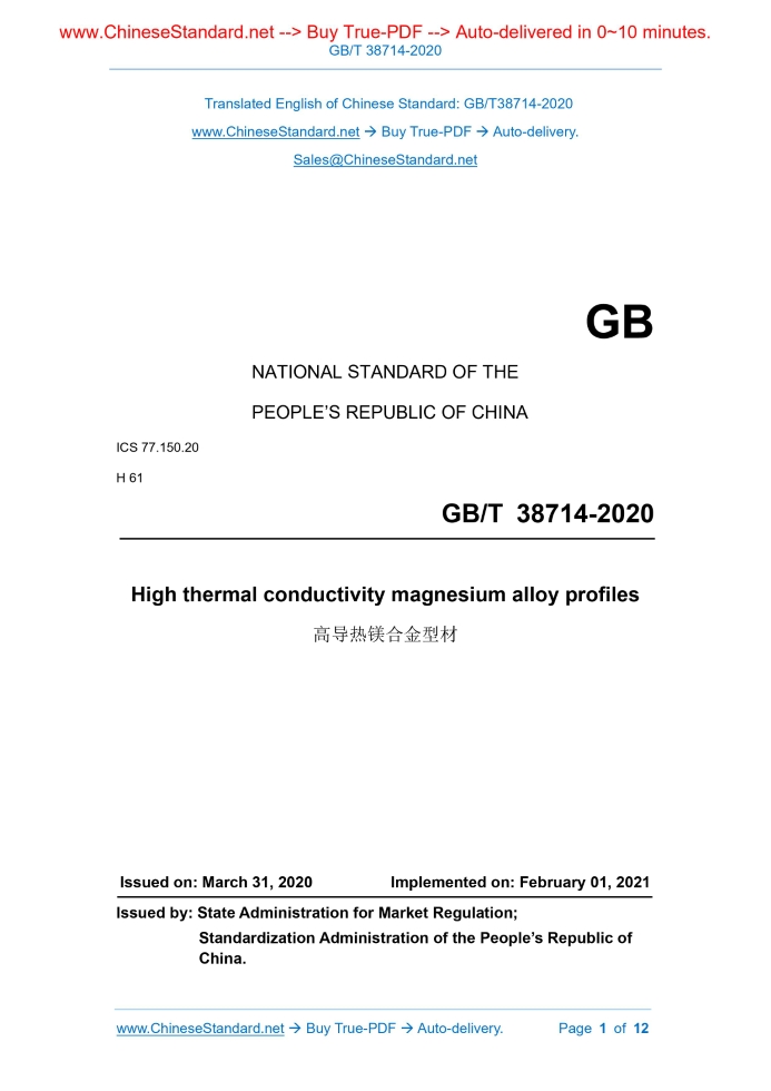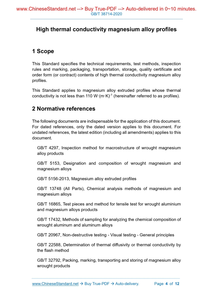 Similar standardsGB/T 38714-2020: High thermal conductivity magnesium alloy profiles---This is an excerpt. Full copy of true-PDF in English version (including equations, symbols, images, flow-chart, tables, and figures etc.), auto-downloaded/delivered in 9 seconds, can be purchased online: https://www.ChineseStandard.net/PDF.aspx/GBT38714-2020NATIONAL STANDARD OF THE PEOPLE’S REPUBLIC OF CHINA ICS 77.150.20 H 61 High thermal conductivity magnesium alloy profiles ISSUED ON: MARCH 31, 2020 IMPLEMENTED ON: FEBRUARY 01, 2021 Issued by: State Administration for Market Regulation; Standardization Administration of the People’s Republic of China. Table of ContentsForeword ... 3 1 Scope ... 4 2 Normative references ... 4 3 Technical requirements ... 5 4 Test method ... 7 5 Inspection rules ... 7 6 Marking, packaging, transportation, storage and quality certificate ... 10 7 Order form (or contract) contents ... 11 High thermal conductivity magnesium alloy profiles1 ScopeThis Standard specifies the technical requirements, test methods, inspection rules and marking, packaging, transportation, storage, quality certificate and order form (or contract) contents of high thermal conductivity magnesium alloy profiles. This Standard applies to magnesium alloy extruded profiles whose thermal conductivity is not less than 110 W·(m·K)-1 (hereinafter referred to as profiles).2 Normative referencesThe following documents are indispensable for the application of this document. For dated references, only the dated version applies to this document. For undated references, the latest edition (including all amendments) applies to this document. GB/T 4297, Inspection method for macrostructure of wrought magnesium alloy products GB/T 5153, Designation and composition of wrought magnesium and magnesium alloys GB/T 5156-2013, Magnesium alloy extruded profiles GB/T 13748 (All Parts), Chemical analysis methods of magnesium and magnesium alloys GB/T 16865, Test pieces and method for tensile test for wrought aluminium and magnesium alloys products GB/T 17432, Methods of sampling for analyzing the chemical composition of wrought aluminum and aluminum alloys GB/T 20967, Non-destructive testing - Visual testing - General principles GB/T 22588, Determination of thermal diffusivity or thermal conductivity by the flash method GB/T 32792, Packing, marking, transporting and storing of magnesium alloy wrought products 3.7.2 The surface of the profile is allowed to have defects such as squeeze marks, pressure injuries, bumps, bubbles, scrapes, scratches, humps, depressions whose depth does not exceed the negative deviation.4 Test method4.1 Chemical composition Perform the chemical analysis and arbitration of the profile according to the method that is specified in GB/T 13748. 4.2 Dimension deviation Use a measuring equipment of corresponding accuracy to measure the dimension deviation of the product. 4.3 Mechanical property Perform the vertical room temperature mechanical property test method of the profile according to the method that is specified in GB/T 16865. 4.4 Thermal conductivity Measure the thermal conductivity of the profile according to the thermal conductivity method that is specified in GB/T 22588. 4.5 Macro-structure Perform the test method of macro-structure of the profile according to the method that is specified in GB/T 4297. 4.6 Appearance quality Perform the test method of appearance quality of the profile according to the method that is specified in GB/T 20967.5 Inspection rules5.1 Inspection and acceptance 5.1.1 The profile shall be inspected by the supplier to ensure that the profile quality complies with the requirements of this Standard and the order form (or the contract); the supplier shall fill in the quality certificate. 5.1.2 The buyer shall inspect the received profiles in accordance with the provisions of this Standard. If the test result is inconsistent with the provisions of this Standard and the order form (or the contract), a written form shall be submitted to the supplier; the issue shall be decided by negotiation between the supplier and the buyer. Objections of surface quality and external dimensions shall be filed within one month from the date of receipt of the profile; objections of other properties shall be filed within three months from the date of receipt of the profile. If arbitration is required, it shall be determined through negotiation between the supplier and the buyer. 5.2 Batch Profiles shall be submitted for acceptance in batches; each batch shall consist of profiles of the same designation, the same state, the same specification, the same melting time and the same heat treatment furnace. The batch weight is not limited. 5.3 Inspection items 5.3.1 The inspection items and sampling of the profile shall comply with the provisions of Table 4. The inspection items are divided into delivery inspection items and type inspection items. 5.3.2 Each batch of profiles, before being delivered, shall be subjected to inspections of chemical composition, dimension deviation, mechanical properties, macro-structure and appearance quality. 5.3.3 In any of the following situations, type inspection shall be carried out: a) trial-production customization identification of new profiles or old profiles that are transferred to the factory; b) when the material and process of the profile are changed significantly, which may affect the performance of the profile; c) when the structure of the profile is changed significantly; d) when the production of the profile is resumed after a suspension; e) when the delivery inspection result is significantly different from the previous type inspection; f) when no type inspection has been carried out for two consecutive years; g) when it is requested by the buyer; h) when the national quality supervision institutions propose a requirement to carry out type inspection. 6.2 Packaging, transportation and storage 6.2.1 The profiles shall be protected and packed. Whe