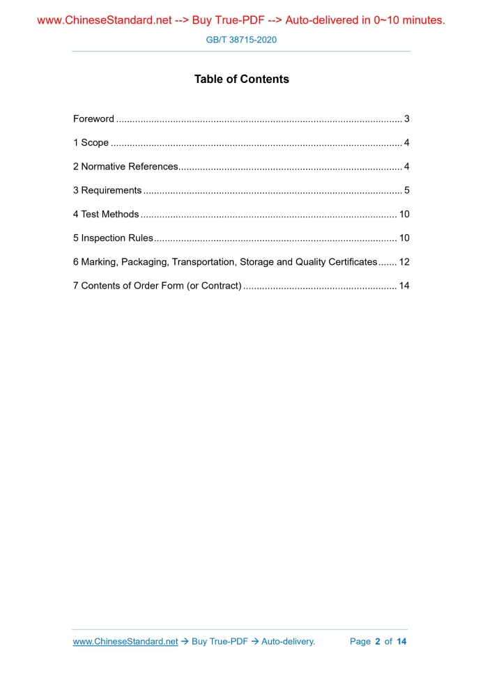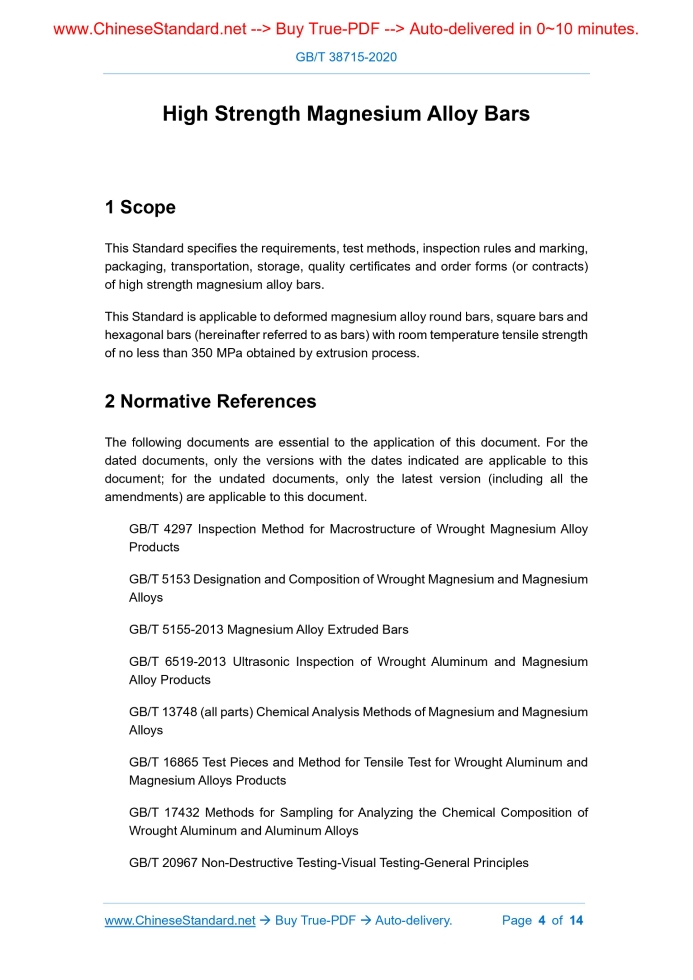 Similar standardsGB/T 38715-2020: High Strength Magnesium Alloy Bars---This is an excerpt. Full copy of true-PDF in English version (including equations, symbols, images, flow-chart, tables, and figures etc.), auto-downloaded/delivered in 9 seconds, can be purchased online: https://www.ChineseStandard.net/PDF.aspx/GBT38715-2020NATIONAL STANDARD OF THE PEOPLE’S REPUBLIC OF CHINA ICS 77.150.20 H 61 High Strength Magnesium Alloy Bars ISSUED ON: MARCH 31, 2020 IMPLEMENTED ON: FEBRUARY 01, 2021 Issued by: State Administration for Market Regulation; Standardization Administration of PRC. Table of ContentsForeword ... 3 1 Scope ... 4 2 Normative References ... 4 3 Requirements ... 5 4 Test Methods ... 10 5 Inspection Rules ... 10 6 Marking, Packaging, Transportation, Storage and Quality Certificates ... 12 7 Contents of Order Form (or Contract) ... 14 High Strength Magnesium Alloy Bars1 ScopeThis Standard specifies the requirements, test methods, inspection rules and marking, packaging, transportation, storage, quality certificates and order forms (or contracts) of high strength magnesium alloy bars. This Standard is applicable to deformed magnesium alloy round bars, square bars and hexagonal bars (hereinafter referred to as bars) with room temperature tensile strength of no less than 350 MPa obtained by extrusion process.2 Normative ReferencesThe following documents are essential to the application of this document. For the dated documents, only the versions with the dates indicated are applicable to this document; for the undated documents, only the latest version (including all the amendments) are applicable to this document. GB/T 4297 Inspection Method for Macrostructure of Wrought Magnesium Alloy Products GB/T 5153 Designation and Composition of Wrought Magnesium and Magnesium Alloys GB/T 5155-2013 Magnesium Alloy Extruded Bars GB/T 6519-2013 Ultrasonic Inspection of Wrought Aluminum and Magnesium Alloy Products GB/T 13748 (all parts) Chemical Analysis Methods of Magnesium and Magnesium Alloys GB/T 16865 Test Pieces and Method for Tensile Test for Wrought Aluminum and Magnesium Alloys Products GB/T 17432 Methods for Sampling for Analyzing the Chemical Composition of Wrought Aluminum and Aluminum Alloys GB/T 20967 Non-Destructive Testing-Visual Testing-General Principles The round bar with designation of AQ80M, status of H112, diameter of 40mm, and length of 3500mm shall be labelled as follows: Round bar GB/T 38715-AQ80M H112- ϕ40×3500 Example 2: The non-scaled hexagonal bar with designation of VW75M, status of T5, inscribed circle diameter of 120mm, accuracy of Level-A shall be labelled as follows: Hexagonal bar GB/T 38715-VW75M T5-120-A 3.2 Quality assurance 3.2.1 Guarantee of raw materials The ingots used for the production of high-strength magnesium alloys shall meet the requirements of the bar composition and macrostructure specified in this Standard; and the other quality requirements of the ingots shall conform to the provisions of YS/T 627. 3.2.2 Guarantee of production process The supplier shall adopt production equipment and extrusion technology to effectively ensure the quality of the bar; and the extrusion ratio shall be no less than 6. 3.3 Chemical composition The chemical composition for the designations of VW93M, VW94M, VW84N, WN54M and VW92 shall conform to the provisions of Table 2; and the chemical composition of other designations shall conform to the provisions of GB/T 5153. 3.8.2 The surface of the bar is allowed to have defects such as squeeze marks, pressure injuries, damages, bubbles, scrapes, scratches, bumps, depressions, etc. with the depth not exceeding the negative deviation.4 Test Methods4.1 Chemical composition The chemical composition analysis method of the bar shall be carried out according to the provisions of GB/T13748 or YS/T1036; and arbitration analysis shall adopt GB/T 13748. 4.2 Dimension deviation Dimension deviation is measured by measuring tools with correspondingly accuracy. 4.3 Tensile mechanical properties at room temperature The test method of the longitudinal mechanical properties of the bar at room temperature shall be carried out according to the method specified in GB/T 16865. 4.4 Macrostructure The test method for the macrostructure of the bar shall be carried out according to the method specified in GB/T 4297. 4.5 Ultrasonic flaw detection The ultrasonic testing method of the bar shall be carried out according to the method specified in GB/T 6519-2013. 4.6 Appearance quality The test method for the appearance quality of the bar shall be carried out according to the method specified in GB/T 20967.5 Inspection Rules5.1 Inspection and acceptance 5.1.1 The bar shall be inspected by the supplier to ensure that the product quality meets the requirements of this Standard and the purchase order (or contract), and fill in the quality certificate. determined to be unqualified. 5.5.2 If the dimension deviation is unqualified, such piece of bar is determined to be unqualified. 5.5.3 When the mechanical property of any sample is unqualified, a double number of samples shall be taken from the batch of bars for repeated inspection. If all the repeated inspection results are qualified, such batch of products shall be determined to be qualified. If there are still unqualified samples in the repeated inspection results, such batch of products shall be determined to be unqualified. 5.5.4 When the macrostructure of any sample is unqualified, it shall be determined as follows: a) If it is unqualified due to the cracks, oxide film, metal compound and manganese compound segregation, such batch shall be rejected. b) If it is unqualified due to tail shrinkage, coarse crystal ring, bright ring and stratification, it is allowed to cut a certain length of the unqualified bar and repeat the inspection until it is qualified. The remaining bars may be inspected one by one; only the qualified shall be delivered; or they may be delivered according to the re-inspectio