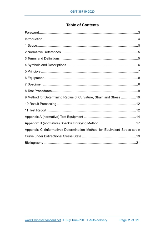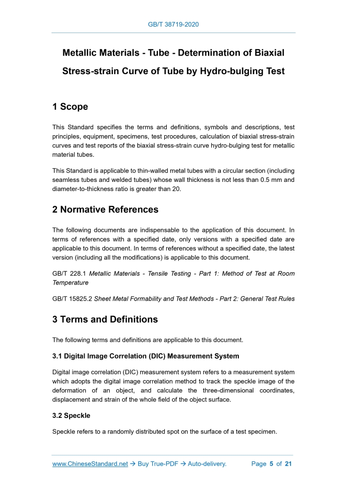 Similar standardsGB/T 38719-2020: Metallic Materials - Tube - Determination of Biaxial Stress-strain Curve of Tube by Hydro-bulging Test---This is an excerpt. Full copy of true-PDF in English version (including equations, symbols, images, flow-chart, tables, and figures etc.), auto-downloaded/delivered in 9 seconds, can be purchased online: https://www.ChineseStandard.net/PDF.aspx/GBT38719-2020 GB NATIONAL STANDARD OF THE PEOPLE’S REPUBLIC OF CHINA ICS 77.040.10 H 22 Metallic Materials - Tube - Determination of Biaxial Stress-strain Curve of Tube by Hydro-bulging Test ISSUED ON: MARCH 31, 2020 IMPLEMENTED ON: OCTOBER 1, 2020 Issued by: State Administration for Market Regulation; Standardization Administration of the People’s Republic of China. Table of ContentsForeword ... 3 Introduction ... 4 1 Scope ... 5 2 Normative References ... 5 3 Terms and Definitions ... 5 4 Symbols and Descriptions ... 6 5 Principle ... 7 6 Equipment ... 8 7 Specimen ... 8 8 Test Procedures ... 9 9 Method for Determining Radius of Curvature, Strain and Stress ... 10 10 Result Processing ... 12 11 Test Report ... 12 Appendix A (normative) Test Equipment ... 14 Appendix B (normative) Speckle Spraying Method ... 17 Appendix C (informative) Determination Method for Equivalent Stress-strain Curve under Bidirectional Stress State ... 19 Bibliography ... 21 Metallic Materials - Tube - Determination of Biaxial Stress-strain Curve of Tube by Hydro-bulging Test1 ScopeThis Standard specifies the terms and definitions, symbols and descriptions, test principles, equipment, specimens, test procedures, calculation of biaxial stress-strain curves and test reports of the biaxial stress-strain curve hydro-bulging test for metallic material tubes. This Standard is applicable to thin-walled metal tubes with a circular section (including seamless tubes and welded tubes) whose wall thickness is not less than 0.5 mm and diameter-to-thickness ratio is greater than 20.2 Normative ReferencesThe following documents are indispensable to the application of this document. In terms of references with a specified date, only versions with a specified date are applicable to this document. In terms of references without a specified date, the latest version (including all the modifications) is applicable to this document. GB/T 228.1 Metallic Materials - Tensile Testing - Part 1: Method of Test at Room Temperature GB/T 15825.2 Sheet Metal Formability and Test Methods - Part 2: General Test Rules3 Terms and DefinitionsThe following terms and definitions are applicable to this document. 3.1 Digital Image Correlation (DIC) Measurement System Digital image correlation (DIC) measurement system refers to a measurement system which adopts the digital image correlation method to track the speckle image of the deformation of an object, and calculate the three-dimensional coordinates, displacement and strain of the whole field of the object surface. 3.2 Speckle Speckle refers to a randomly distributed spot on the surface of a test specimen. Where, L0 = (1.0 ~ 3.0) D0; L0 = 1.5 D0 is recommended. 7.3 The end of the specimen shall be deburred and smoothly polished. There shall be no initial cracks, or relatively deep and sharp scratches. In addition, during the preparation of the specimen, it shall be ensured that the surface of the specimen is not damaged (defects like scratches and cracks, etc.). 7.4 The outer surface of the specimen shall be cleaned, so as to spray speckles. The specific spraying method and precautions are shown in Appendix B. 7.5 During the preparation of the specimen, the specimen shall be prevented from being deformed.8 Test Procedures8.1 During the test, the test temperature shall be recorded. The test is generally conducted at room temperature 10 °C ~ 35 °C. 8.2 Measure the initial wall thickness and initial outer diameter of the specimen. Along the circumferential direction, measure 8 points at equal intervals. The resolution of the measuring tool shall be not lower than 0.01 mm. 8.3 Carry out necessary cleaning and examination of the molds and test devices used in the test. In addition, check whether the pressure control system can normally operate and whether the pressure line has any leakage. 8.4 Before the test, under no-load conditions, check whether the equipment can normally operate; check whether the plug head and the sealing section of the mold fit well. 8.5 Place the prepared specimen into the mold. After mold clamping, use the plug for flaring and sealing. 8.6 In accordance with the wall thickness distribution measured in 8.2, determine the area of the thinnest point and mark it, so that the intermediate point of the bulging zone can be found when the DIC measurement system is used to analyze the data. 8.7 Pre-fill liquid (emulsified liquid or hydraulic oil) into the specimen to remove the gas inside the specimen. Then, increase the plug thrust to achieve sealing of the tube end. 8.8 Use a pressure sensor to measure the liquid pressure during the test. 8.9 Use the DIC measurement system to synchronously measure the speckle image of the surface of the specimen during the test with 8.8. 8.10 In accordance with the same time scale, record and save the pressure data in the specimen and the deformation data measured by the DIC measurement system. It is recommended to record at least 60 sets of data every minute. In order to ensure a sufficient data size, at least 100 images shall be taken during the bulging test. 8.11 In accordance with a certain pressure increase rate (0.05 MPa/s ~ 0.1 MPa/s is recommended), load until the specimen ruptures. Then, end the test; record the burst pressure value; save the test data. 8.12 In order to ensure that at least 3 valid test results are obtained, a sufficient number of specimens shall be prepared.9 Method for Determining Radius of Curvature, Strainand Stress 9.1 Radius of Curvature (zp, p) The required radius of curvature is the axial and circumferential radius of curvature of the i
