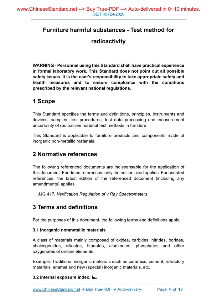 GB/T 38724-2020: Furniture harmful substances - Test method for radioactivity Delivery: 9 seconds. True-PDF full-copy in English & invoice will be downloaded + auto-delivered via email. See step-by-step procedure Status: Valid