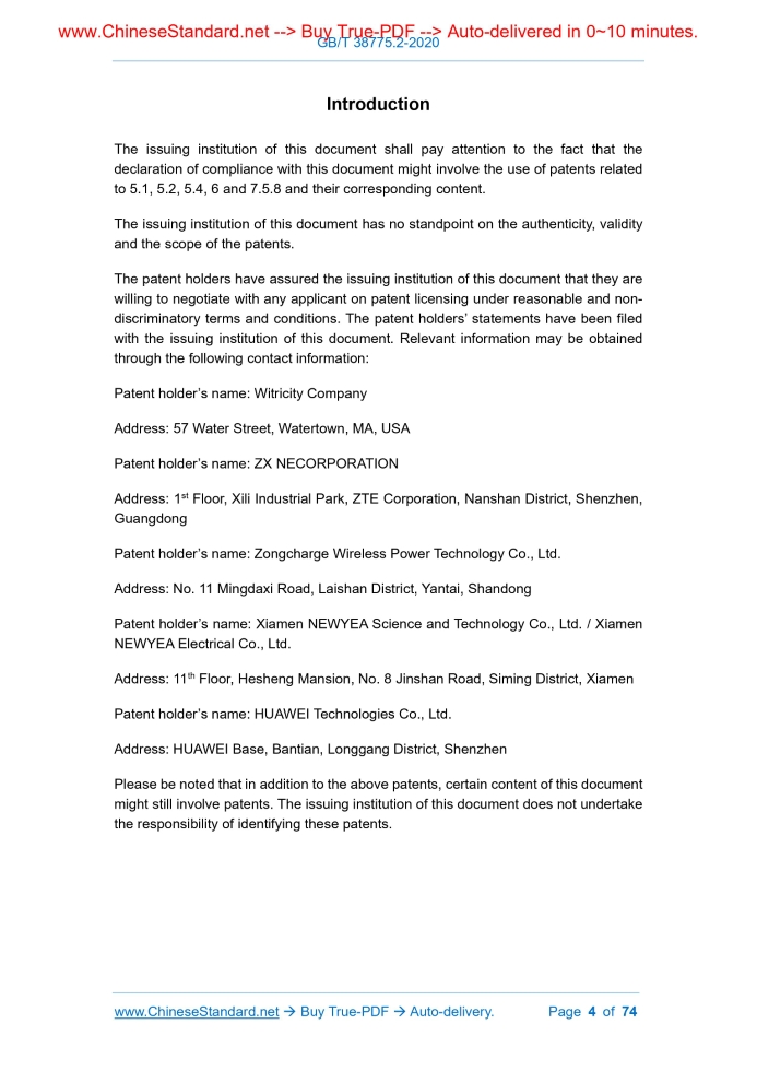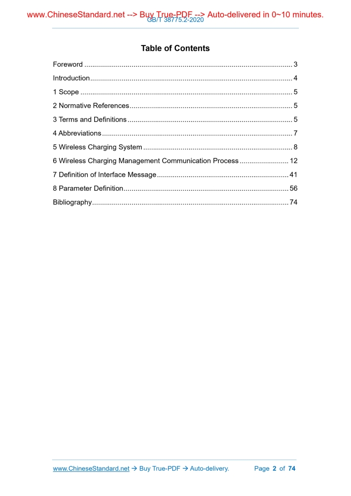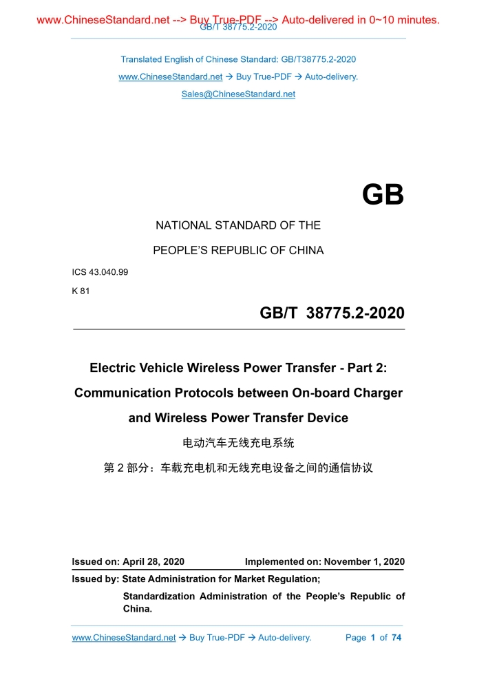 Similar standardsGB/T 38775.2-2020: Electric Vehicle Wireless Power Transfer - Part 2: Communication Protocols between On-board Charger and Wireless Power Transfer Device---This is an excerpt. Full copy of true-PDF in English version (including equations, symbols, images, flow-chart, tables, and figures etc.), auto-downloaded/delivered in 9 seconds, can be purchased online: https://www.ChineseStandard.net/PDF.aspx/GBT38775.2-2020 NATIONAL STANDARD OF THE PEOPLE’S REPUBLIC OF CHINA ICS 43.040.99 K 81 Electric Vehicle Wireless Power Transfer - Part 2. Communication Protocols between On-board Charger and Wireless Power Transfer Device Issued on. APRIL 28, 2020 Implemented on. NOVEMBER 1, 2020 Issued by. State Administration for Market Regulation; Standardization Administration of the People’s Republic of China. Table of ContentsForeword... 3 Introduction... 4 1 Scope... 5 2 Normative References... 5 3 Terms and Definitions... 5 4 Abbreviations... 7 5 Wireless Charging System... 8 6 Wireless Charging Management Communication Process... 12 7 Definition of Interface Message... 41 8 Parameter Definition... 56 Bibliography... 741 ScopeThis Part of GB/T 38775 specifies the communication protocols which implement wireless charging control between the communication service unit (CSU) of electric vehicle stationary wireless power transfer system and in-vehicle unit (IVU). It also specifies the communication protocols for the wireless charging control management system (WCCMS) to participate in wireless charging control. This Part is applicable to management and control between the communication service unit (CUS) and the wireless charging control management system (WCCMS), and between the in-vehicle unit (IVU) and the communication service unit (CSU).2 Normative ReferencesThe following documents are indispensable to the application of this document. In terms of references with a specified date, only versions with a specified date are applicable to this document. In terms of references without a specified date, the latest version (including all the modifications) is applicable to this document. GB/T 38775.1-2020 Electric Vehicle Wireless Power Transfer - Part 1.General Requirements GB/T 38775.3-2020 Electric Vehicle Wireless Power Transfer - Part 3.Specific Requirements People’s Republic of China on Radio Frequency Allocation (Order No. 46 of the Ministry of Industry and Information Technology of the People’s Republic of China) IEEE Std 802.11TM Standard for Information Technology - Telecommunications and Information Exchange between Systems - Local and Metropolitan Area Networks - Specific Requirements. Part 11.Wireless LAN Medium Access Control (MAC) and Physical Layer (PHY) Specifications3 Terms and DefinitionsWhat is defined in GB/T 38775.1-2020 and GB/T 38775.3-2020, and the following terms and definitions are applicable to this document. 3.1 Charging Spot Identification Charging spot identification refers to the unique information used to identify charging spot. 3.2 Charging Spot Information Charging spot information refers to charging spot identification and coil information of charging spot in the ground system. 3.3 Coil Information Coil information refers to information constituted of coil role, identification, type, power and frequency information to represent the identity and parameters of coil. 3.4 Ground Facilities Information Ground facilities information refers to information constituted of the software and hardware version information of charging spot information, communication service unit (CSU), power transmit controller (PTC) and power factor correction (PFC), the binding relationship between communication service unit (CSU) and power transmit controller (PTC), 3.5 Charging State Charging state refers to the state of the electric vehicle after it is connected to the power transfer system. It includes two states. charged and uncharged. 3.6 Vehicle System Information4 AbbreviationsThe following abbreviations are applicable to this document. CSU. Communication Service Unit IVU. In-Vehicle Unit PFC. Power Factor Correction PPC. Power Pickup Controller PrC. Primary Coil PTC. Power Transmit Controller PuC. Pick Up Coil UDP. User Datagram Protocol WCCMS. Wireless Charging Control Management System5 Wireless Charging System5.1 Overview In structure, the wireless charging system is divided into off-board devices and on- board devices, between which, there is no direct physical connection. During the wireless charging process, the off-board devices and on-board devices shall exchange information through wireless communication, so as to implement the control and management of the charging process. 5.2 Functions of Communication Units The functions of the various communication units are as follows. 5.3 Physical Layer Protocol The communication physical layer of CI interface shall comply with the stipulations of IEEE Std 802.11TM. 5.4 Communication Interface The wireless charging system has the following interfaces. 5.5 Relationships among CSU, PTC and PrC Figure 2 is a diagram of the relationships among CSU, PTC and PrC. One CSU may control multiple PTCs, while one PTC can only be controlled by one CSU. PTC may supply power to a specified PrC through a controllable switching element; PTC may also simultaneously supply power to multiple PrCs by setting a controllable switching element. The control of the controllable switching element shall be performed by CSU. 5.6 Security IVU and CSU shall check the integrity of device information, so as to prevent modification.6 Wireless Charging Management Communication Process6.1 Overall Process of Charging The normal charging process of the electric vehicle wireless charging system is shown Charging Spot 1 Charging Spot 2 Charging Spot m-1 Charging Spot m in Figure 3.The charging process of the vehicle-side and the ground-side devices has 4 states in total, which are respectively. communication unconnected, communication connected, standby and cha