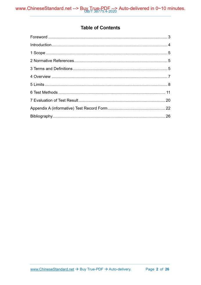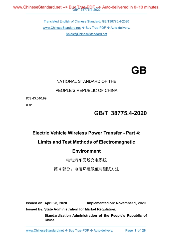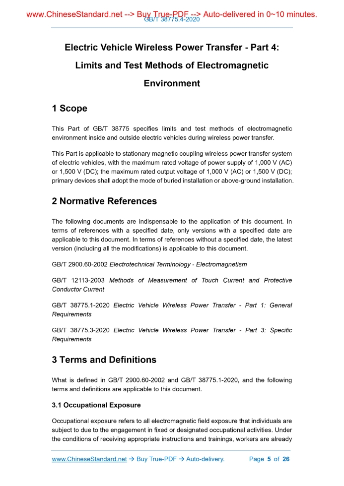 Similar standardsGB/T 38775.4-2020: Electric Vehicle Wireless Power Transfer - Part 4: Limits and Test Methods of Electromagnetic Environment---This is an excerpt. Full copy of true-PDF in English version (including equations, symbols, images, flow-chart, tables, and figures etc.), auto-downloaded/delivered in 9 seconds, can be purchased online: https://www.ChineseStandard.net/PDF.aspx/GBT38775.4-2020 NATIONAL STANDARD OF THE PEOPLE’S REPUBLIC OF CHINA ICS 43.040.99 K 81 Electric Vehicle Wireless Power Transfer - Part 4. Limits and Test Methods of Electromagnetic Environment Issued on. APRIL 28, 2020 Implemented on. NOVEMBER 1, 2020 Issued by. State Administration for Market Regulation; Standardization Administration of the People’s Republic of China. Table of ContentsForeword... 3 Introduction... 4 1 Scope... 5 2 Normative References... 5 3 Terms and Definitions... 5 4 Overview... 7 5 Limits... 8 6 Test Methods... 11 7 Evaluation of Test Result... 20 Appendix A (informative) Test Record Form... 22 Bibliography... 26ForewordGB/T 38875 Electric Vehicle Wireless Power Transfer is divided into several parts as follows. ---Part 1.General Requirements; ---Part 2.Communication Protocols between On-board Charger and Wireless Power Transfer Device; ---Part 3.Specific Requirements; ---Part 4.Limits and Test Methods of Electromagnetic Environment. This Part is Part 4 of GB/T 38775. This Part was drafted in accordance with the rules in GB/T 1.1-2009. This Part was proposed by and shall be under the jurisdiction of China Electricity Council. The drafting organizations of this Part. China Electric Power Research Institute; State Grid Jiangsu Electric Power Company Limited; China Electricity Council; ZX NECORPORATION; China Automotive Technology and Research Center Co., Ltd.; Zhejiang VIE Science & Technology Co., Ltd.; Zongcharge Wireless Power Technology Co., Ltd.; XJ Power Co., Ltd.; State Grid Jiangxi Electric Power Co., Ltd. Research Institute; State Grid Hebei Electric Power Research Institute; State Grid Shanghai Electric Power Research Institute; Shanghai Electrical Apparatus Research Institute (Group) Co., Ltd.; NARI Group Corporation; SAIC MOTOR; Zhejiang GEELY Auto Group; BAIC BJEV; Tsinghua University; TIANGONG University; Southeast University. The main drafters of this Part. Li Ni, Wang Yanzhao, Liu Yongdong, Wan Baoquan, Ge Dehui, Zhai Xuefeng, Zhang Jiangong, Wei Bin, Ma Jianwei, Wang Yang, Wang Chengliang, Hu Chao, Wang Chuanqi, Zhong KAI, Wang Wenbin, Liu Xiangli, Chen Feng, Xu Baohua, Xu Chong.1 ScopeThis Part of GB/T 38775 specifies limits and test methods of electromagnetic environment inside and outside electric vehicles during wireless power transfer. This Part is applicable to stationary magnetic coupling wireless power transfer system of electric vehicles, with the maximum rated voltage of power supply of 1,000 V (AC) or 1,500 V (DC); the maximum rated output voltage of 1,000 V (AC) or 1,500 V (DC); primary devices shall adopt the mode of buried installation or above-ground installation.2 Normative ReferencesThe following documents are indispensable to the application of this document. In terms of references with a specified date, only versions with a specified date are applicable to this document. In terms of references without a specified date, the latest version (including all the modifications) is applicable to this document. GB/T 2900.60-2002 Electrotechnical Terminology - Electromagnetism GB/T 12113-2003 Methods of Measurement of Touch Current and Protective Conductor Current GB/T 38775.1-2020 Electric Vehicle Wireless Power Transfer - Part 1.General Requirements GB/T 38775.3-2020 Electric Vehicle Wireless Power Transfer - Part 3.Specific Requirements3 Terms and DefinitionsWhat is defined in GB/T 2900.60-2002 and GB/T 38775.1-2020, and the following terms and definitions are applicable to this document. 3.1 Occupational Exposure Occupational exposure refers to all electromagnetic field exposure that individuals are subject to due to the engagement in fixed or designated occupational activities. Under the conditions of receiving appropriate instructions and trainings, workers are already informed, and voluntarily experience the effects of the electromagnetic fields. 3.3 Medical Exposure Medical exposure refers to electromagnetic field exposure to patients undergoing medical diagnosis or approved medical treatment, or volunteers in medical researches. 3.4 Active Implantable Medical Device Active implantable medical device refers to active medical devices implanted in the human body. 3.5 Touch Current Touch current refers to the current flowing through the human body or animal when they touch one of more accessible parts of devices or equipment. 3.6 Basic Restriction Basic restriction refers to a limit determined for human tissue that may cause harmful health effects. It strictly conforms to all the already-known biophysical interaction mechanisms and is usually difficult to measure. 3.7 Reference Level Reference level refers to a physical quantity introduced for the convenience of actual exposure assessment that are convenient for actual measurement.4 Overview4.1 Protection Areas The following four protection areas are defined, see Figure 1. 4.2 Limit Compliance Requirements Comply with the following limit compliance requirements.5 Limits5.1 Electromagnetic Field Limits 5.1.1 Human exposure limits Electromagnetic field limits of human exposure include basic limits and reference levels, which are respectively shown in Table 1 and Table 2.The compliance with the reference levels in Table 2 can ensure the compliance with the basic limits in Table 1. 5.1.2 Exposure limits of active implantable medical devices In this Chapter, the corresponding frequency band of the limit requirements is. 79 kHz ~ 90 kHz. 5.2 Contact Current Limits Contact current limits are shown in Table 4.6 Test Methods6.1 Test Conditions 6.1.1 Temperature, humidity and atmospheric pressure The environmen