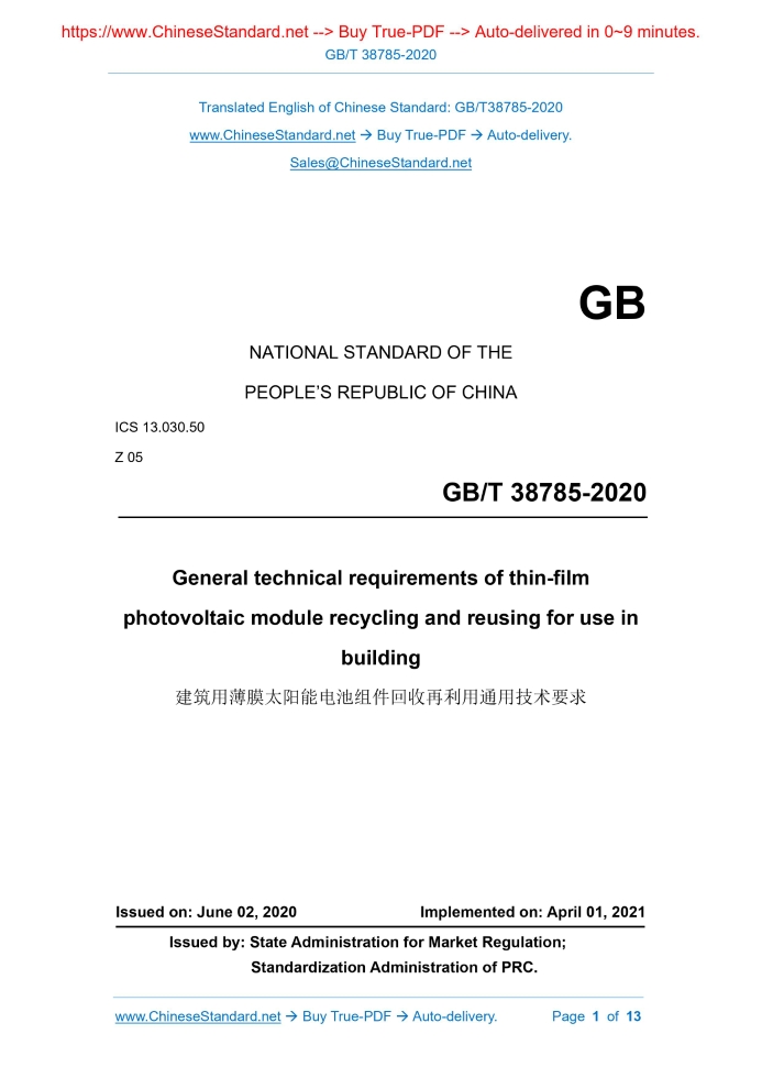 GB/T 38785-2020: General technical requirements of thin-film photovoltaic module recycling and reusing for use in building Delivery: 9 seconds. True-PDF full-copy in English & invoice will be downloaded + auto-delivered via email. See step-by-step procedure Status: Valid