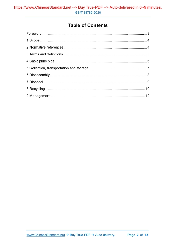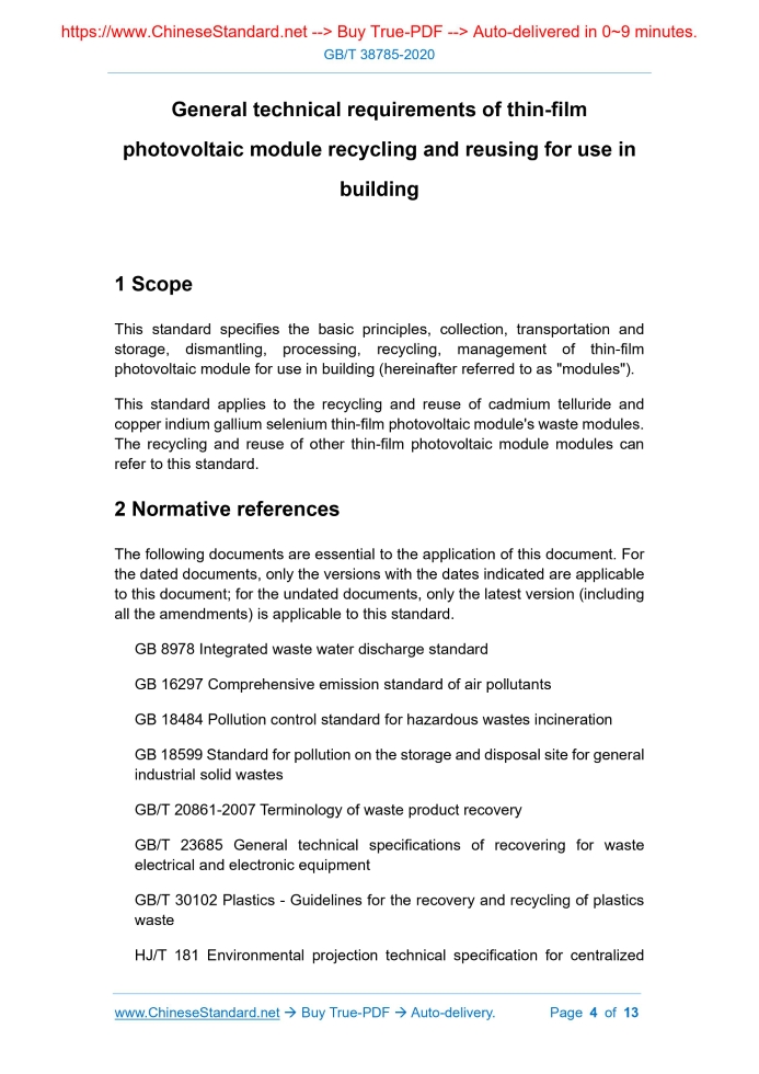 Similar standardsGB/T 38785-2020: General technical requirements of thin-film photovoltaic module recycling and reusing for use in building---This is an excerpt. Full copy of true-PDF in English version (including equations, symbols, images, flow-chart, tables, and figures etc.), auto-downloaded/delivered in 9 seconds, can be purchased online: https://www.ChineseStandard.net/PDF.aspx/GBT38785-2020 GB NATIONAL STANDARD OF THE PEOPLE’S REPUBLIC OF CHINA ICS 13.030.50 Z 05 General technical requirements of thin-film photovoltaic module recycling and reusing for use in building ISSUED ON: JUNE 02, 2020 IMPLEMENTED ON: APRIL 01, 2021 Issued by: State Administration for Market Regulation; Standardization Administration of PRC. Table of ContentsForeword ... 3 1 Scope ... 4 2 Normative references ... 4 3 Terms and definitions ... 5 4 Basic principles ... 6 5 Collection, transportation and storage ... 7 6 Disassembly ... 8 7 Disposal ... 9 8 Recycling ... 10 9 Management ... 12 General technical requirements of thin-film photovoltaic module recycling and reusing for use in building1 ScopeThis standard specifies the basic principles, collection, transportation and storage, dismantling, processing, recycling, management of thin-film photovoltaic module for use in building (hereinafter referred to as "modules"). This standard applies to the recycling and reuse of cadmium telluride and copper indium gallium selenium thin-film photovoltaic module's waste modules. The recycling and reuse of other thin-film photovoltaic module modules can refer to this standard.2 Normative referencesThe following documents are essential to the application of this document. For the dated documents, only the versions with the dates indicated are applicable to this document; for the undated documents, only the latest version (including all the amendments) is applicable to this standard. GB 8978 Integrated waste water discharge standard GB 16297 Comprehensive emission standard of air pollutants GB 18484 Pollution control standard for hazardous wastes incineration GB 18599 Standard for pollution on the storage and disposal site for general industrial solid wastes GB/T 20861-2007 Terminology of waste product recovery GB/T 23685 General technical specifications of recovering for waste electrical and electronic equipment GB/T 30102 Plastics - Guidelines for the recovery and recycling of plastics waste HJ/T 181 Environmental projection technical specification for centralized 3.6 Disassembly The process of using manual or mechanical means to dismantle, disassemble the waste modules, to facilitate subsequent processing. Note: Rewrite GB/T 23685-2009, definition 3.5. 3.7 Treatment The process of decontamination, sorting, crushing of waste modules. Note: Rewrite GB/T 20861-2007, definition 2.7. 3.8 Recycling The process of the disposal of waste modules, recycling the valuable materials in the modules, to make it become reusable materials, excluding the recovery and utilization of energy. Note: Rewrite GB/T 20861-2007, definition 2.10. 3.9 Metal recovery rate The ratio of the total mass of pure metal recovered from the thin film layer of waste modules to the total mass of pure metal in the thin film layer of waste modules. 3.10 Energy recovery The process of using incineration, pyrolysis and other methods to dispose the non-recyclable polymer materials in the waste modules as well as realizing energy recovery. Note: Rewrite GB/T 20861-2007, definition 2.19.4 Basic principles4.1 During the disposal process, priority shall be given to the reuse of the parts 5.3 Transportation 5.3.1 Waste modules shall be registered before transportation. 5.3.2 Do not disassemble or dispose of waste modules in any form during transportation. 5.3.3 The protective measures during transportation shall meet relevant laws and management requirements. 5.3.4 It shall prevent secondary damage and pollution of waste modules during transportation. 5.4 Storage 5.4.1 The storage site of waste modules shall comply with the requirements in GB 18599. 5.4.2 Waste modules shall be classified and stored; their specifications, models and names shall be marked in a prominent position. 5.4.3 Waste modules shall be placed in a special storage place that is shaded, protected from wind and rain; meanwhile it shall be marked with warning signs of leakage prevention and heavy metal hazards. 5.4.4 The storage place for waste modules shall be equipped with fire risk early warning devices and firefighting facilities. 5.4.5 Waste unqualified products without any packaging shall be stored separately.6 Disassembly6.1 To disassemble the waste modules, it shall first remove the bracket and frame (or back rail); then remove the termination; finally the laminate. 6.2 The integrity of the laminate shall be ensured when the waste modules are disassembled. 6.3 All parts and modules taken out in advance shall not be discarded randomly; they shall be carried out in accordance with the provisions of 7.1.4, 7.2, 7.3 of this standard. 6.4 The parts and materials removed from the disassembly shall be stored separately and clearly marked. 6.5 The disassembly site shall comply with the requirements in HJ/T 181. a) Wet method: Directly use mechanical crushing and then oxidation acid leaching treatment; b) Fire method: The mixture is recovered by high-temperature evaporation and cooling, then carry out oxidized acid leaching treatment. 7.4.2 When using mechanical crushing methods to dispose of waste modules, separate or isolated work areas shall be set up. The crushing and sorting process shall be equipped with dust-proof and dust-removing facilities; the exhaust gas after treatment shall meet the requirements in GB 16297. 7.4.3 The comprehensive recovery of metal materials using hydrometallurgical processes such as inorganic acids or organic chemical solvents shall be carried out in equipment with measures to prevent chemical spills. 7.4.4 Equipment and storage tanks for storing inorganic acids or 