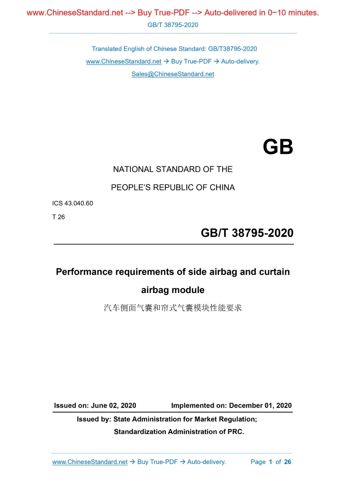 GB/T 38795-2020: Performance requirements of side airbag and curtain airbag module Delivery: 9 seconds. True-PDF full-copy in English & invoice will be downloaded + auto-delivered via email. See step-by-step procedure Status: Valid