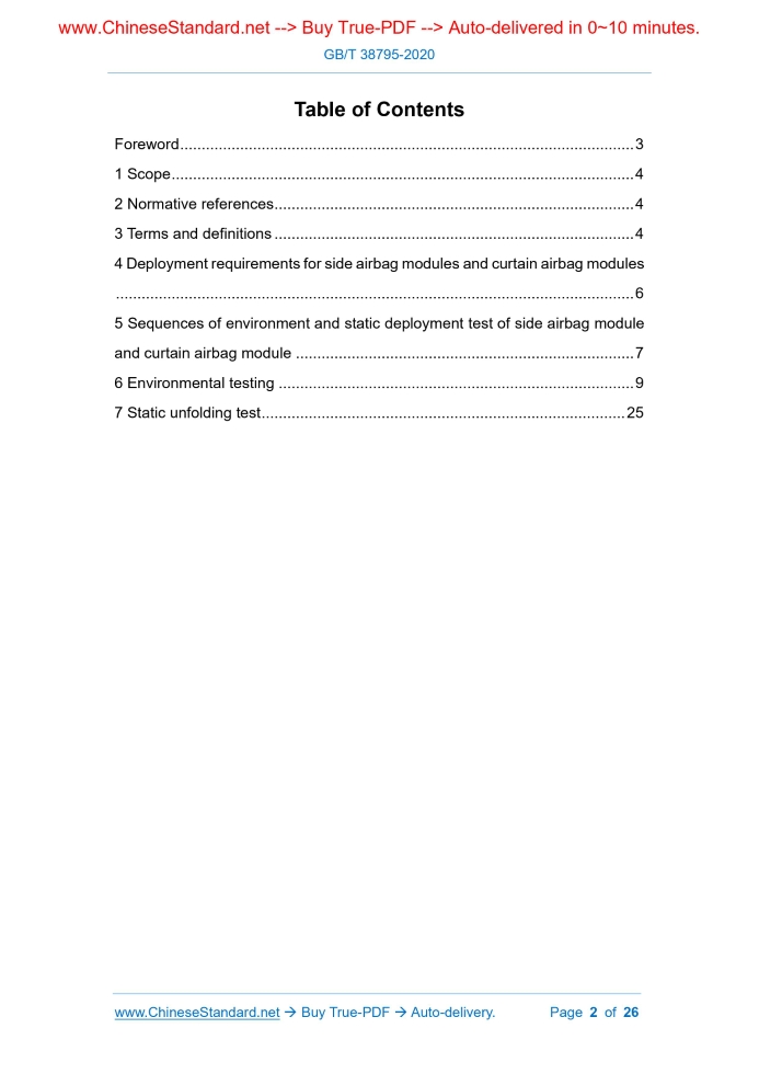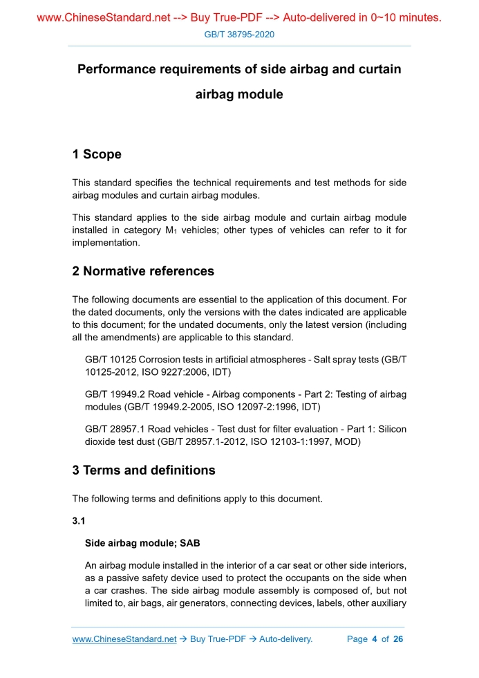 Similar standardsGB/T 38795-2020: Performance requirements of side airbag and curtain airbag module---This is an excerpt. Full copy of true-PDF in English version (including equations, symbols, images, flow-chart, tables, and figures etc.), auto-downloaded/delivered in 9 seconds, can be purchased online: https://www.ChineseStandard.net/PDF.aspx/GBT38795-2020GB NATIONAL STANDARD OF THE PEOPLE’S REPUBLIC OF CHINA ICS 43.040.60 T 26 Performance requirements of side airbag and curtain airbag module ISSUED ON: JUNE 02, 2020 IMPLEMENTED ON: DECEMBER 01, 2020 Issued by: State Administration for Market Regulation; Standardization Administration of PRC. Table of ContentsForeword ... 3 1 Scope ... 4 2 Normative references ... 4 3 Terms and definitions ... 4 4 Deployment requirements for side airbag modules and curtain airbag modules ... 6 5 Sequences of environment and static deployment test of side airbag module and curtain airbag module ... 7 6 Environmental testing ... 9 7 Static unfolding test ... 25 Performance requirements of side airbag and curtain airbag module1 ScopeThis standard specifies the technical requirements and test methods for side airbag modules and curtain airbag modules. This standard applies to the side airbag module and curtain airbag module installed in category M1 vehicles; other types of vehicles can refer to it for implementation.2 Normative referencesThe following documents are essential to the application of this document. For the dated documents, only the versions with the dates indicated are applicable to this document; for the undated documents, only the latest version (including all the amendments) are applicable to this standard. GB/T 10125 Corrosion tests in artificial atmospheres - Salt spray tests (GB/T 10125-2012, ISO 9227:2006, IDT) GB/T 19949.2 Road vehicle - Airbag components - Part 2: Testing of airbag modules (GB/T 19949.2-2005, ISO 12097-2:1996, IDT) GB/T 28957.1 Road vehicles - Test dust for filter evaluation - Part 1: Silicon dioxide test dust (GB/T 28957.1-2012, ISO 12103-1:1997, MOD)3 Terms and definitionsThe following terms and definitions apply to this document. 3.1 Side airbag module; SAB An airbag module installed in the interior of a car seat or other side interiors, as a passive safety device used to protect the occupants on the side when a car crashes. The side airbag module assembly is composed of, but not limited to, air bags, air generators, connecting devices, labels, other auxiliary Temperature build-up time te The difference of the time taken by the temperature at the defined reference point of the test sample (generally refers to the point where the temperature of the test sample changes the slowest) from the initial temperature to rise or fall to the target temperature and the time taken by the ambient temperature to rise or fall from the initial temperature to the target temperature. 3.9 Power spectral density; PSD Represents the distribution of the power contained in each frequency component of the random signal in the frequency domain. Note: Usually expressed in PSD, the unit is the second power of grams per hertz (g2/Hz). The curve graph of its distribution in the frequency domain is called the spectrogram. 4 Deployment requirements for side airbag modules and curtain airbag modules 4.1 During and after the static deployment test of Chapter 7 for the airbag module, the subcomponents of the module shall not have hard splashes (such as metal parts or plastic parts) caused by the deployment of the airbag. If there is a falling hard object, it shall not fall towards the occupant side. 4.2 During and after the static deployment test of the airbag module in Chapter 7, it is neither allowed to have any rupture or burning on the contact surface between the airbag and the occupant, nor small holes with a diameter greater than 3 mm are allowed in other locations; if the holes are less than 3 mm, the quantity shall not exceed 3 and the adjacent holes shall not be connected. 4.3 During and after the static deployment test of the airbag module in Chapter 7, the air bag shall neither disconnect from the test tooling or the vehicle position, nor can there be a looseness that affects the function of the airbag. 4.4 During and after the static deployment test of airbag module in Chapter 7, the sewing line of the airbag shall be in an intact state; the number of continuous disengagement of the stitches of the sewing line shall not be more than 3. If the airbag is an integrated airbag, no damage shall occur at the seam. 4.5 During the static deployment test of airbag module in Chapter 7, the airbag of the airbag module shall be able to be deployed in place in accordance with the shape required by the design within the specified time, meanwhile reach the protection area required by the design. 4.6 The difference between the inflation time of the airbag module with treatment of the environmental test and without treatment of the environmental test shall be within the error range of the design requirements. 5 Sequences of environment and static deployment test of side airbag module and curtain airbag module 5.1 Table 1 shows all the test items of 36 identical test samples, "X" indicates the test samples that need to be subject to this test item. 5.2 The test samples corresponding to each test item include the left and right sides, meanwhile the number of test samples on the left and right sides are equal. "L" means the left test sample, "R" means the right test sample. 5.3 Each test sample shall be tested in the order of the test items required in Table 1. The test order of temperature vibration test and thermal humidity cycle test can be reversed, whilst the test order of the remaining test items cannot be changed. After the high damp heat aging test is completed, a static unfolding test shall be carried out within 168 h. 5.4 The test items and test sequence are determined according to the life cycle of the airbag module and the possible failure mec