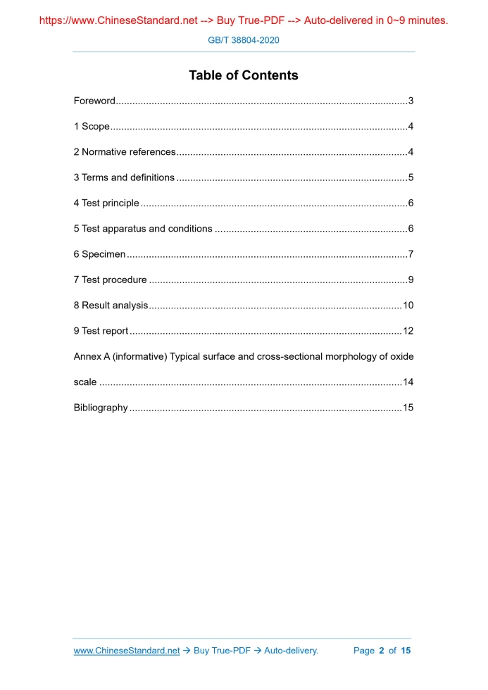 Similar standardsGB/T 38804-2020: Test method for oxidation of metallic materials exposed in high-temperature steam---This is an excerpt. Full copy of true-PDF in English version (including equations, symbols, images, flow-chart, tables, and figures etc.), auto-downloaded/delivered in 9 seconds, can be purchased online: https://www.ChineseStandard.net/PDF.aspx/GBT38804-2020 GB NATIONAL STANDARD OF THE PEOPLE’S REPUBLIC OF CHINA ICS 77.040.99 H 21 Test method for oxidation of metallic materials exposed in high-temperature steam ISSUED ON: JUNE 02, 2020 IMPLEMENTED ON: DECEMBER 01, 2020 Issued by: State Administration for Market Regulation; Standardization Administration of the People's Republic of China. Table of ContentsForeword ... 3 1 Scope ... 4 2 Normative references ... 4 3 Terms and definitions ... 5 4 Test principle ... 6 5 Test apparatus and conditions ... 6 6 Specimen ... 7 7 Test procedure ... 9 8 Result analysis ... 10 9 Test report ... 12 Annex A (informative) Typical surface and cross-sectional morphology of oxide scale ... 14 Bibliography ... 15 Test method for oxidation of metallic materials exposed in high-temperature steam1 ScopeThis Standard specifies the terms and definitions, test principle, test apparatus and conditions, specimen, test procedures, result analysis and test report of test method for oxidation of metallic materials exposed in high-temperature steam. This Standard applies to the oxidation test of metallic materials exposed in high- temperature steam.2 Normative referencesThe following referenced documents are indispensable for the application of this document. For dated references, only the edition cited applies. For undated references, the latest edition of the referenced document (including any amendments) applies. GB/T 1216 External micrometer GB/T 1227 Accurate pressure gauge GB/T 11446.1-2013 Electronic grade water GB/T 21389 Vernier, dial and digital display calipers GB/T 26497 Electronic balance JJF 1637 Calibration specification for base metal thermocouples JJG 141 Verification regulation of working noble metal thermocouples JJG 368 Verification Regulation of Working Copper/Copper. Nickel Thermocouple JJG 2063 Verification scheme of measuring instruments for liquid flow 7 - Protective gas; 8 - Steam; 9 - Specimen; 10 - Test water. Figure 1 -- Schematic diagram of test apparatus 5.2 Test section’s temperature The temperature of the test section reflects both the temperature of the steam and the specimen. The temperature of the test section is controlled by a temperature control device, and thermocouples are used for real-time temperature monitoring. The selection and use of thermocouples shall comply with the provisions of JJG 141, JJF 1637 or JJG 368. The temperature deviation of the test section shall comply with the following provisions: a) it shall be less than ±3 °C when below 650 °C; b) it shall be less than ±4 °C when at 650 °C ~ 800 °C; c) it shall be less than ±5 °C when above 800 °C. 5.3 Reaction chamber’s pressure During the test, a pressure gauge or pressure sensor is used to monitor the pressure of the reaction chamber. The selection and use of pressure gauges and pressure sensors shall comply with the provisions of GB/T 1227. The pressure deviation of the reaction chamber shall be minimized. When the test pressure value is greater than 10 MPa, the pressure deviation of the reaction chamber shall be less than ±2 %. 5.4 Test steam The test steam is prepared from deionized water or distilled water, and the test water shall comply with the provisions of Class III electronic water in GB/T 11446.1-2013. The test water shall be deoxygenated before the steam is produced, and the oxygen content in the steam or test water shall be indicated in the test report. If other gases are added to the steam, the final gas content ratio of the steam shall be indicated in the test report. 5.5 Flowmeter During the test, the steam flow rate or water flow rate shall be monitored. The selection and use of flowmeters shall comply with the provisions of JJG 2063.6 Specimen6.1 Shape and size The storage environment of specimens shall be kept dry.7 Test procedure7.1 Preparing the specimen After machining, the specimen is subjected to surface treatment according to 6.3. Measure size and mass and record the initial value. Avoid touching the specimen directly with your hands during measurement. 7.2 Placing the specimen 7.2.1 When placing the specimen, it should be suspended so that the surface of the largest area of the specimen is parallel to the direction of steam flow. The diameter of the specimen hanging hole shall be 1 mm, and if it is larger than 1 mm, it shall be indicated in the report. There shall be enough space between the suspended specimens to prevent the specimens from touching each other. When hanging the specimen, the contact between the hanging wire and the specimen shall be reduced, and nickel-chromium alloy is recommended as the hanging wire. 7.2.2 When hanging specimens cannot be used due to equipment layout and other problems, the specimen can be placed flat in the tubular specimen holder. When laying the specimen flat, the contact area between the specimen and the specimen holder shall be minimized. Each specimen shall be placed separately and shall not be in contact with each other. The surface of the largest area of the specimen shall be parallel to the direction of steam flow. The material of the specimen holder should be corundum. 7.3 Deoxygenating the reaction chamber After the specimen is placed in the reaction chamber, close the reaction chamber to ensure that air cannot enter the reaction chamber, and use inert gas argon or nitrogen to purge the reaction chamber so that the oxygen content (volume fraction) in the reaction chamber is less than 0.0003 %. 7.4 Heating up the reaction chamber The reaction chamber begins to heat up after deoxygenation, and the temperature rise rate shall not be too fast to cause the oxide sca