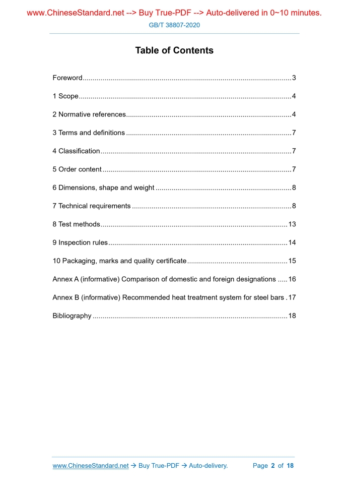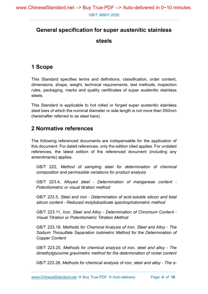 Similar standardsGB/T 38807-2020: General specification for super austenitic stainless steels---This is an excerpt. Full copy of true-PDF in English version (including equations, symbols, images, flow-chart, tables, and figures etc.), auto-downloaded/delivered in 9 seconds, can be purchased online: https://www.ChineseStandard.net/PDF.aspx/GBT38807-2020GB NATIONAL STANDARD OF THE PEOPLE’S REPUBLIC OF CHINA ICS 77.140.20 H 40 General specification for super austenitic stainless steels ISSUED ON: JUNE 02, 2020 IMPLEMENTED ON: DECEMBER 01, 2020 Issued by: State Administration for Market Regulation; Standardization Administration of the People's Republic of China. Table of ContentsForeword ... 3 1 Scope ... 4 2 Normative references ... 4 3 Terms and definitions ... 7 4 Classification ... 7 5 Order content ... 7 6 Dimensions, shape and weight ... 8 7 Technical requirements ... 8 8 Test methods ... 13 9 Inspection rules ... 14 10 Packaging, marks and quality certificate ... 15 Annex A (informative) Comparison of domestic and foreign designations ... 16 Annex B (informative) Recommended heat treatment system for steel bars . 17 Bibliography ... 18 General specification for super austenitic stainless steels1 ScopeThis Standard specifies terms and definitions, classification, order content, dimensions, shape, weight, technical requirements, test methods, inspection rules, packaging, marks and quality certificates of super austenitic stainless steels. This Standard is applicable to hot rolled or forged super austenitic stainless steel bars of which the nominal diameter or side length is not more than 550mm (hereinafter referred to as steel bars).2 Normative referencesThe following referenced documents are indispensable for the application of this document. For dated references, only the edition cited applies. For undated references, the latest edition of the referenced document (including any amendments) applies. GB/T 222, Method of sampling steel for determination of chemical composition and permissible variations for product analysis GB/T 223.4, Alloyed steel - Determination of manganese content - Potentiometric or visual titration method GB/T 223.5, Steel and iron - Determination of acid-soluble silicon and total silicon content - Reduced molybdosilicate spectrophotometric method GB/T 223.11, Iron, Steel and Alloy - Determination of Chromium Content - Visual Titration or Potentiometric Titration Method GB/T 223.18, Methods for Chemical Analysis of Iron, Steel and Alloy - The Sodium Thiosulfate Separation Iodimetric Method for the Determination of Copper Content GB/T 223.25, Methods for chemical analysis of iron, steel and alloy - The dimethylglyoxime gravimetric method for the determination of nickel content GB/T 223.28, Methods for chemical analysis of iron, steel and alloy - The α- steels GB/T 2101, General requirement of acceptance packaging marking and certification for section steel GB/T 2975, Steel and Steel Products - Location and Preparation of Test Pieces for Mechanical Testing GB/T 4162, Forged and Rolled Steel Bars - Method for Ultrasonic Testing GB/T 4334-2020, Corrosion of metals and alloys - Test methods for intergranular corrosion of austenitic and ferritic-austenitic (duplex) stainless steels GB/T 6394, Metal - Methods for estimating the average grain size GB/T 6402, Steel Forgings - Method for Ultrasonic Testing GB/T 7736, Ultrasonic Inspecting Method for Macro-structure and Imperfection of Steel GB/T 8170, Rules of rounding off for numerical values & expression and judgement of limiting values GB/T 10127, Ferric chloride crevice corrosion test of stainless steels GB/T 10561-2005, Steel - Determination of Content of Nonmetallic Inclusions - Micrographic Method Using Standards Diagrams GB/T 11170, Stainless steel - Determination of multi-element contents - Spark discharge atomic emission spectrometric method (Routine method) GB/T 13305, Micrographic method for determining area content of the α- phases in stainless steels GB/T 15970.2, Corrosion of metals and alloys - Stress corrosion testing - Part 2: Preparation and use of bent-beam specimens GB/T 17505, Steel and steel products General technical delivery requirements GB/T 17897, Corrosion of metals and alloys - Corrosion test for pitting corrosion resistance of stainless steels in the ferric chloride solution GB/T 20066, Steel and Iron - Sampling and Preparation of Samples for the Determination of Chemical Composition GB/T 20123, Steel and iron - Determination of total carbon and sulfur content c) Designation or unified digital code; d) Delivery status; e) Dimensions and allowable deviation; f) Weight or quantity; g) The items or indicators in the standard that shall be negotiated between the supplier and the purchaser and indicated in the contract. If not indicated, the supplier shall choose; h) Other special requirements.6 Dimensions, shape and weight6.1 The dimensions, shape and allowable deviation of hot-rolled round steel and square steel shall meet the requirements of GB/T 702-2017. Specific requirements shall be specified in the contract. If it is not specified, it shall be executed according to group 2 in Table 1 of GB/T 702-2017. 6.2 The dimensions, shape and allowable deviation of forged round steel and square steel shall meet the requirements of GB/T 908-2019. Specific requirements shall be specified in the contract. If it is not specified, it shall be executed according to group 2 in Table 1 of GB/T 908-2019. 6.3 Agreed by the supplier and the purchaser through negotiation and indicated in the contract, steel bars of other dimensions, shapes and allowable deviations can be supplied. 6.4 Steel bars are delivered according to actual weight.7 Technical requirements7.1 Designation and chemical composition 7.1.1 The unified digital code, designation and chemical composition (melting analysis) of steel shall meet the requirements of Table 1. 13 alpha phase 1 piece / lot Any steel bar GB/T 13305 14 Dimensions, shape Pi