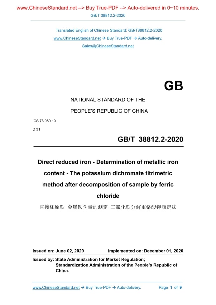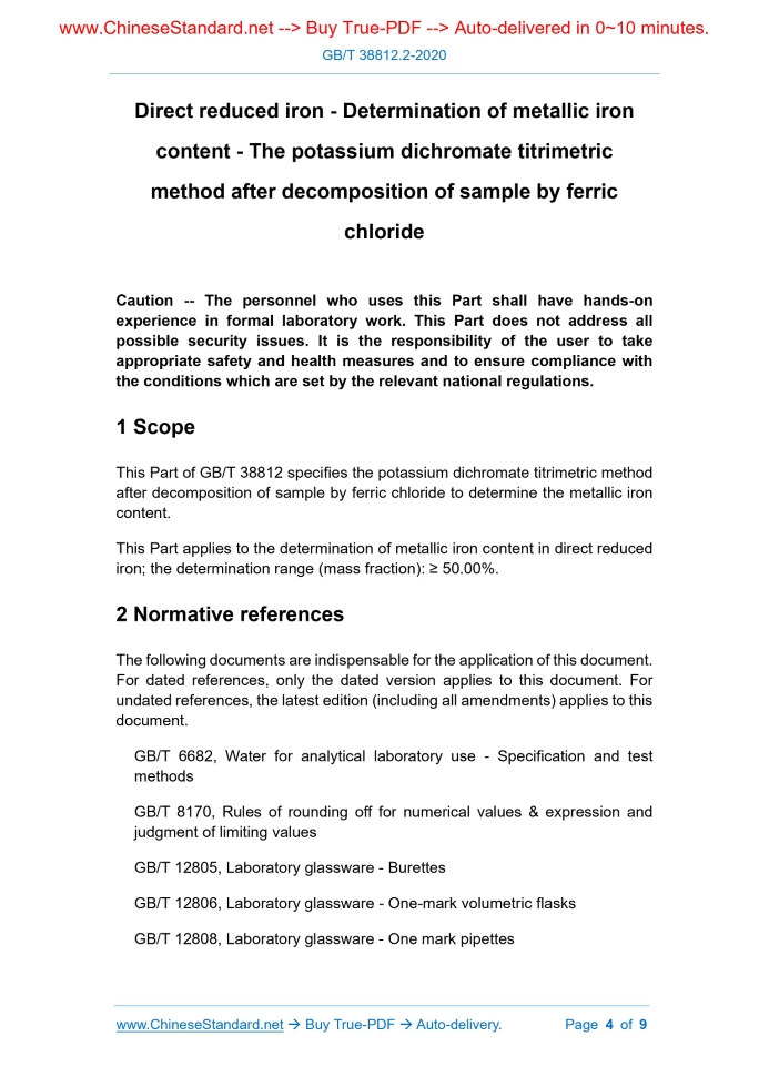GB/T 38812.2-2020: Direct reduced iron--Determination of metallic iron content--The potassium dichromate titrimetric method after decomposition of sample by ferric chloride Delivery: 9 seconds. True-PDF full-copy in English & invoice will be downloaded + auto-delivered via email. See step-by-step procedure Status: Valid