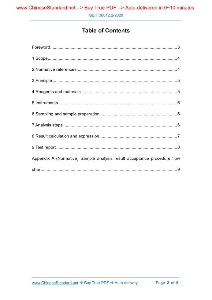 Similar standardsGB/T 38812.2-2020: Direct reduced iron--Determination of metallic iron content--The potassium dichromate titrimetric method after decomposition of sample by ferric chloride---This is an excerpt. Full copy of true-PDF in English version (including equations, symbols, images, flow-chart, tables, and figures etc.), auto-downloaded/delivered in 9 seconds, can be purchased online: https://www.ChineseStandard.net/PDF.aspx/GBT38812.2-2020 GB NATIONAL STANDARD OF THE PEOPLE’S REPUBLIC OF CHINA ICS 73.060.10 D 31 Direct reduced iron - Determination of metallic iron content - The potassium dichromate titrimetric method after decomposition of sample by ferric chloride ISSUED ON: JUNE 02, 2020 IMPLEMENTED ON: DECEMBER 01, 2020 Issued by: State Administration for Market Regulation; Standardization Administration of the People’s Republic of China. Table of ContentsForeword ... 3 1 Scope ... 4 2 Normative references ... 4 3 Principle ... 5 4 Reagents and materials ... 5 5 Instruments ... 6 6 Sampling and sample preparation ... 6 7 Analysis steps ... 6 8 Result calculation and expression ... 7 9 Test report ... 8 Appendix A (Normative) Sample analysis result acceptance procedure flow chart ... 9 Direct reduced iron - Determination of metallic iron content - The potassium dichromate titrimetric method after decomposition of sample by ferric chloride Caution -- The personnel who uses this Part shall have hands-on experience in formal laboratory work. This Part does not address all possible security issues. It is the responsibility of the user to take appropriate safety and health measures and to ensure compliance with the conditions which are set by the relevant national regulations.1 ScopeThis Part of GB/T 38812 specifies the potassium dichromate titrimetric method after decomposition of sample by ferric chloride to determine the metallic iron content. This Part applies to the determination of metallic iron content in direct reduced iron; the determination range (mass fraction): ≥ 50.00%.2 Normative referencesThe following documents are indispensable for the application of this document. For dated references, only the dated version applies to this document. For undated references, the latest edition (including all amendments) applies to this document. GB/T 6682, Water for analytical laboratory use - Specification and test methods GB/T 8170, Rules of rounding off for numerical values & expression and judgment of limiting values GB/T 12805, Laboratory glassware - Burettes GB/T 12806, Laboratory glassware - One-mark volumetric flasks GB/T 12808, Laboratory glassware - One mark pipettes5 Instruments5.1 Common laboratory equipment that is used in the analysis. Burettes, one- mark volumetric flasks and one mark pipettes shall meet the requirements of GB/T 12805, GB/T 12806 and GB/T 12808. 5.2 Oscillator: reciprocating multi-functional oscillator. Oscillation frequency: 150 times/min ~ 160 times/min; amplitude: 20 mm (reciprocating).6 Sampling and sample preparationPerform sampling and sample preparation according to the provisions of GB/T 24239.7 Analysis steps7.1 Number of determinations Make at least two independent determinations on the same sample. Note: "Independent" means that the second and any subsequent determination result is not affected by the previous determination result. In this analysis method, this condition means that in the same laboratory, the same operator uses the same equipment and the same test method to independently repeat the determination on the same tested object in a short time, including the use of appropriate recalibration. 7.2 Sample mass Weigh 0.10 g of sample, to the nearest 0.000 1 g. 7.3 Blank test Carry out a blank test along with the sample. 7.4 Determination 7.4.1 Sample decomposition Place the sample (see 7.2) in a dry 300 mL conical flask; add 40 mL of ferric trichloride solution (see 4.4); stopper the bottle; place it on an oscillator and shake for 40 min. Use a medium-speed filter paper to filter; collect the filtrate in a 500 mL conical flask. Use water to wash the conical flask, stopper and residue 6 ~ 8 times; control the solution volume to 150 mL ~ 200 mL. ......Source: Above contents are excerpted from the full-copy PDF -- translated/reviewed by: www.ChineseStandard.net / Wayne Zheng et al. Tips & Frequently Asked Questions:Question 1: How long will the true-PDF of English version of GB/T 38812.2-2020 be delivered?Answer: The full copy PDF of English version of GB/T 38812.2-2020 can be downloaded in 9 seconds, and it will also be emailed to you in 9 seconds (double mechanisms to ensure the delivery reliably), with PDF-invoice.Question 2: Can I share the purchased PDF of GB/T 38812.2-2020_English with my colleagues?Answer: Yes. The purchased PDF of GB/T 38812.2-2020_English will be deemed to be sold to your employer/organization who actually paid for it, including your colleagues and your employer's intranet.Question 3: Does the price include tax/VAT?Answer: Yes. Our tax invoice, downloaded/delivered in 9 seconds, includes all tax/VAT and complies with 100+ countries' tax regulations (tax exempted in 100+ countries) -- See Avoidance of Double Taxation Agreements (DTAs): List of DTAs signed between Singapore and 100+ countriesQuestion 4: Do you accept my currency other than USD?Answer: Yes. www.ChineseStandard.us -- GB/T 38812.2-2020 -- Click this link and select your country/currency to pay, the exact amount in your currency will be printed on the invoice. Full PDF will also be downloaded/emailed in 9 seconds.How to buy and download a true PDF of English version of GB/T 38812.2-2020?A step-by-step guide to download PDF of GB/T 38812.2-2020_EnglishStep 1: Visit website https://www.ChineseStandard.net (Pay in USD), or https://www.ChineseStandard.us (Pay in any currencies such as Euro, KRW, JPY, AUD).Step 2: Search keyword "GB/T 38812.2-2020". Step 3: Click "Add to Cart". If multiple PDFs are required, repeat steps 2 and 3 to add up to 12 PDFs