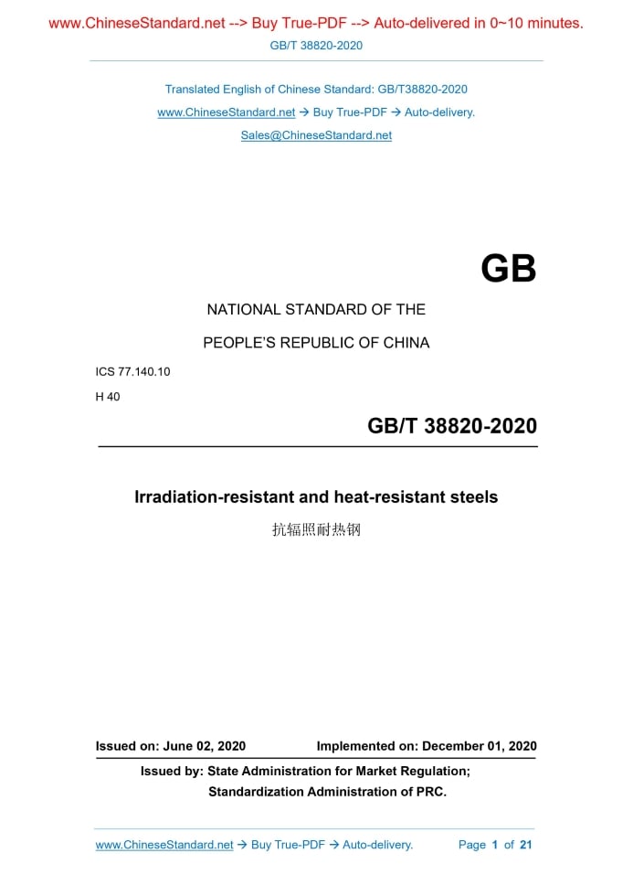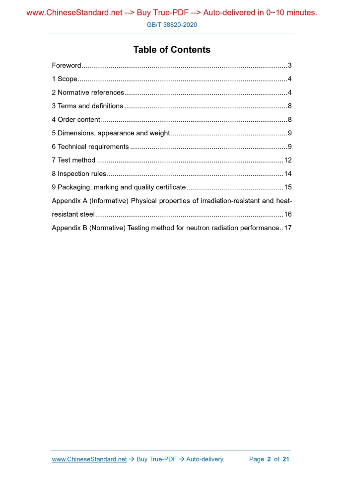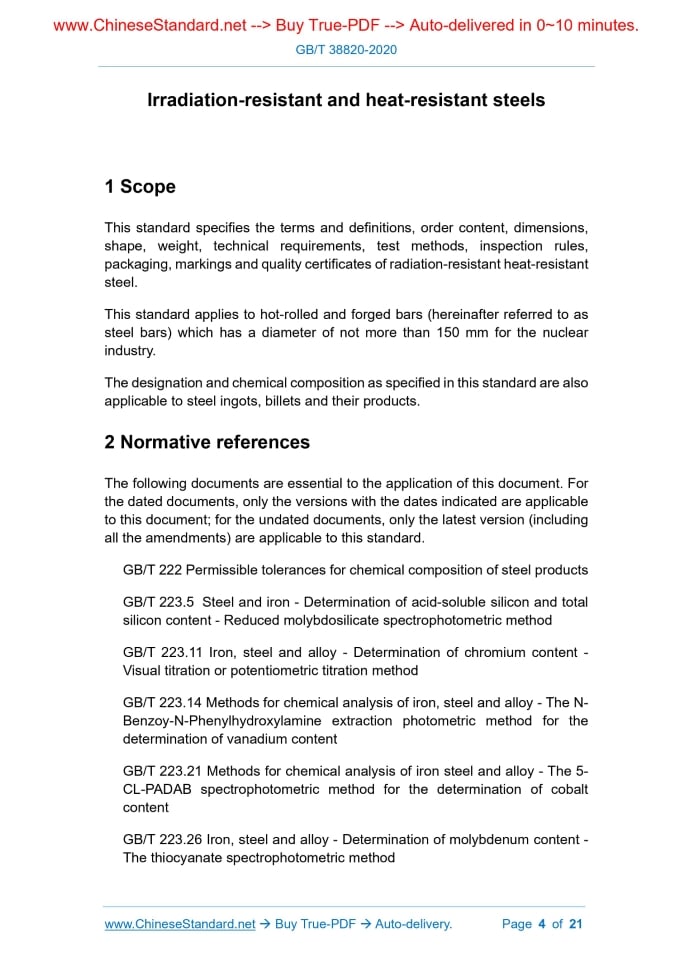 Similar standardsGB/T 38820-2020: Irradiation-resistant and heat-resistant steels---This is an excerpt. Full copy of true-PDF in English version (including equations, symbols, images, flow-chart, tables, and figures etc.), auto-downloaded/delivered in 9 seconds, can be purchased online: https://www.ChineseStandard.net/PDF.aspx/GBT38820-2020GB NATIONAL STANDARD OF THE PEOPLE’S REPUBLIC OF CHINA ICS 77.140.10 H 40 Irradiation-resistant and heat-resistant steels ISSUED ON: JUNE 02, 2020 IMPLEMENTED ON: DECEMBER 01, 2020 Issued by: State Administration for Market Regulation; Standardization Administration of PRC. Table of ContentsForeword ... 3 1 Scope ... 4 2 Normative references ... 4 3 Terms and definitions ... 8 4 Order content ... 8 5 Dimensions, appearance and weight ... 9 6 Technical requirements ... 9 7 Test method ... 12 8 Inspection rules ... 14 9 Packaging, marking and quality certificate ... 15 Appendix A (Informative) Physical properties of irradiation-resistant and heat- resistant steel ... 16 Appendix B (Normative) Testing method for neutron radiation performance .. 17 Irradiation-resistant and heat-resistant steels1 ScopeThis standard specifies the terms and definitions, order content, dimensions, shape, weight, technical requirements, test methods, inspection rules, packaging, markings and quality certificates of radiation-resistant heat-resistant steel. This standard applies to hot-rolled and forged bars (hereinafter referred to as steel bars) which has a diameter of not more than 150 mm for the nuclear industry. The designation and chemical composition as specified in this standard are also applicable to steel ingots, billets and their products.2 Normative referencesThe following documents are essential to the application of this document. For the dated documents, only the versions with the dates indicated are applicable to this document; for the undated documents, only the latest version (including all the amendments) are applicable to this standard. GB/T 222 Permissible tolerances for chemical composition of steel products GB/T 223.5 Steel and iron - Determination of acid-soluble silicon and total silicon content - Reduced molybdosilicate spectrophotometric method GB/T 223.11 Iron, steel and alloy - Determination of chromium content - Visual titration or potentiometric titration method GB/T 223.14 Methods for chemical analysis of iron, steel and alloy - The N- Benzoy-N-Phenylhydroxylamine extraction photometric method for the determination of vanadium content GB/T 223.21 Methods for chemical analysis of iron steel and alloy - The 5- CL-PADAB spectrophotometric method for the determination of cobalt content GB/T 223.26 Iron, steel and alloy - Determination of molybdenum content - The thiocyanate spectrophotometric method GB/T 223.86 Steel and iron - Determination of total carbon content - Infrared absorption method after combustion in an induction furnace GB/T 226 Test method for macrostructure and defect of steel by etching GB/T 228.1 Metallic materials - Tensile testing - Part 1: Method of test at room temperature GB/T 228.2 Metallic materials - Tensile testing - Part 2: Method of test at elevated temperature GB/T 229 Metallic materials - Charpy pendulum impact test method GB/T 231.1 Metallic materials - Brinell hardness test - Part 1: Test method GB/T 351 Metallic materials - Resistivity measurement method GB/T 702 Hot-rolled steel bars - Dimensions, shape, weight and tolerances GB/T 908 Forged bars - Dimensions, shape, weight and tolerances GB/T 2039 Metallic materials - Uniaxial creep testing method in tension GB/T 2101 General requirement of acceptance packaging marking and certification for section steel GB/T 2975 Steel and steel products - Location and preparation of samples and test pieces for mechanical testing GB/T 3217 Method of test of the magnetic properties of permanent magnetic (magnetically hard) materials GB/T 3651 Measuring method for thermal conductivity of metal at high temperature GB/T 3850 Impermeable sintered metal materials and hard metals - Determination of density GB/T 4067 Testing method for electrical resistance-temperature characteristic parameters of metallic materials GB/T 4339 Test methods for thermal expansion characteristic parameters of metallic materials GB/T 4340.1 Metallic materials - Vickers hardness test - Part 1: Test method GB/T 6394 Metal - Methods for estimating the average grain size GB/T 8170 Rules of rounding off for numerical values & expression and Differential scanning calorimetry3 Terms and definitionsThe following terms and definitions apply to this document. 3.1 Irradiation-resistant and heat-resistant steels The steel alloy which, after being irradiated by neutrons, has good elongation after fracture and low swelling rate, maintains high enduring strength, creep resistance and good chemical stability in high temperature environment, has low activation characteristics. Note: Low activation characteristics, that is, the radioactivity after neutron irradiation mainly comes from short-lived or medium-lived radioactive elements.4 Order contentThe contract or order for ordering according to this standard shall at least include the following contents: a) Number of this standard; b) Product name; c) Designation; d) Smelting method; e) Dimensions and allowable deviations (see Chapter 5); f) Order weight; g) Delivery status (if necessary, see 6.3.2); h) Qualified level of macrostructure (see 6.5); i) Qualified level of ultrasonic testing (see 6.9); j) Special requirements (if necessary, see 6.11). The steel bar shall be ultrasonically tested in accordance with NB/T 47013.3. Its qualification level shall be determined through negotiation between the supplier and the buyer and shall be indicated in the contract. 6.10 Surface quality 6.10.1 There shall be no visible cracks, scars, folds and inclusions on the surface of the steel bar. If the above defects exist, partial removal is allowed. The removal depth shall not exceed half 