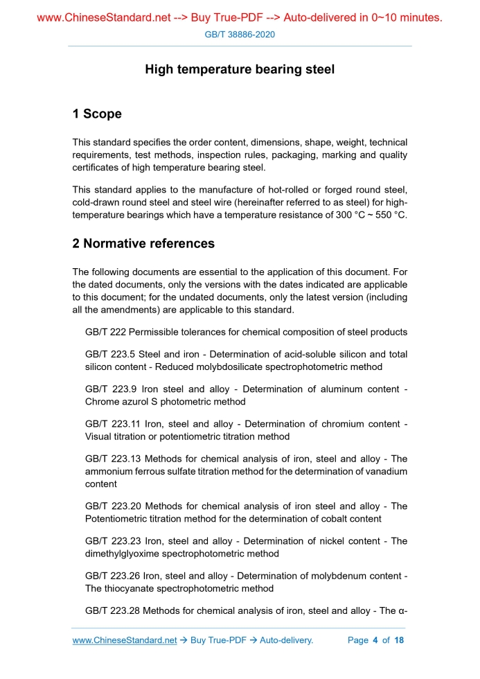 Similar standardsGB/T 38886-2020: High temperature bearing steel---This is an excerpt. Full copy of true-PDF in English version (including equations, symbols, images, flow-chart, tables, and figures etc.), auto-downloaded/delivered in 9 seconds, can be purchased online: https://www.ChineseStandard.net/PDF.aspx/GBT38886-2020GB NATIONAL STANDARD OF THE PEOPLE’S REPUBLIC OF CHINA ICS 77.140.10 H 40 High temperature bearing steel ISSUED ON: JUNE 02, 2020 IMPLEMENTED ON: DECEMBER 01, 2020 Issued by: State Administration for Market Regulation; Standardization Administration of PRC. Table of ContentsForeword ... 3 1 Scope ... 4 2 Normative references ... 4 3 Order content ... 7 4 Dimensions, appearance and weight ... 7 5 Technical requirements ... 9 6 Test method ... 14 7 Inspection rules ... 16 8 Packaging, marking, quality certificate ... 17 High temperature bearing steel1 ScopeThis standard specifies the order content, dimensions, shape, weight, technical requirements, test methods, inspection rules, packaging, marking and quality certificates of high temperature bearing steel. This standard applies to the manufacture of hot-rolled or forged round steel, cold-drawn round steel and steel wire (hereinafter referred to as steel) for high- temperature bearings which have a temperature resistance of 300 °C ~ 550 °C.2 Normative referencesThe following documents are essential to the application of this document. For the dated documents, only the versions with the dates indicated are applicable to this document; for the undated documents, only the latest version (including all the amendments) are applicable to this standard. GB/T 222 Permissible tolerances for chemical composition of steel products GB/T 223.5 Steel and iron - Determination of acid-soluble silicon and total silicon content - Reduced molybdosilicate spectrophotometric method GB/T 223.9 Iron steel and alloy - Determination of aluminum content - Chrome azurol S photometric method GB/T 223.11 Iron, steel and alloy - Determination of chromium content - Visual titration or potentiometric titration method GB/T 223.13 Methods for chemical analysis of iron, steel and alloy - The ammonium ferrous sulfate titration method for the determination of vanadium content GB/T 223.20 Methods for chemical analysis of iron steel and alloy - The Potentiometric titration method for the determination of cobalt content GB/T 223.23 Iron, steel and alloy - Determination of nickel content - The dimethylglyoxime spectrophotometric method GB/T 223.26 Iron, steel and alloy - Determination of molybdenum content - The thiocyanate spectrophotometric method GB/T 223.28 Methods for chemical analysis of iron, steel and alloy - The α- GB/T 224 Determination of the depth of decarburization of steels GB/T 226 Test method for macrostructure and defect of steel by etching GB/T 228.1 Metallic materials - Tensile testing - Part 1: Method of test at room temperature GB/T 230.1 Metallic materials - Rockwell hardness test - Part 1: Test method GB/T 231.1 Metallic materials - Brinell hardness test - Part 1: Test method GB/T 702-2017 Hot-rolled steel bars - Dimensions, shape, weight and tolerances GB/T 905-1994 Dimension, shape, weight and tolerance for cold-drawn round, square and hexagonal steels GB/T 908-2019 Forged bars for dimensions, shape, weight and tolerances GB/T 2101 General requirement of acceptance packaging marking and certification for section steel GB/T 2103 General requirements for acceptance, packing, marking and quality certification of steel wire GB/T 4162-2008 Forged and rolled steel bars - Method for ultrasonic testing GB/T 4336 Carbon and low-alloy steel - Determination of multi-element contents - Spark discharge atomic emission spectrometric method (routine method) GB/T 6394 Metal - Methods for estimating the average grain size GB/T 10561-2005 Steel - Determination of content of nonmetallic inclusions - Micrographic method using standards diagrams GB/T 11261 Steel and iron - Determination of oxygen content - The pulse heating inert gas fusion-infra-red absorption method GB/T 14979-1994 Eutectic carbide of steel - Micrographic method using Standard diagrams GB/T 15711 Inspection of non-metallic inclusions of steel - Etching test method of tower samples GB/T 18579-2019 High-carbon chromium bearing steel wires GB/T 20066 Steel and iron - Sampling and preparation of samples for the 5.11.6 The surface of peeled, polished or machine-polished steel shall not have harmful defects that affect the use of steel. 5.12 Special requirements According to the requirements of the buyer, as negotiated between the supplier and the buyer and indicated in the contract, it may add the following special inspection items: a) It may provide steel with a sulfur content of 0.015% ~ 0.060%; b) Tower hairline; c) Other requirements.6 Test method6.1 Surface quality The surface quality of steel shall be inspected visually or by other effective methods. 6.2 Dimensions and shape Steel size measurement is carried out by a caliper or template that can ensure the necessary accuracy. 6.3 Chemical composition 6.3.1 Sampling for chemical analysis shall be carried out in accordance with GB/T 20066. 6.3.2 The chemical analysis method shall be carried out according to the general methods such as GB/T 4336 and GB/T 20123. The arbitration shall be carried out according to standards GB/T 223.5, GB/T 223.9, GB/T 223.11, GB/T 223.13, GB/T 223.20, GB/T 223.23, GB/T 223.26, GB/T 223.28, GB/T 223.29, GB/T 223.31, GB/T 223.43, GB/T 223.47, GB/T 223.50, GB/T 223.53, GB/T 223.62, GB/T 223.63, GB/T 223.65, GB/T 223.77, GB/T 223.84, GB/T 223.85, GB/T 223.86. 6.3.3 The specimen for oxygen content shall be inspected after fully removing the decarburized layer. Its analysis method shall be carried out according to GB/T 11261. 6.4 Mechanical properties 6.4.1 The test method of Brinell hardness shall be carried out in accordance Where: D - The maximum carbide size, in micrometers (μm); α - The maximum length of