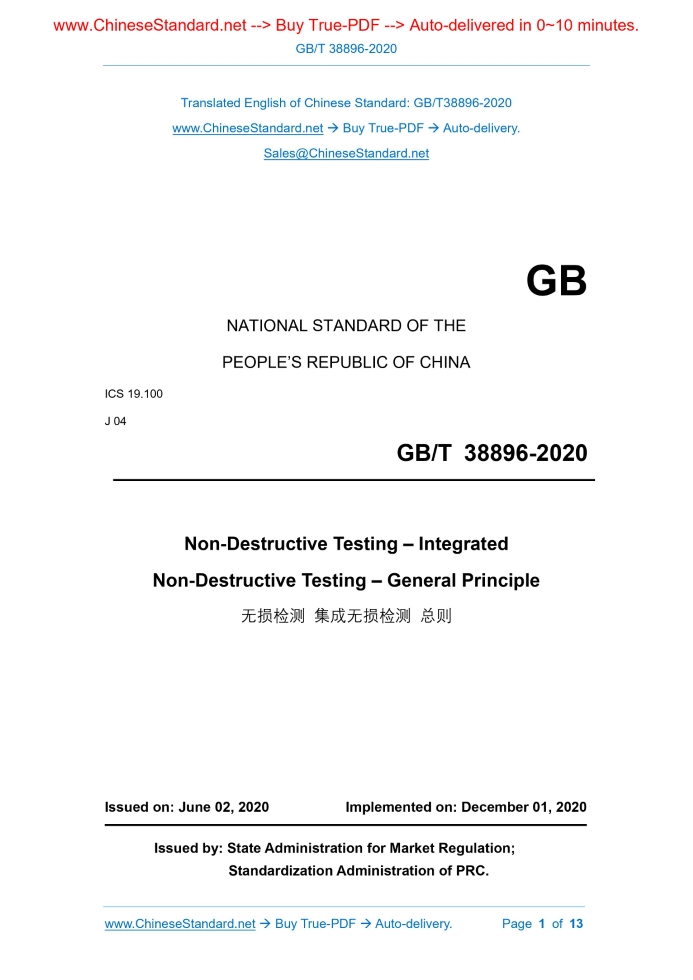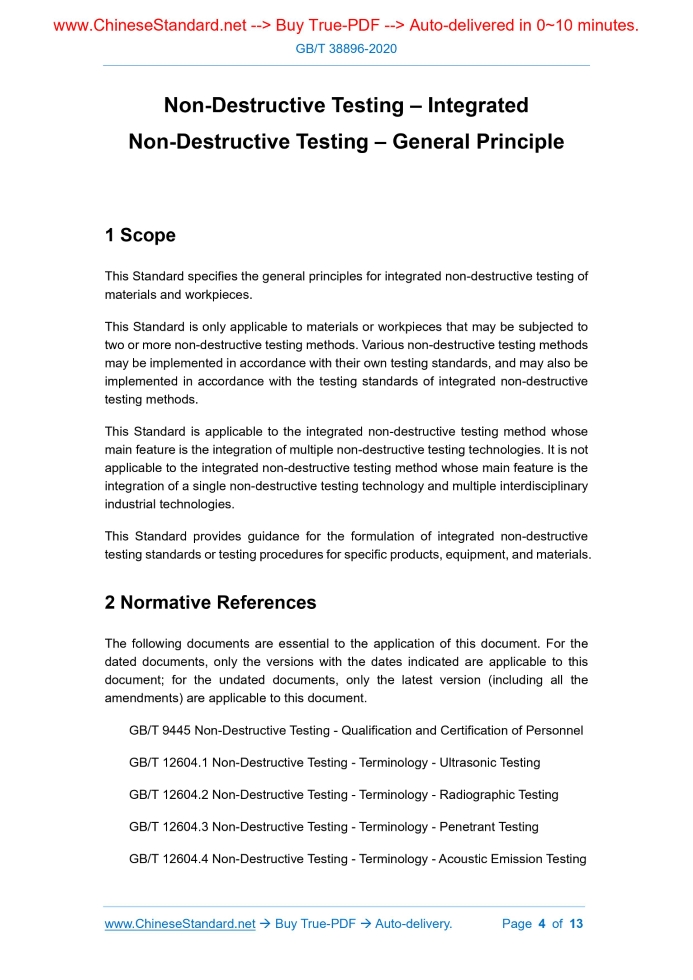Similar standardsGB/T 38896-2020: Non-destructive testing - Integrated non-destructive testing-General principles---This is an excerpt. Full copy of true-PDF in English version (including equations, symbols, images, flow-chart, tables, and figures etc.), auto-downloaded/delivered in 9 seconds, can be purchased online: https://www.ChineseStandard.net/PDF.aspx/GBT38896-2020GB NATIONAL STANDARD OF THE PEOPLE’S REPUBLIC OF CHINA ICS 19.100 J 04 Non-Destructive Testing – Integrated Non-Destructive Testing – General Principle ISSUED ON: JUNE 02, 2020 IMPLEMENTED ON: DECEMBER 01, 2020 Issued by: State Administration for Market Regulation; Standardization Administration of PRC. Table of ContentsForeword ... 3 1 Scope ... 4 2 Normative References ... 4 3 Terms and Definitions ... 5 4 Method Overview ... 6 5 Safety ... 9 6 Personnel ... 10 7 Testing Regulations ... 10 8 Testing Equipment ... 10 9 Test Report ... 12 Non-Destructive Testing – Integrated Non-Destructive Testing – General Principle1 ScopeThis Standard specifies the general principles for integrated non-destructive testing of materials and workpieces. This Standard is only applicable to materials or workpieces that may be subjected to two or more non-destructive testing methods. Various non-destructive testing methods may be implemented in accordance with their own testing standards, and may also be implemented in accordance with the testing standards of integrated non-destructive testing methods. This Standard is applicable to the integrated non-destructive testing method whose main feature is the integration of multiple non-destructive testing technologies. It is not applicable to the integrated non-destructive testing method whose main feature is the integration of a single non-destructive testing technology and multiple interdisciplinary industrial technologies. This Standard provides guidance for the formulation of integrated non-destructive testing standards or testing procedures for specific products, equipment, and materials.2 Normative ReferencesThe following documents are essential to the application of this document. For the dated documents, only the versions with the dates indicated are applicable to this document; for the undated documents, only the latest version (including all the amendments) are applicable to this document. GB/T 9445 Non-Destructive Testing - Qualification and Certification of Personnel GB/T 12604.1 Non-Destructive Testing - Terminology - Ultrasonic Testing GB/T 12604.2 Non-Destructive Testing - Terminology - Radiographic Testing GB/T 12604.3 Non-Destructive Testing - Terminology - Penetrant Testing GB/T 12604.4 Non-Destructive Testing - Terminology - Acoustic Emission Testing GB/T 12604.5 Non-Destructive Testing - Terminology - Magnetic Particle Testing GB/T 12604.6 Non-Destructive Testing - Terminology - Eddy Current Testing GB/T 12604.7 Non-Destructive Testing - Terminology - Leak Testing GB/T 12604.8 Non-Destructive Testing - Terminology - Neutron Testing GB/T 12604.9 Non-Destructive Testing - Terminology - Infrared Testing GB/T 12604.10 Non-Destructive Testing - Terminology - Magnetic Memory Testing GB/T 12604.11 Non-Destructive Testing - Terminology - X-Ray Digital Radioscopic Testing GB/T 16656.1 Industrial Automation Systems and Integration - Product Data Representation and Exchange - Part 1: Overview and Fundamental Principles GB/T 17645.1 Industrial Automation System and Integration – Part Warehouse - Part 1: Overview and Basic Principles GB/T 20737 Non-Destructive Testing - General Terms and Definitions GB/T 22270.1 Industrial Automation Systems and Integration - Service Interface for Testing Applications - Part 1: Overview GB/T 25485 Industrial Automation Systems and Integration - Functional Architecture of Manufacturing Execution System GB/T 25486 Networked Manufacturing - Technical Terminology GB/T 25507 Industry Foundation Classes Platform3 Terms and DefinitionsFor the purpose of this document, the terms and definitions given in GB/T 12604.1, GB/T 12604.2, GB/T 12604.3, GB/T 12604.4, GB/T 12604.5, GB/T 12604.6, GB/T 12604.7, GB/T 12604.8, GB/T 12604.9, GB/T 12604.10, GB/T 12604.11, GB/T 16656.1, GB/T 17645.1, GB/T 20737, GB/T 22270.1, GB/T 25485, GB/T 25486 and GB/T 25507 and the following apply. 3.1 Integrated non-destructive testing A comprehensive technology that integrates two or more independent non-destructive testing methods or technologies, has integrated testing apparatus and/or sensor hardware structure and integrated software structure, and can perform comprehensive processing like data fusion against the acquired test data and realize resource sharing. It is the main feature of integrated non-destructive testing to realize the integration of multiple non-destructive testing methods through the organic integration of multi- disciplinary technologies such as machinery, electronics, and information. When integrating non-destructive testing, the scanning mechanism and discontinuous position information of different types of testing methods are shared; the sensors of different testing methods have an integrated structure and become an organic whole; the excitation and/or receiving circuits, and the analog-to-digital conversion circuit of different testing methods are shared. By integrating the testing information of different types of non-destructive testing methods, the surface and internal discontinuities and discontinuities of different directions of the tested object can be tested at the same time; it can also test and characterize the surface performance and/or stress state, etc. of the tested object. Therefore, the integrated non-destructive testing apparatus has better economy, the testing process has higher efficiency, and the accuracy and reliability of testing results are higher. 4.2 Technology Integrated non-destructive testing generally includes the following modes such as non- destructive testing instrument integration, non-destructive testing network integ