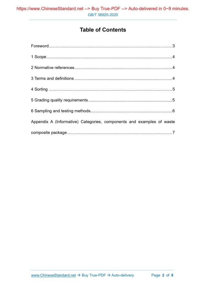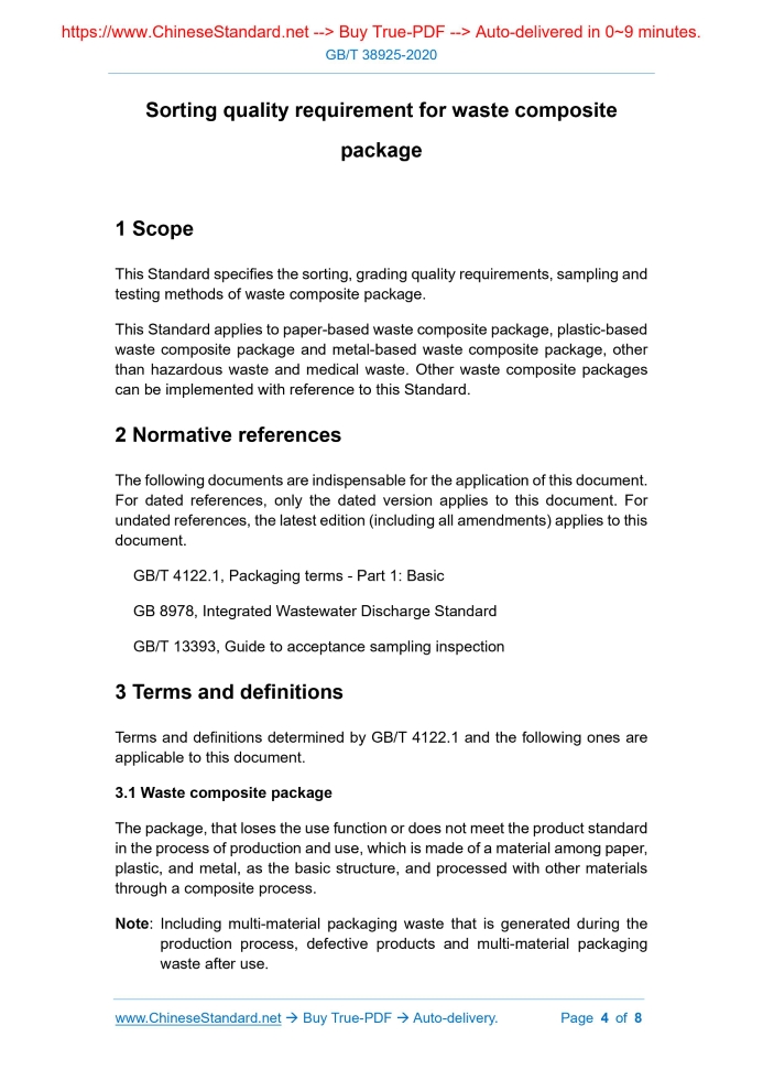 Similar standardsGB/T 38925-2020: Sorting quality requirement for waste composite package---This is an excerpt. Full copy of true-PDF in English version (including equations, symbols, images, flow-chart, tables, and figures etc.), auto-downloaded/delivered in 9 seconds, can be purchased online: https://www.ChineseStandard.net/PDF.aspx/GBT38925-2020GB NATIONAL STANDARD OF THE PEOPLE’S REPUBLIC OF CHINA ICS 13.030.50 Z 05 Sorting quality requirement for waste composite package ISSUED ON: JUNE 02, 2020 IMPLEMENTED ON: DECEMBER 01, 2020 Issued by: State Administration for Market Regulation; Standardization Administration of the People’s Republic of China. Table of ContentsForeword ... 3 1 Scope ... 4 2 Normative references ... 4 3 Terms and definitions ... 4 4 Sorting ... 5 5 Grading quality requirements ... 5 6 Sampling and testing methods ... 6 Appendix A (Informative) Categories, components and examples of waste composite package ... 7 Sorting quality requirement for waste composite package1 ScopeThis Standard specifies the sorting, grading quality requirements, sampling and testing methods of waste composite package. This Standard applies to paper-based waste composite package, plastic-based waste composite package and metal-based waste composite package, other than hazardous waste and medical waste. Other waste composite packages can be implemented with reference to this Standard.2 Normative referencesThe following documents are indispensable for the application of this document. For dated references, only the dated version applies to this document. For undated references, the latest edition (including all amendments) applies to this document. GB/T 4122.1, Packaging terms - Part 1: Basic GB 8978, Integrated Wastewater Discharge Standard GB/T 13393, Guide to acceptance sampling inspection3 Terms and definitionsTerms and definitions determined by GB/T 4122.1 and the following ones are applicable to this document. 3.1 Waste composite package The package, that loses the use function or does not meet the product standard in the process of production and use, which is made of a material among paper, plastic, and metal, as the basic structure, and processed with other materials through a composite process. Note: Including multi-material packaging waste that is generated during the production process, defective products and multi-material packaging waste after use. 3.2 Carried-waste content The percentage of carried-wastes, such as ceramics, glass, cement blocks, stones, sand, and food residues, in the mass of waste composite package.4 Sorting4.1 The carried-wastes in the waste composite package shall be sorted, so as to ensure the purity of the materials that are obtained from recycling. 4.2 Classification and sorting shall be carried out according to the main components of waste composite package materials. See Appendix A for the categories, components and examples of waste composite package. 4.3 The waste composite package shall not be mixed with hazardous waste, medical waste, heavy metal compounds and other carried wastes. 4.4 Automatic sorting equipment, such as magnetic sorting, gravity sorting, and photoelectric sorting, should be used during the sorting process. 4.5 The sorting personnel shall be equipped with necessary safety protection products, such as protective gloves, dust masks and work clothes. 4.6 The solid waste which is generated during the sorting process shall be handed over to an organization that is equipped with relevant qualifications for disposal. 4.7 The waste water from sorting operations shall be collected for treatment. Separate treatment or centralized treatment shall be selected according to the condition of the pollutants. Wastewater discharge shall meet the requirements of GB 8978 or local water pollutant discharge standards. High-efficiency, energy-saving and environmentally friendly sludge treatment processes should be used; otherwise, it should be handed over to a qualified waste treatment organization to realize the harmless treatment of sludge.5 Grading quality requirementsSee Table 1 for the grading indexes and quality requirements of waste composite package. Table 1 -- Grading indexes and quality requirements of waste composite package ......Source: Above contents are excerpted from the full-copy PDF -- translated/reviewed by: www.ChineseStandard.net / Wayne Zheng et al. Tips & Frequently Asked Questions:Question 1: How long will the true-PDF of English version of GB/T 38925-2020 be delivered?Answer: The full copy PDF of English version of GB/T 38925-2020 can be downloaded in 9 seconds, and it will also be emailed to you in 9 seconds (double mechanisms to ensure the delivery reliably), with PDF-invoice.Question 2: Can I share the purchased PDF of GB/T 38925-2020_English with my colleagues?Answer: Yes. The purchased PDF of GB/T 38925-2020_English will be deemed to be sold to your employer/organization who actually paid for it, including your colleagues and your employer's intranet.Question 3: Does the price include tax/VAT?Answer: Yes. Our tax invoice, downloaded/delivered in 9 seconds, includes all tax/VAT and complies with 100+ countries' tax regulations (tax exempted in 100+ countries) -- See Avoidance of Double Taxation Agreements (DTAs): List of DTAs signed between Singapore and 100+ countriesQuestion 4: Do you accept my currency other than USD?Answer: Yes. www.ChineseStandard.us -- GB/T 38925-2020 -- Click this link and select your country/currency to pay, the exact amount in your currency will be printed on the invoice. Full PDF will also be downloaded/emailed in 9 seconds.How to buy and download a true PDF of English version of GB/T 38925-2020?A step-by-step guide to download PDF of GB/T 38925-2020_EnglishStep 1: Visit website https://www.ChineseStandard.net (Pay in USD), or https://www.ChineseStandard.us (Pay in any currencies such as Euro, KRW, JPY, AUD).Step 2: Search keyword "GB/T 38925-2020". Step 3: Click "Add to Cart". If multiple PDFs
