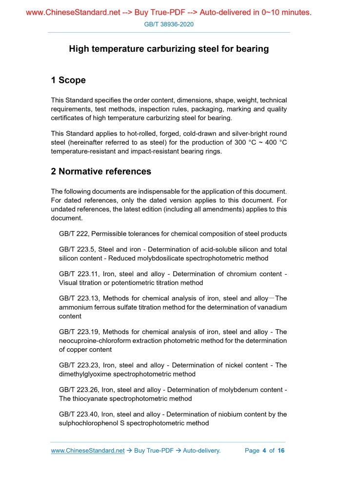 Similar standardsGB/T 38936-2020: High temperature carburizing steel for bearing---This is an excerpt. Full copy of true-PDF in English version (including equations, symbols, images, flow-chart, tables, and figures etc.), auto-downloaded/delivered in 9 seconds, can be purchased online: https://www.ChineseStandard.net/PDF.aspx/GBT38936-2020GB NATIONAL STANDARD OF THE PEOPLE’S REPUBLIC OF CHINA ICS 77.140.10 H 40 High temperature carburizing steel for bearing ISSUED ON: JUNE 02, 2020 IMPLEMENTED ON: DECEMBER 01, 2020 Issued by: State Administration for Market Regulation; Standardization Administration of the People’s Republic of China. Table of ContentsForeword ... 3 1 Scope ... 4 2 Normative references ... 4 3 Order content ... 7 4 Dimensions, shape, weight ... 7 5 Technical requirements ... 9 6 Test method ... 13 7 Inspection rules ... 14 8 Packaging, marking and quality certificate ... 15 Appendix A (Informative) Comparison of this Standard designation and the old designation ... 16 High temperature carburizing steel for bearing1 ScopeThis Standard specifies the order content, dimensions, shape, weight, technical requirements, test methods, inspection rules, packaging, marking and quality certificates of high temperature carburizing steel for bearing. This Standard applies to hot-rolled, forged, cold-drawn and silver-bright round steel (hereinafter referred to as steel) for the production of 300 °C ~ 400 °C temperature-resistant and impact-resistant bearing rings.2 Normative referencesThe following documents are indispensable for the application of this document. For dated references, only the dated version applies to this document. For undated references, the latest edition (including all amendments) applies to this document. GB/T 222, Permissible tolerances for chemical composition of steel products GB/T 223.5, Steel and iron - Determination of acid-soluble silicon and total silicon content - Reduced molybdosilicate spectrophotometric method GB/T 223.11, Iron, steel and alloy - Determination of chromium content - Visual titration or potentiometric titration method GB/T 223.13, Methods for chemical analysis of iron, steel and alloy-The ammonium ferrous sulfate titration method for the determination of vanadium content GB/T 223.19, Methods for chemical analysis of iron, steel and alloy - The neocuproine-chloroform extraction photometric method for the determination of copper content GB/T 223.23, Iron, steel and alloy - Determination of nickel content - The dimethylglyoxime spectrophotometric method GB/T 223.26, Iron, steel and alloy - Determination of molybdenum content - The thiocyanate spectrophotometric method GB/T 223.40, Iron, steel and alloy - Determination of niobium content by the sulphochlorophenol S spectrophotometric method GB/T 905-1994, Dimension, shape, weight and tolerance for cold-drawn round, square and hexagonal steels GB/T 908-2019, Forged bars for dimensions, shape, weight and tolerances GB/T 2101, General requirement of acceptance, packaging, marking and certification for section steel GB/T 3207-2008, Bright steel GB/T 4162-2008, Forged and rolled steel bars - Method for ultrasonic testing GB/T 4336, Carbon and low-alloy steel - Determination of multi-element contents - Spark discharge atomic emission spectrometric method (routine method) GB/T 6394, Determination of estimating the average grain size of metal GB/T 10121, Steel products - Method for magnetic particle inspection of tower sample GB/T 10561-2005, Steel - Determination of content of nonmetallic inclusions - Micrographic method using standards diagrams GB/T 11261, Steel and iron - Determination of oxygen content - The pulse heating inert gas fusion-infra-red absorption method GB/T 15711, Inspection of non-metallic inclusions of steel - Etching test method of tower samples GB/T 20066, Steel and iron - Sampling and preparation of samples for the determination of chemical composition GB/T 20123, Steel and iron - Determination of total carbon and sulfur content Infrared absorption method after combustion in an induction furnace (routine method) GB/T 20125, Low-alloy steel - Determination of multi-element contents - Inductively coupled plasma atomic emission spectrometric method GB/T 32548, Steel and iron - Determination of tin, antimony, cerium, lead and bismuth - Inductively coupled plasma mass spectrometric method GB/T 36026-2018, High-strength corrosion-resistant alloy bars for oil and gas engineering Cold-drawn round steel Diameter ≤ 25 3 0.4% × length Diameter > 25 2 0.3% × length Silver-bright round steel 2 0.3% × length After negotiation between the supplier and the buyer and indicated in the contract, the bending of the steel can also be delivered in accordance with other regulations. 4.2.3 Torsion The steel shall not have significant torsion. 4.2.4 End shape 4.2.4.1 The ends of the steel shall be sawed or cut neatly; there shall be no flashes, burrs, beveling and flattening that affect the use. Steel must not be gas- cut. 4.2.4.2 If the steel needs to be chamfered, it shall be specified in the contract. 4.3 Weight 4.3.1 The steel is delivered according to actual weight. 4.3.2 When cold-drawn round steel is delivered in a plate shape, the weight of the plate shall be determined through negotiation between the supplier and the buyer and indicated in the contract.5 Technical requirements5.1 Designation and chemical composition 5.1.1 The steel designation and chemical composition (melting analysis) shall comply with the requirements of Table 4. 5.1.2 The chemical compositions Sn, As, Sb, Pb, Ti, Al, Ca shall be reported as actual-measured values. 5.1.3 The oxygen content of the finished steel (or billet) is reported as the actual-measured value. 5.1.4 The allowable deviation of chemical composition of the finished steel (or billet) shall meet the requirements of GB/T 222. Table 4 -- Designation and chemical composition Table 8 -- Allowable removal depth of harmful defects on the surface in mill