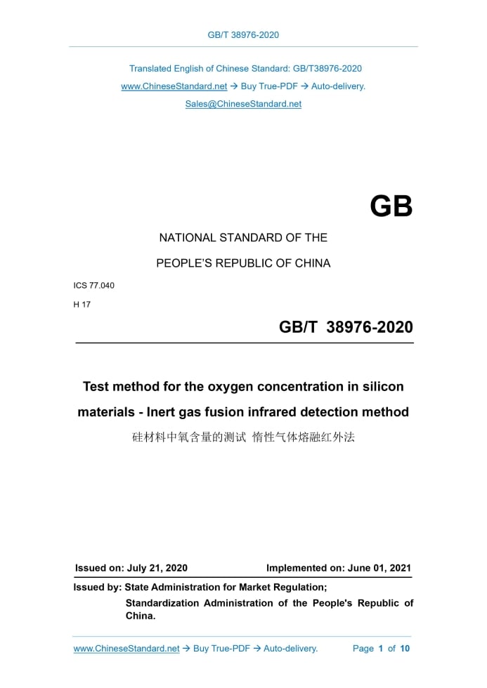 GB/T 38976-2020: Test method for the oxygen concentration in silicon materials - Inert gas fusion infrared detection method Delivery: 9 seconds. True-PDF full-copy in English & invoice will be downloaded + auto-delivered via email. See step-by-step procedure Status: Valid