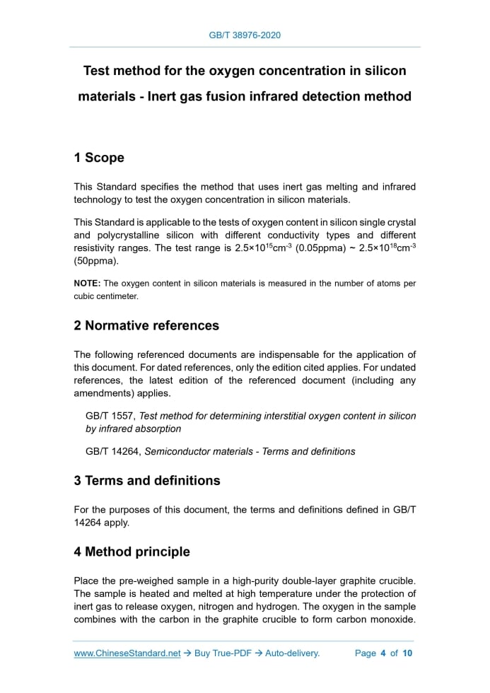 Similar standardsGB/T 38976-2020: Test method for the oxygen concentration in silicon materials - Inert gas fusion infrared detection method---This is an excerpt. Full copy of true-PDF in English version (including equations, symbols, images, flow-chart, tables, and figures etc.), auto-downloaded/delivered in 9 seconds, can be purchased online: https://www.ChineseStandard.net/PDF.aspx/GBT38976-2020 GB NATIONAL STANDARD OF THE PEOPLE’S REPUBLIC OF CHINA ICS 77.040 H 17 Test method for the oxygen concentration in silicon materials - Inert gas fusion infrared detection method ISSUED ON: JULY 21, 2020 IMPLEMENTED ON: JUNE 01, 2021 Issued by: State Administration for Market Regulation; Standardization Administration of the People's Republic of China. Table of ContentsForeword ... 3 1 Scope ... 4 2 Normative references ... 4 3 Terms and definitions ... 4 4 Method principle ... 4 5 Disturbing factors ... 5 6 Reagents ... 6 7 Instruments ... 7 8 Samples ... 7 9 Drawing of calibration curve ... 8 10 Test steps ... 8 11 Precision ... 9 12 Test report ... 9 Test method for the oxygen concentration in silicon materials - Inert gas fusion infrared detection method1 ScopeThis Standard specifies the method that uses inert gas melting and infrared technology to test the oxygen concentration in silicon materials. This Standard is applicable to the tests of oxygen content in silicon single crystal and polycrystalline silicon with different conductivity types and different resistivity ranges. The test range is 2.5×1015cm-3 (0.05ppma) ~ 2.5×1018cm-3 (50ppma). NOTE: The oxygen content in silicon materials is measured in the number of atoms per cubic centimeter.2 Normative referencesThe following referenced documents are indispensable for the application of this document. For dated references, only the edition cited applies. For undated references, the latest edition of the referenced document (including any amendments) applies. GB/T 1557, Test method for determining interstitial oxygen content in silicon by infrared absorption GB/T 14264, Semiconductor materials - Terms and definitions3 Terms and definitionsFor the purposes of this document, the terms and definitions defined in GB/T 14264 apply.4 Method principlePlace the pre-weighed sample in a high-purity double-layer graphite crucible. The sample is heated and melted at high temperature under the protection of inert gas to release oxygen, nitrogen and hydrogen. The oxygen in the sample combines with the carbon in the graphite crucible to form carbon monoxide. Nitrogen and hydrogen are released as nitrogen and hydrogen, respectively. Depending on the test instrument, the content of carbon monoxide can be directly measured by a non-dispersive infrared detector. It is also possible to oxidize carbon monoxide through a heated rare earth copper oxide catalyst under the transportation of inert gas to generate carbon dioxide, and the content of carbon dioxide is measured by infrared testing equipment. The test instrument performs blank deduction based on the content of carbon monoxide or carbon dioxide. Combined with the weight of the sample, the oxygen content in the tested sample is finally obtained.5 Disturbing factors5.1 Inert gas (helium or argon) is as the carrier gas in the test instrument. The impurities contained therein may adsorb the oxygen released by the silicon material sample, thereby affecting the test results. Therefore, it is recommended to use high purity gas with a purity (volume fraction) not less than 99.99% to improve the accuracy of the test. At the same time, sodium hydroxide (super-grade pure) can be used to absorb the residual carbon dioxide in the inert gas. Anhydrous magnesium perchlorate (MgClO4) is used to absorb water in inert gas. Copper chips are used to absorb oxygen in the inert gas. Reduce the influence of the inert gas on the test results. 5.2 The use of single-layer graphite crucible will cause temperature fluctuations, which will affect the test results, so double-layer graphite crucibles shall be used. 5.3 The oxygen in the graphite crucible will also continue to be released during the test. Therefore, crucibles made of high-purity graphite shall be used. Confirm the purity of the graphite crucible before the test to reduce the impact on the test results. 5.4 The calibration curve is the key to the reliability of oxygen content testing. The establishment of the silicon single crystal calibration curve is based on the test results of the interstitial oxygen content in the silicon single crystal sample by the method specified in GB/T 1557. Therefore, it is necessary to ensure that the test values of the samples used to establish the calibration curve are accurate and reliable. 5.5 This method uses the test results of GB/T 1557 as the calibration curve, which indirectly reflects the interstitial oxygen content in silicon. The oxygen content value measured by this method is directly related to the gap oxygen content calibration factor selected by the calibration curve. 5.6 The detection limit of this method is related to the blank value of the instrument. The difference of the test equipment and the difference in the test process will have an impact on the detection limit.9 Drawing of calibration curveUse at least 2~3 silicon single crystal reference samples with traceable oxygen content and 1 blank reference sample. Test according to GB/T 1557 and 10.4.1~10.4.5 respectively. Establish a calibration curve. The oxygen content range of the reference sample shall cover the oxygen content of the sample to be tested.10 Test steps10.1 Instrument preparation Check the working status of the instrument. After the instrument is fully warmed up, perform leak detection and analysis to ensure that the instrument has no air leakage. 10.2 Blank test Use an empty double-layer graphite crucible to perform a blank test according to 10.4.2~10.4.5. Test at least 3 times in parallel. Take the average value until the standard deviation of the 