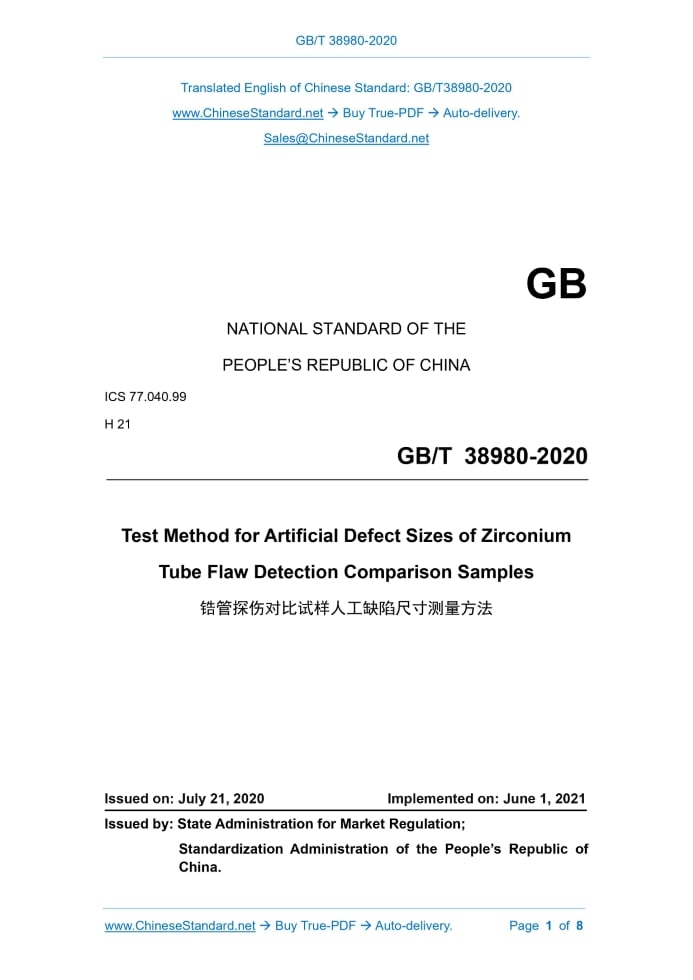 GB/T 38980-2020: Test method for artificial defect sizes of zirconium tube flaw detection comparison samples Delivery: 9 seconds. True-PDF full-copy in English & invoice will be downloaded + auto-delivered via email. See step-by-step procedure Status: Valid