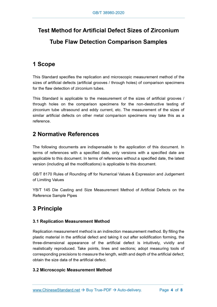 Similar standardsGB/T 38980-2020: Test method for artificial defect sizes of zirconium tube flaw detection comparison samples---This is an excerpt. Full copy of true-PDF in English version (including equations, symbols, images, flow-chart, tables, and figures etc.), auto-downloaded/delivered in 9 seconds, can be purchased online: https://www.ChineseStandard.net/PDF.aspx/GBT38980-2020 GB NATIONAL STANDARD OF THE PEOPLE’S REPUBLIC OF CHINA ICS 77.040.99 H 21 Test Method for Artificial Defect Sizes of Zirconium Tube Flaw Detection Comparison Samples ISSUED ON: JULY 21, 2020 IMPLEMENTED ON: JUNE 1, 2021 Issued by: State Administration for Market Regulation; Standardization Administration of the People’s Republic of China. Table of ContentsForeword ... 3 1 Scope ... 4 2 Normative References ... 4 3 Principle ... 4 4 Selection of Methods ... 5 5 Replication Measurement Method ... 5 6 Microscopic Measurement Method ... 5 7 Data Processing ... 7 8 Test Report ... 8 Test Method for Artificial Defect Sizes of Zirconium Tube Flaw Detection Comparison Samples1 ScopeThis Standard specifies the replication and microscopic measurement method of the sizes of artificial defects (artificial grooves / through holes) of comparison specimens for the flaw detection of zirconium tubes. This Standard is applicable to the measurement of the sizes of artificial grooves / through holes on the comparison specimens for the non-destructive testing of zirconium tube ultrasound and eddy current, etc. The measurement of the sizes of similar artificial defects on other metal comparison specimens may take this as a reference.2 Normative ReferencesThe following documents are indispensable to the application of this document. In terms of references with a specified date, only versions with a specified date are applicable to this document. In terms of references without a specified date, the latest version (including all the modifications) is applicable to this document. GB/T 8170 Rules of Rounding off for Numerical Values & Expression and Judgement of Limiting Values YB/T 145 Die Casting and Size Measurement Method of Artificial Defects on the Reference Sample Pipes3 Principle3.1 Replication Measurement Method Replication measurement method is an indirection measurement method. By filling the plastic material in the artificial defect and taking it out after solidification forming, the three-dimensional appearance of the artificial defect is intuitively, vividly and realistically reproduced. Take points, lines and sections; adopt measuring tools of corresponding precisions to measure the length, width and depth of the artificial defect; obtain the size data of the artificial defect. 3.2 Microscopic Measurement Method a high magnification to focus on the specimen. Adjust the stage and the specimen, so that the artificial defect is in the center of the field of view. Adjust the measurement equipment, so that the plane of measurement can clearly focus; select the measurement point. 6.3.1.4 The magnification for the measurement of the length and width of the artificial groove is not lower than 100 ; the magnification for the measurement of the depth is not lower than 200 ; the magnification for the measurement of the through hole is not lower than 100 . 6.3.2 Measurement of artificial groove 6.3.2.1 Measurement of length and width: on the length or width boundary of the artificial groove, determine the measurement point and perform the aiming reading. In accordance with the relative displacement of the X or Y coordinates between the points on the two boundaries in the length or width direction, calculate the length or width value. The length measurement of transverse flaw shall be corrected in accordance with the measured chord length. 6.3.2.2 Measurement of depth: on the surface and the bottom of the opening of the artificial groove, respectively perform focus reading. In accordance with the relative displacement of the Z coordinate during two focusing, calculate the depth value. 6.3.3 Measurement of through hole On the circumference of the through hole, randomly choose three points. Through the coordinates of the three points, calculate the diameter of the circle.7 Data Processing7.1 Replication Measurement Method For the depth and width of each artificial defect, the maximum value of the cross- sectional dissection measurement results taken from three points in the length direction of the replication sample is taken as the measurement result; the length is measured with a Vernier caliper. The measurement data shall be rounded off in accordance with the stipulations of GB/T 8170. 7.2 Microscopic Measurement Method For the measurement of the artificial grooves, the measurement of the sizes of each artificial defect shall at least measure three points. The principle of point selection is: respectively one point near the two ends and the middle position; repeat the measurement for 3 times at each point and take the average value; the maximum value of the three points is used as the measurement result. For the measurement of through holes, each through hole shall be measured for 3 times on the circumference (the ......Source: Above contents are excerpted from the full-copy PDF -- translated/reviewed by: www.ChineseStandard.net / Wayne Zheng et al. Tips & Frequently Asked Questions:Question 1: How long will the true-PDF of English version of GB/T 38980-2020 be delivered?Answer: The full copy PDF of English version of GB/T 38980-2020 can be downloaded in 9 seconds, and it will also be emailed to you in 9 seconds (double mechanisms to ensure the delivery reliably), with PDF-invoice.Question 2: Can I share the purchased PDF of GB/T 38980-2020_English with my colleagues?Answer: Yes. The purchased PDF of GB/T 38980-2020_English will be deemed to be sold to your employer/organization who actually paid for it, including your colleagues and your employer's intranet.Question 3: Does the price include tax/VAT?Answer: Yes. Our tax invoice