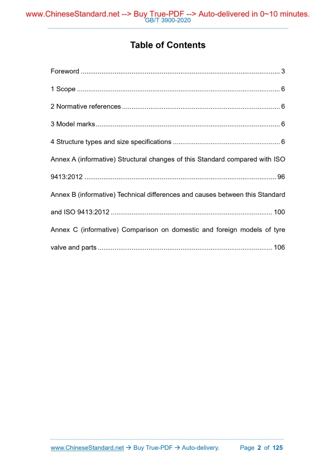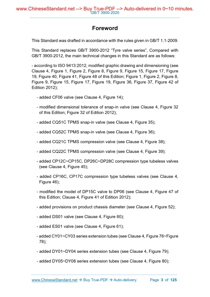 GB/T 3900-2020: Tyre valve series---This is an excerpt. Full copy of true-PDF in English version (including equations, symbols, images, flow-chart, tables, and figures etc.), auto-downloaded/delivered in 9 seconds, can be purchased online: https://www.ChineseStandard.net/PDF.aspx/GBT3900-2020NATIONAL STANDARD OF THE PEOPLE’S REPUBLIC OF CHINA ICS 83.160.01 G 41 Replacing GB/T 3900-2012 Tyre valve series (ISO 9413.2012, Tyre valves - Dimensions and designation, MOD) Issued on. MARCH 06, 2020 Implemented on. FEBRUARY 01, 2021 Issued by. State Administration for Market Regulation; Standardization Administration of the People's Republic of China. Table of ContentsForeword... 3 1 Scope... 6 2 Normative references... 6 3 Model marks... 6 4 Structure types and size specifications... 6 Annex A (informative) Structural changes of this Standard compared with ISO 9413.2012... 96 Annex B (informative) Technical differences and causes between this Standard and ISO 9413.2012... 100 Annex C (informative) Comparison on domestic and foreign models of tyre valve and parts... 106ForewordThis Standard was drafted in accordance with the rules given in GB/T 1.1-2009. This Standard replaces GB/T 3900-2012 “Tyre valve series”, Compared with GB/T 3900-2012, the main technical changes in this Standard are as follows. - according to ISO 9413.2012, modified graphic drawing and dimensioning (see Clause 4, Figure 1, Figure 2, Figure 8, Figure 9, Figure 15, Figure 17, Figure 19, Figure 40, Figure 41, Figure 48 of this Edition; Figure 1, Figure 2, Figure 8, Figure 9, Figure 15, Figure 17, Figure 19, Figure 36, Figure 37, Figure 42 of Edition 2012); - added CF06 valve (see Clause 4, Figure 14); - modified dimensional tolerance of snap-in valve (see Clause 4, Figure 32 of this Edition; Figure 32 of Edition 2012); - added CQ51C TPMS snap-in valve (see Clause 4, Figure 35); - added CQ52C TPMS snap-in valve (see Clause 4, Figure 36); - added CQ21C TPMS compression valve (see Clause 4, Figure 38); - added CQ22C TPMS compression valve (see Clause 4, Figure 39); - added CP12C~CP15C, DP26C~DP28C compression type tubeless valves (see Clause 4, Figure 45); - added CP16C, CP17C compression type tubeless valves (see Clause 4, Figure 46); - modified the model of DP15C valve to DP06 (see Clause 4, Figure 47 of this Edition; Clause 4, Figure 41 of Edition 2012); - added provisions on product chassis diameter (see Clause 4, Figure 52); - added DS01 valve (see Clause 4, Figure 60); - added ES01 valve (see Clause 4, Figure 61); - added CY01~CY03 series extension tubes (see Clause 4, Figure 76~Figure 78); - added DY01~DY04 series extension tubes (see Clause 4, Figure 79); - added DY05~DY08 series extension tubes (see Clause 4, Figure 80); - added DY09-T, DY10-T, DY11-T series TPMS extension tubes (see Clause 4, Figure 81~Figure 83); - added EY01-T series TPMS extension tubes (see Clause 4, Figure 84); - added HY01~HY03 series large core chamber extension tubes (see Clause 4, Figure 85~Figure 87); - deleted B09C gasket (see Clause 4, Figure 68 of Edition 2012); - deleted E08C hexagon nut (see Clause 4, Figure 69 of Edition 2012); - added the maximum operating pressure of the valve and the recommended installation torque of the compact tubeless valve (see Annex C of this Edition, Annex C of Edition 2012). This Standard uses redrafting method to modify and adopt ISO 9413.2012 “Tyre valves - Dimensions and designation”. Compared with ISO 9413.2012, this Standard is structurally adjusted. Annex A lists the comparison on clauses and subclauses between this Standard and ISO 9413.2012. Compared with ISO 9413.2012, there are technical differences in this Standard. The clauses involved in these differences have been identified by vertical single lines (︱) in the margins of their outer margins. Annex B gives a list of the technical differences between this Standard and ISO 9413.2012 and their causes. This Standard also made the following editorial modifications. - used “Tyre valve series” to replace the name of ISO 9413.2012 “Tyre valves - Dimensions and designation”. This Standard was proposed by China Petroleum and Chemical Industry Federation. This Standard shall be under the jurisdiction of National Technical Committee on Tyres and Rims of Standardization Administration of China (SAC/TC 19). The drafting organizations of this Standard. Shandong Gaotian Metal Manufacturing Co., Ltd., Baolong (Anhui) Auto Parts Co., Ltd., Xiamen Xiahui Rubber Metal Industry Co., Ltd., Jiangyin Bor Auto Parts Industry Co., Ltd., Jiangyin Chuangxin Valve Co., Ltd., Ningbo Haofeng Cisco Auto Parts Co., Ltd., Jiangyin Tianmeng Auto Parts Technology Co., Ltd., Gaomi Tongchuang Valve Core Co., Ltd., Yuyao Renke Electromechanical Technology Co., Ltd., Wantong Intelligent Control Technology Co., Ltd., Cixi Jingwei Valve Co., Ltd., Jiangyin Tianshun Auto Parts Co., Ltd. Main drafters of this Standard. Li Feng, Liang Ping, Nie Yangyang, Ma Yongfeng, Cao Chengwei, Li Yunxiang, Tang Yu, Li Jian, He Zhangbin, Jiang Shuqin, Qiu Xiaojie, Wang Huiqing. Versions of standard substituted by this Standard are. - GB/T 3900-1983, GB/T 3900-1991, GB/T 3900-1997, GB/T 3900-2003, GB/T 3900-2012. Tyre valve series1 ScopeThis Standard specifies model marks, structure types and size specifications of tyre valve (hereinafter referred to as “the valve”).2 Normative referencesThe following referenced documents are indispensable for the application of this document. For dated references, only the edition cited applies. For undated references, the latest edition of the referenced document (including any amendments) applies.3 Model marksThe model marks of product shall comply with the provisions of GB/T 21285. See Annex C for the comparison of domestic and foreign models of the valve and parts.4 Structure types and size specificationsThe adaptation type of the valve core chamber shall comply with the provisions of Annex D.Annex A(informative) Structural changes of this Stan