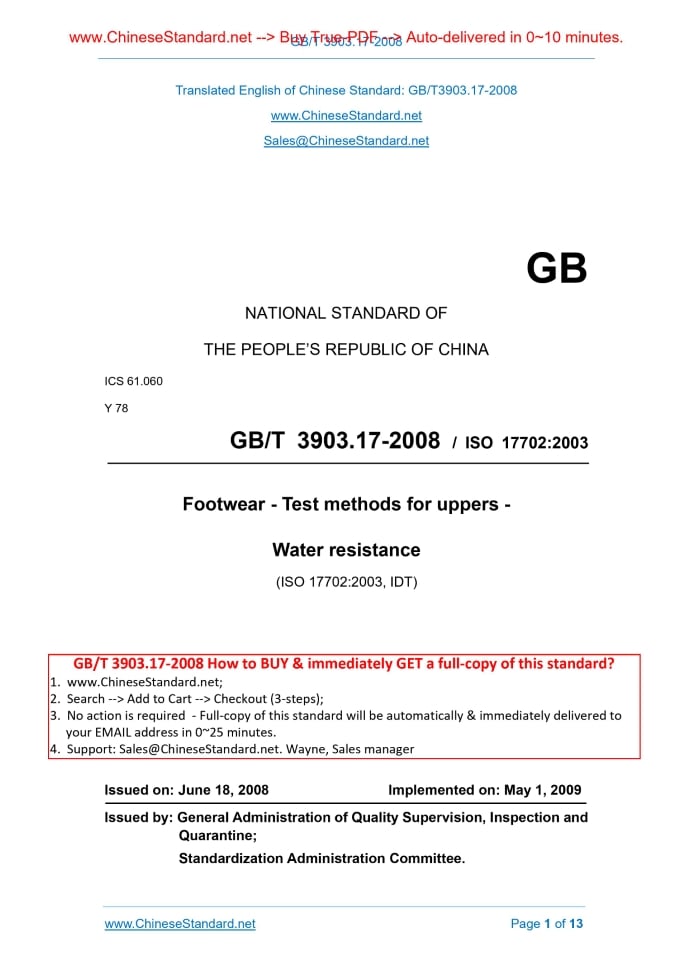 GB/T 3903.17-2008: Footwear -- Test methods for uppers -- Water resistance Delivery: 9 seconds. True-PDF full-copy in English & invoice will be downloaded + auto-delivered via email. See step-by-step procedure Status: Valid