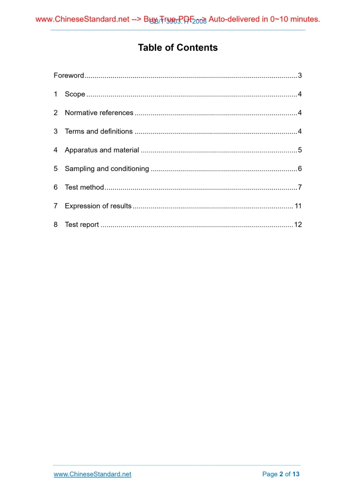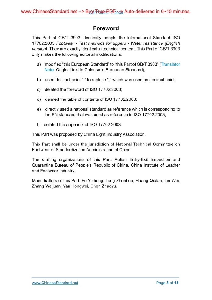 Similar standardsGB/T 3903.17-2008: Footwear -- Test methods for uppers -- Water resistance---This is an excerpt. Full copy of true-PDF in English version (including equations, symbols, images, flow-chart, tables, and figures etc.), auto-downloaded/delivered in 9 seconds, can be purchased online: https://www.ChineseStandard.net/PDF.aspx/GBT3903.17-2008GB NATIONAL STANDARD OF THE PEOPLE’S REPUBLIC OF CHINA ICS 61.060 Y 78 GB/T 3903.17-2008 / ISO 17702.2003 Footwear - Test methods for uppers - Water resistance (ISO 17702.2003, IDT) Issued on: JUNE 18, 2008 Implemented on: MAY 1, 2009 Issued by. General Administration of Quality Supervision, Inspection and Quarantine; Standardization Administration Committee. Table of ContentsForeword ... 3 1 Scope ... 4 2 Normative references ... 4 3 Terms and definitions ... 4 4 Apparatus and material ... 5 5 Sampling and conditioning ... 6 6 Test method ... 7 7 Expression of results ... 11 8 Test report ... 12ForewordThis Part of GB/T 3903 identically adopts the International Standard ISO 17702.2003 Footwear - Test methods for uppers - Water resistance (English version). They are exactly identical in technical content. This Part of GB/T 3903 only makes the following editorial modifications. a) modified “this European Standard” to “this Part of GB/T 3903” (Translator Note. Original text in Chinese is European Standard); b) used decimal point “.” to replace “,” which was used as decimal point; c) deleted the foreword of ISO 17702.2003; d) deleted the table of contents of ISO 17702.2003; e) directly used a national standard as reference which is corresponding to the EN standard that was used as reference in ISO 17702.2003; f) deleted the appendix of ISO 17702.2003. This Part was proposed by China Light Industry Association. This Part shall be under the jurisdiction of National Technical Committee on Footwear of Standardization Administration of China. The drafting organizations of this Part. Putian Entry-Exit Inspection and Quarantine Bureau of People's Republic of China, China Institute of Leather and Footwear Industry. Main drafters of this Part. Fu Yizhong, Tang Zhenhua, Huang Qiulan, Lin Wei, Zhang Weijuan, Yan Hongwei, Chen Zhaoyu. Footwear - Test methods for uppers – Water resistance1 ScopeThis Part of GB/T 3903 specifies a test method for determining the resistance of a footwear upper material to water penetration on flexing, in order to assess the suitability for the end use. This Part is applicable to uppers irrespective of the material.2 Normative referencesThe following standards contain the provisions which, through reference in this Part of GB/T 3903, constitute the provisions of this Part. For dated references, subsequent amendments (excluding corrections) or revisions do not apply to this Part. However, the parties who enter into agreement based on this Part are encouraged to investigate whether the latest versions of these documents are applicable. For undated reference documents, the latest versions apply to this Part. GB/T 6682-1992 Water for laboratory use; Specifications (neq ISO 3696.1987) GB/T 22049 Footwear - Standard atmospheres for conditioning and testing of footwear and components for footwear (GB/T 22049-2008, ISO 18454.2001, IDT); GB/T 22050 Footwear - Sampling location preparation and duration of conditioning of samples and test pieces (GB/T 22050-2008, ISO 17709.2004, IDT)3 Terms and definitionsFor the purposes of this Part of GB/T 3903, the following terms and definitions apply. 3.1 water resistance ......Source: Above contents are excerpted from the full-copy PDF -- translated/reviewed by: www.ChineseStandard.net / Wayne Zheng et al. Tips & Frequently Asked Questions:Question 1: How long will the true-PDF of English version of GB/T 3903.17-2008 be delivered?Answer: The full copy PDF of English version of GB/T 3903.17-2008 can be downloaded in 9 seconds, and it will also be emailed to you in 9 seconds (double mechanisms to ensure the delivery reliably), with PDF-invoice.Question 2: Can I share the purchased PDF of GB/T 3903.17-2008_English with my colleagues?Answer: Yes. The purchased PDF of GB/T 3903.17-2008_English will be deemed to be sold to your employer/organization who actually paid for it, including your colleagues and your employer's intranet.Question 3: Does the price include tax/VAT?Answer: Yes. Our tax invoice, downloaded/delivered in 9 seconds, includes all tax/VAT and complies with 100+ countries' tax regulations (tax exempted in 100+ countries) -- See Avoidance of Double Taxation Agreements (DTAs): List of DTAs signed between Singapore and 100+ countriesQuestion 4: Do you accept my currency other than USD?Answer: Yes. www.ChineseStandard.us -- GB/T 3903.17-2008 -- Click this link and select your country/currency to pay, the exact amount in your currency will be printed on the invoice. Full PDF will also be downloaded/emailed in 9 seconds.How to buy and download a true PDF of English version of GB/T 3903.17-2008?A step-by-step guide to download PDF of GB/T 3903.17-2008_EnglishStep 1: Visit website https://www.ChineseStandard.net (Pay in USD), or https://www.ChineseStandard.us (Pay in any currencies such as Euro, KRW, JPY, AUD).Step 2: Search keyword "GB/T 3903.17-2008". Step 3: Click "Add to Cart". If multiple PDFs are required, repeat steps 2 and 3 to add up to 12 PDFs to cart. Step 4: Select payment option (Via payment agents Stripe or PayPal). Step 5: Customize Tax Invoice -- Fill up your email etc. Step 6: Click "Checkout". Step 7: Make payment by credit card, PayPal, Google Pay etc. After the payment is completed and in 9 seconds, you will receive 2 emails attached with the purchased PDFs and PDF-invoice, respectively. Step 8: Optional -- Go to download PDF. Step 9: Optional -- Click Open/Download PDF to download PDFs and invoice. See screenshots for above steps: Steps 1~3 Steps 4~6 Step 7 Step 8 Step 9 |