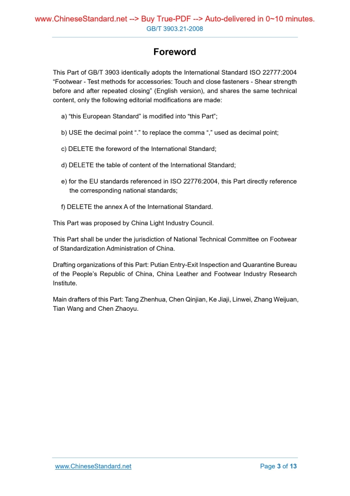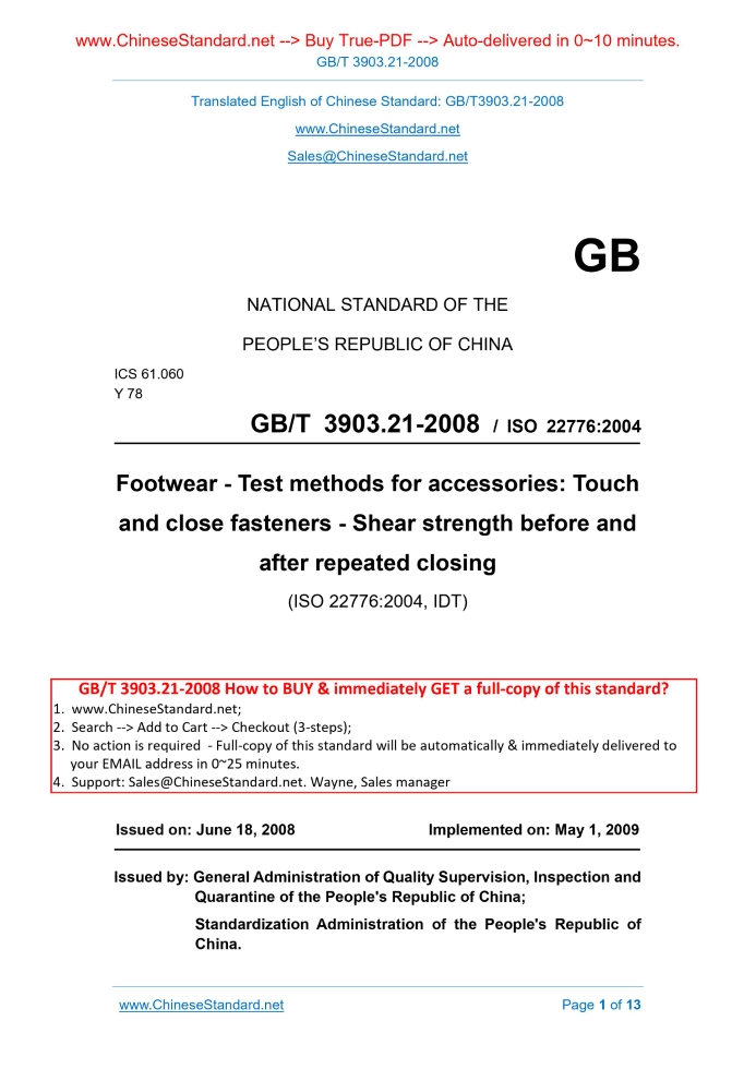 GB/T 3903.21-2008: Footwear -- Test methods for accessories: Touch and close fasteners -- Shear strength before and after repeated closing Delivery: 9 seconds. True-PDF full-copy in English & invoice will be downloaded + auto-delivered via email. See step-by-step procedure Status: Valid