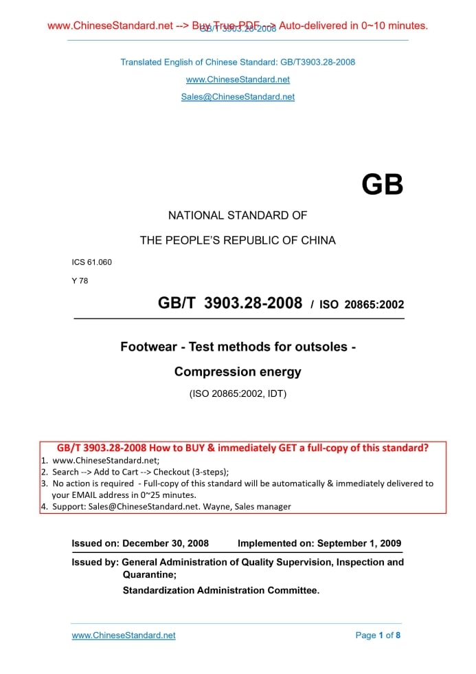 GB/T 3903.28-2008: Footwear -- Test methods for outsoles -- Compression energy Delivery: 9 seconds. True-PDF full-copy in English & invoice will be downloaded + auto-delivered via email. See step-by-step procedure Status: Valid