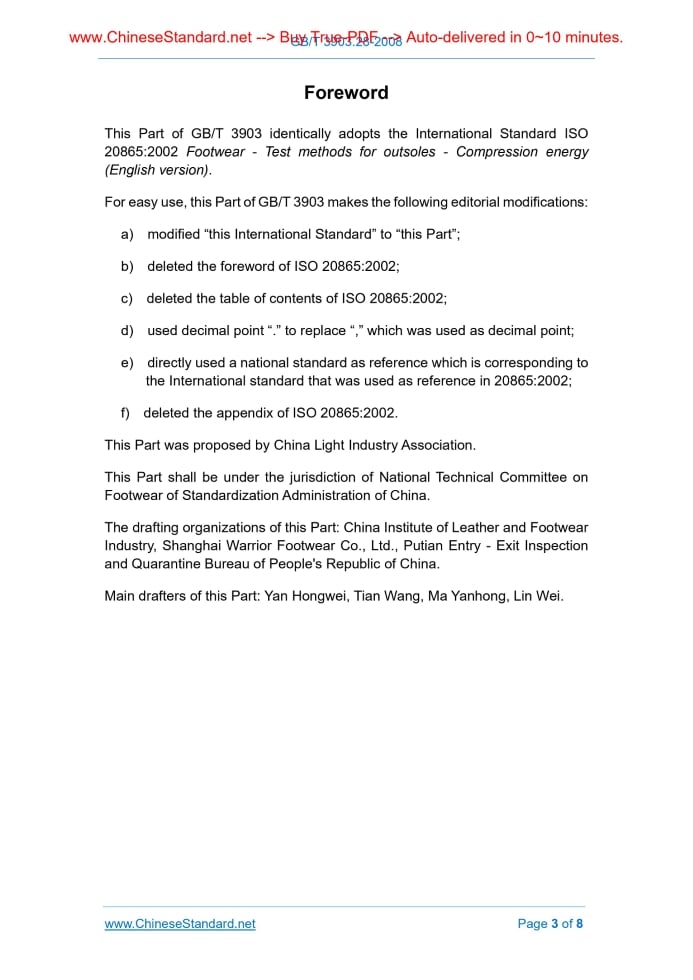 Similar standardsGB/T 3903.28-2008: Footwear -- Test methods for outsoles -- Compression energy---This is an excerpt. Full copy of true-PDF in English version (including equations, symbols, images, flow-chart, tables, and figures etc.), auto-downloaded/delivered in 9 seconds, can be purchased online: https://www.ChineseStandard.net/PDF.aspx/GBT3903.28-2008GB NATIONAL STANDARD OF THE PEOPLE’S REPUBLIC OF CHINA ICS 61.060 Y 78 GB/T 3903.28-2008 / ISO 20865.2002 Footwear - Test methods for outsoles - Compression energy (ISO 20865.2002, IDT) Issued on: DECEMBER 30, 2008 Implemented on: SEPTEMBER 1, 2009 Issued by. General Administration of Quality Supervision, Inspection and Quarantine; Standardization Administration Committee. Table of ContentsForeword ... 3 1 Scope ... 4 2 Normative references ... 4 3 Terms and definitions ... 4 4 Apparatus and material ... 5 5 Sampling and conditioning ... 6 6 Test method ... 6 7 Expression of results ... 6 8 Test report ... 7 Bibliography ... 8ForewordThis Part of GB/T 3903 identically adopts the International Standard ISO 20865.2002 Footwear - Test methods for outsoles - Compression energy (English version). For easy use, this Part of GB/T 3903 makes the following editorial modifications. a) modified “this International Standard” to “this Part”; b) deleted the foreword of ISO 20865.2002; c) deleted the table of contents of ISO 20865.2002; d) used decimal point “.” to replace “,” which was used as decimal point; e) directly used a national standard as reference which is corresponding to the International standard that was used as reference in 20865.2002; f) deleted the appendix of ISO 20865.2002. This Part was proposed by China Light Industry Association. This Part shall be under the jurisdiction of National Technical Committee on Footwear of Standardization Administration of China. The drafting organizations of this Part. China Institute of Leather and Footwear Industry, Shanghai Warrior Footwear Co., Ltd., Putian Entry - Exit Inspection and Quarantine Bureau of People's Republic of China. Main drafters of this Part. Yan Hongwei, Tian Wang, Ma Yanhong, Lin Wei. Footwear - Test methods for outsoles - Compression energy1 ScopeThis Part of GB/T 3903 specifies a method for the determination of the compression energy of outsoles. This Part is applicable to outsoles irrespective of the material.2 Normative referencesThe following standards contain the provisions which, through reference in this Part of GB/T 3903, constitute the provisions of this Part. For dated references, subsequent amendments (excluding corrections) or revisions do not apply to this Part. However, the parties who enter into agreement based on this Part are encouraged to investigate whether the latest versions of these documents are applicable. For undated reference documents, the latest versions apply to this Part. GB/T 17200 Technical specification for tensile compression and flexural testing machines for rubber and plastics (constant rate of drive) (GB/T 17200-2008, ISO 5893.2002, IDT) GB/T 22049 Footwear - Standard atmospheres for conditioning and testing of footwear and components for footwear (GB/T 22049-2008, ISO 18454.2001, IDT); GB/T 22050 Footwear - Sampling location preparation and duration of conditioning of samples and test pieces (GB/T 22050-2008, ISO 17709.2004, IDT)3 Terms and definitionsFor the purposes of this Part of GB/T 3903, the following terms and definitions apply. 3.1 compression energy ......Source: Above contents are excerpted from the full-copy PDF -- translated/reviewed by: www.ChineseStandard.net / Wayne Zheng et al. Tips & Frequently Asked Questions:Question 1: How long will the true-PDF of English version of GB/T 3903.28-2008 be delivered?Answer: The full copy PDF of English version of GB/T 3903.28-2008 can be downloaded in 9 seconds, and it will also be emailed to you in 9 seconds (double mechanisms to ensure the delivery reliably), with PDF-invoice.Question 2: Can I share the purchased PDF of GB/T 3903.28-2008_English with my colleagues?Answer: Yes. The purchased PDF of GB/T 3903.28-2008_English will be deemed to be sold to your employer/organization who actually paid for it, including your colleagues and your employer's intranet.Question 3: Does the price include tax/VAT?Answer: Yes. Our tax invoice, downloaded/delivered in 9 seconds, includes all tax/VAT and complies with 100+ countries' tax regulations (tax exempted in 100+ countries) -- See Avoidance of Double Taxation Agreements (DTAs): List of DTAs signed between Singapore and 100+ countriesQuestion 4: Do you accept my currency other than USD?Answer: Yes. www.ChineseStandard.us -- GB/T 3903.28-2008 -- Click this link and select your country/currency to pay, the exact amount in your currency will be printed on the invoice. Full PDF will also be downloaded/emailed in 9 seconds.How to buy and download a true PDF of English version of GB/T 3903.28-2008?A step-by-step guide to download PDF of GB/T 3903.28-2008_EnglishStep 1: Visit website https://www.ChineseStandard.net (Pay in USD), or https://www.ChineseStandard.us (Pay in any currencies such as Euro, KRW, JPY, AUD).Step 2: Search keyword "GB/T 3903.28-2008". Step 3: Click "Add to Cart". If multiple PDFs are required, repeat steps 2 and 3 to add up to 12 PDFs to cart. Step 4: Select payment option (Via payment agents Stripe or PayPal). Step 5: Customize Tax Invoice -- Fill up your email etc. Step 6: Click "Checkout". Step 7: Make payment by credit card, PayPal, Google Pay etc. After the payment is completed and in 9 seconds, you will receive 2 emails attached with the purchased PDFs and PDF-invoice, respectively. Step 8: Optional -- Go to download PDF. Step 9: Optional -- Click Open/Download PDF to download PDFs and invoice. See screenshots for above steps: Steps 1~3 Steps 4~6 Step 7 Step 8 Step 9 |